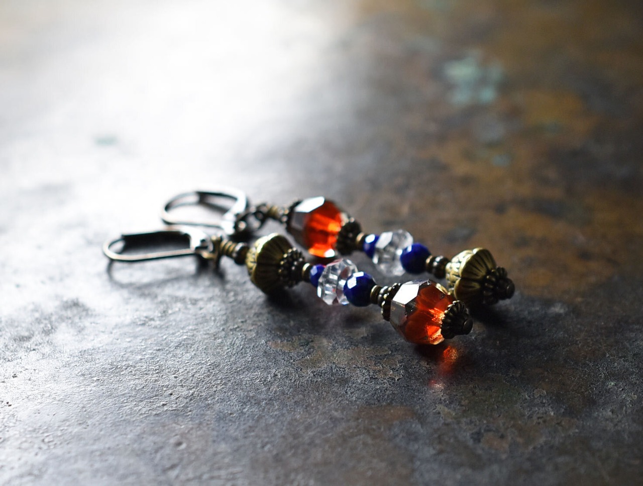ヴィンテージビーズとラピス、クリアビーズ、蓮華ブラスのアンシメトリーピアス