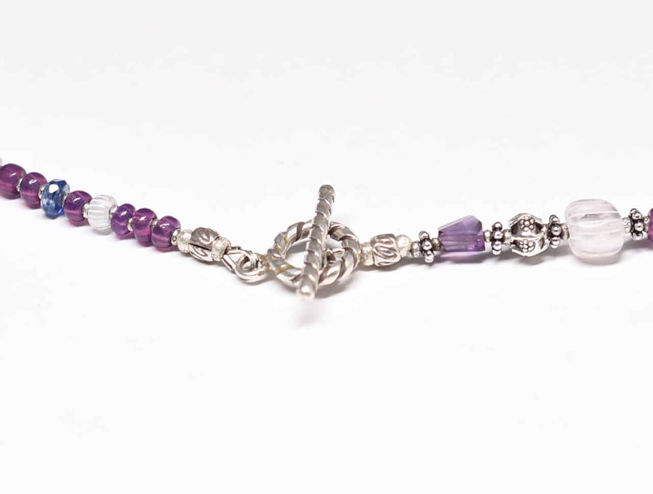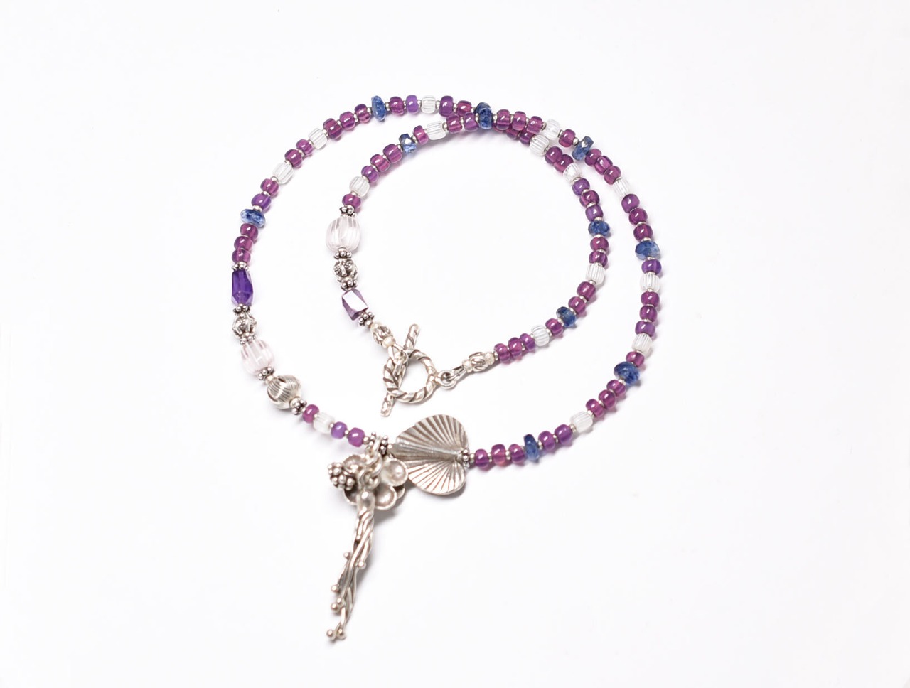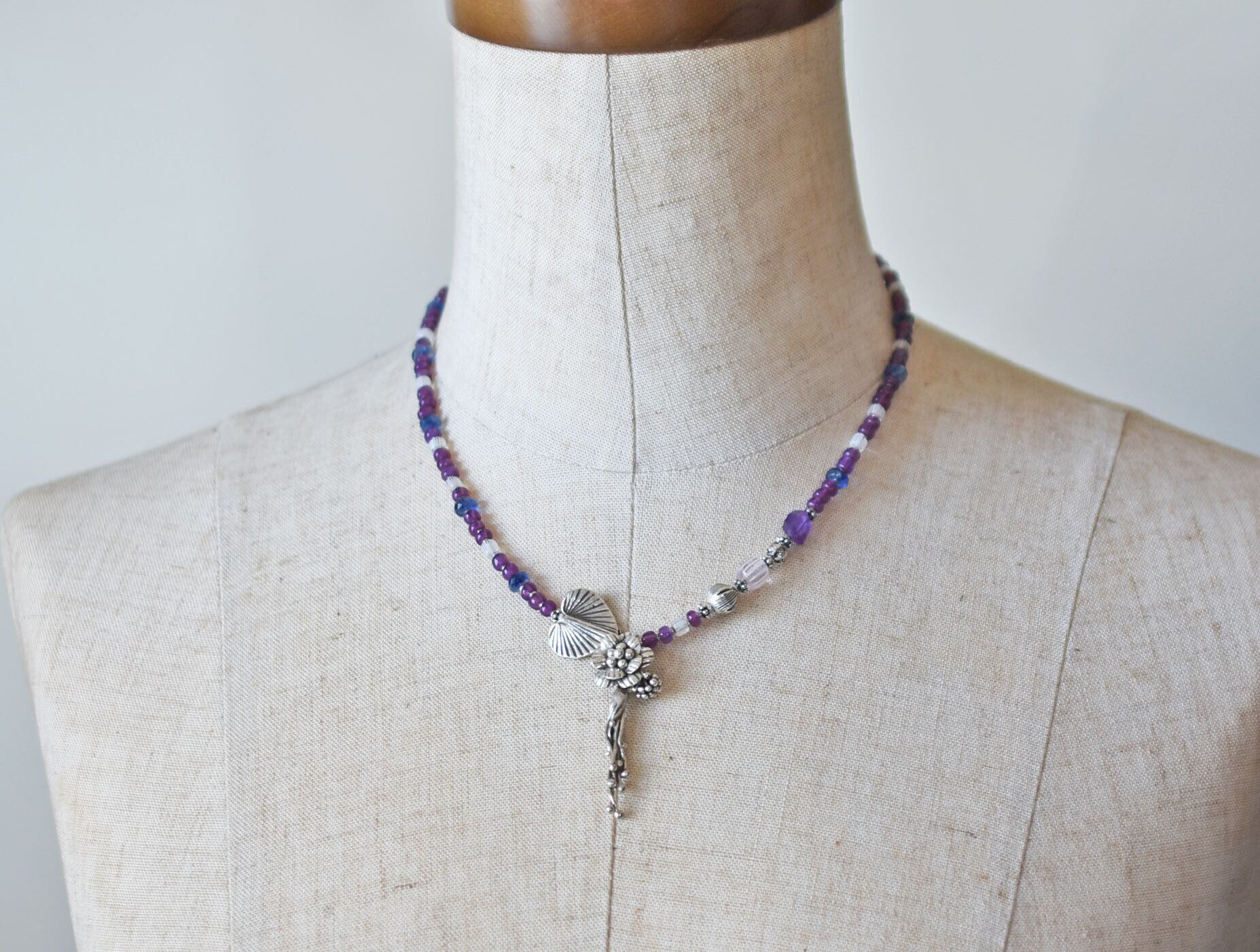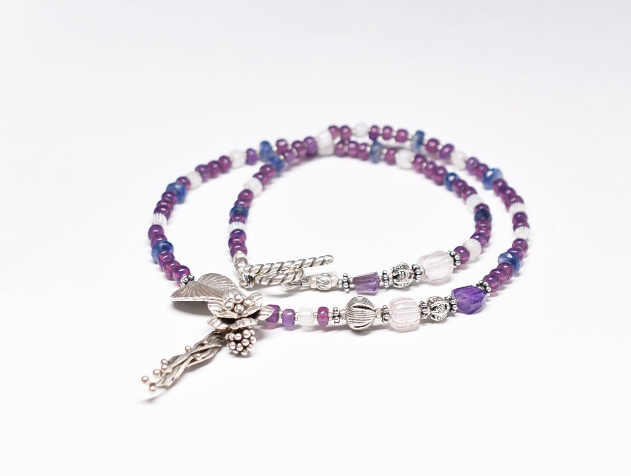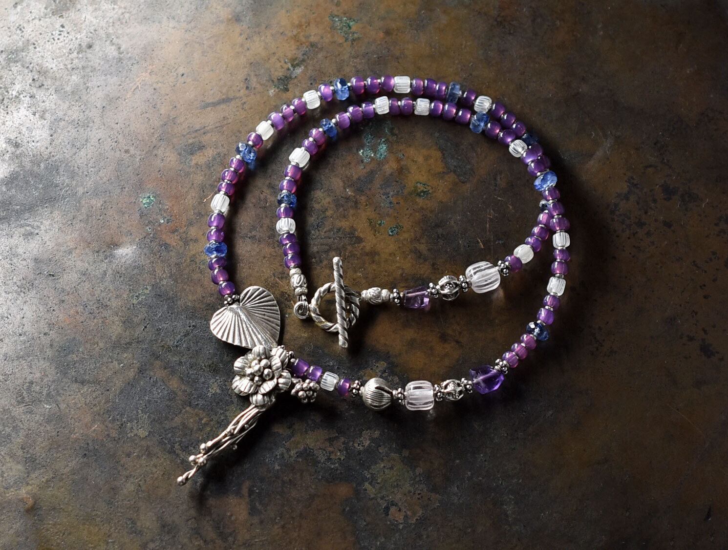 ボタニカルなカレンシルバー、アメジスト、グーズベリー、すみれフランスヴィンテージビーズ、カイヤナイトのネックレス