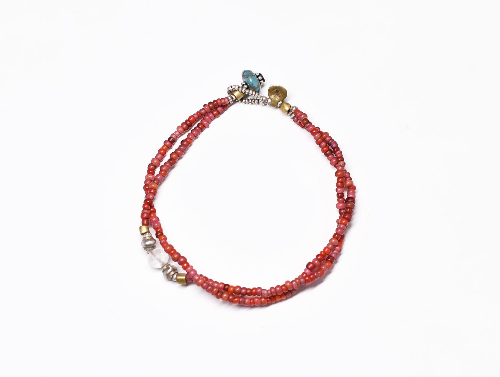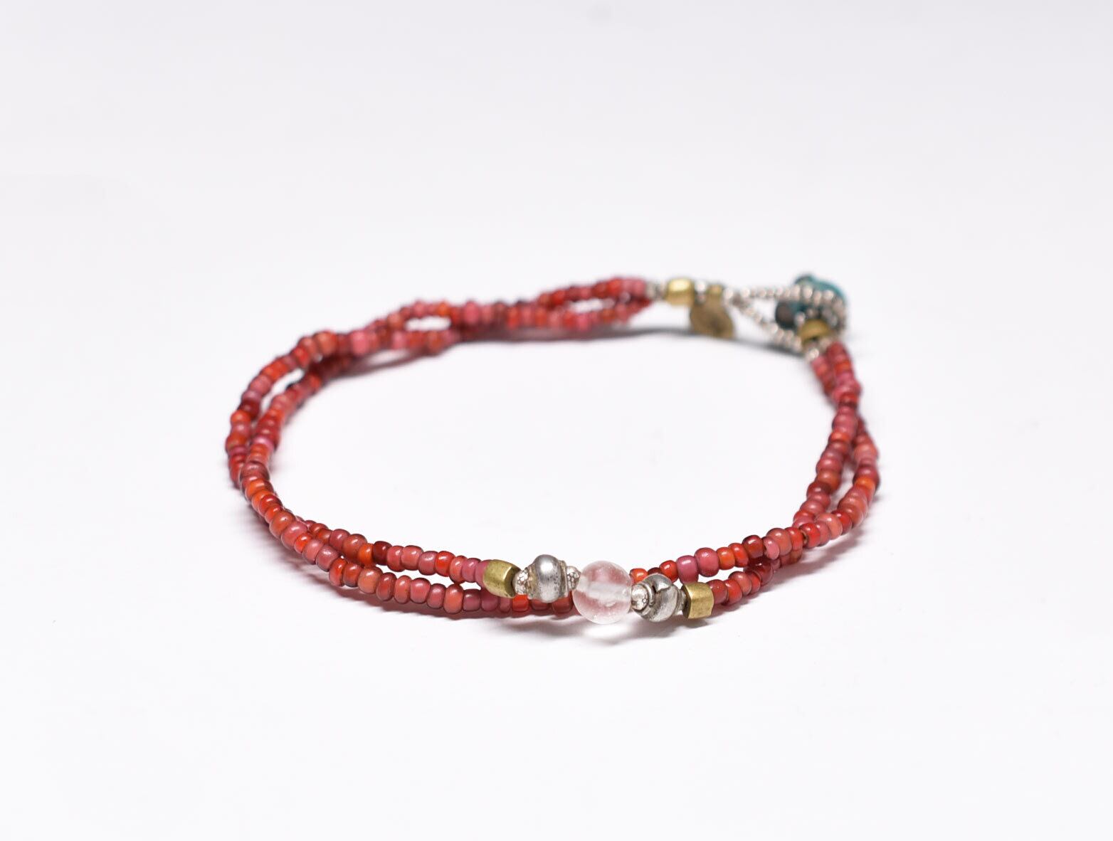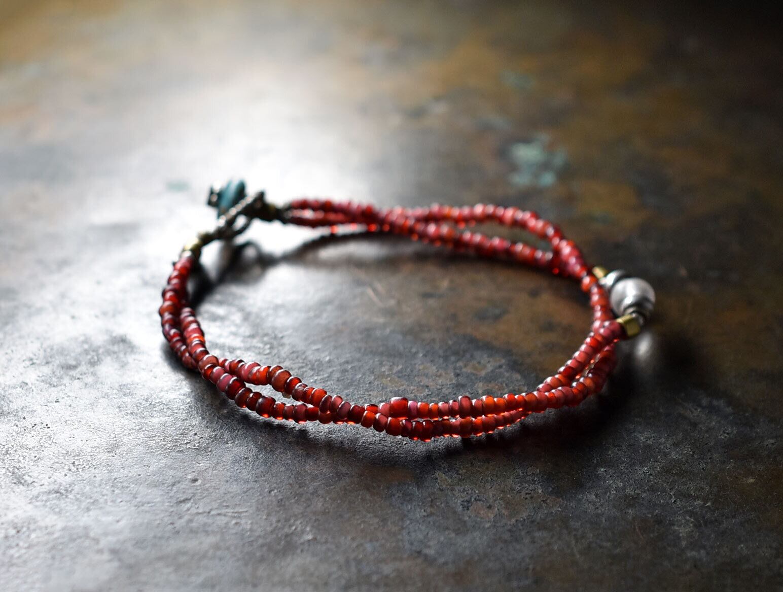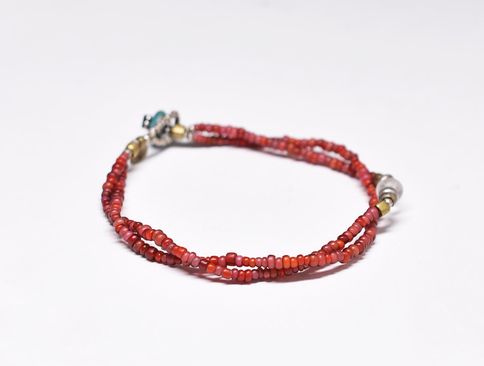 赤色のビーズはホワイトハーツと呼ばれるアンティークビーズです。芯(ハート)部分が白いことからこう呼ばれています。こちらは19~20世紀頃のベネチア産のビーズです。