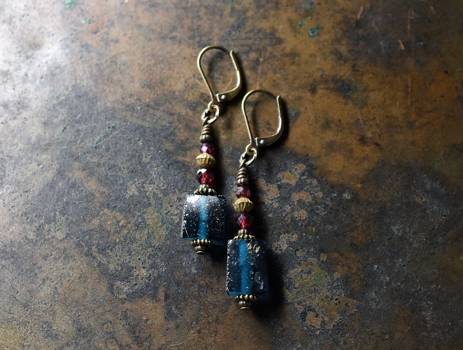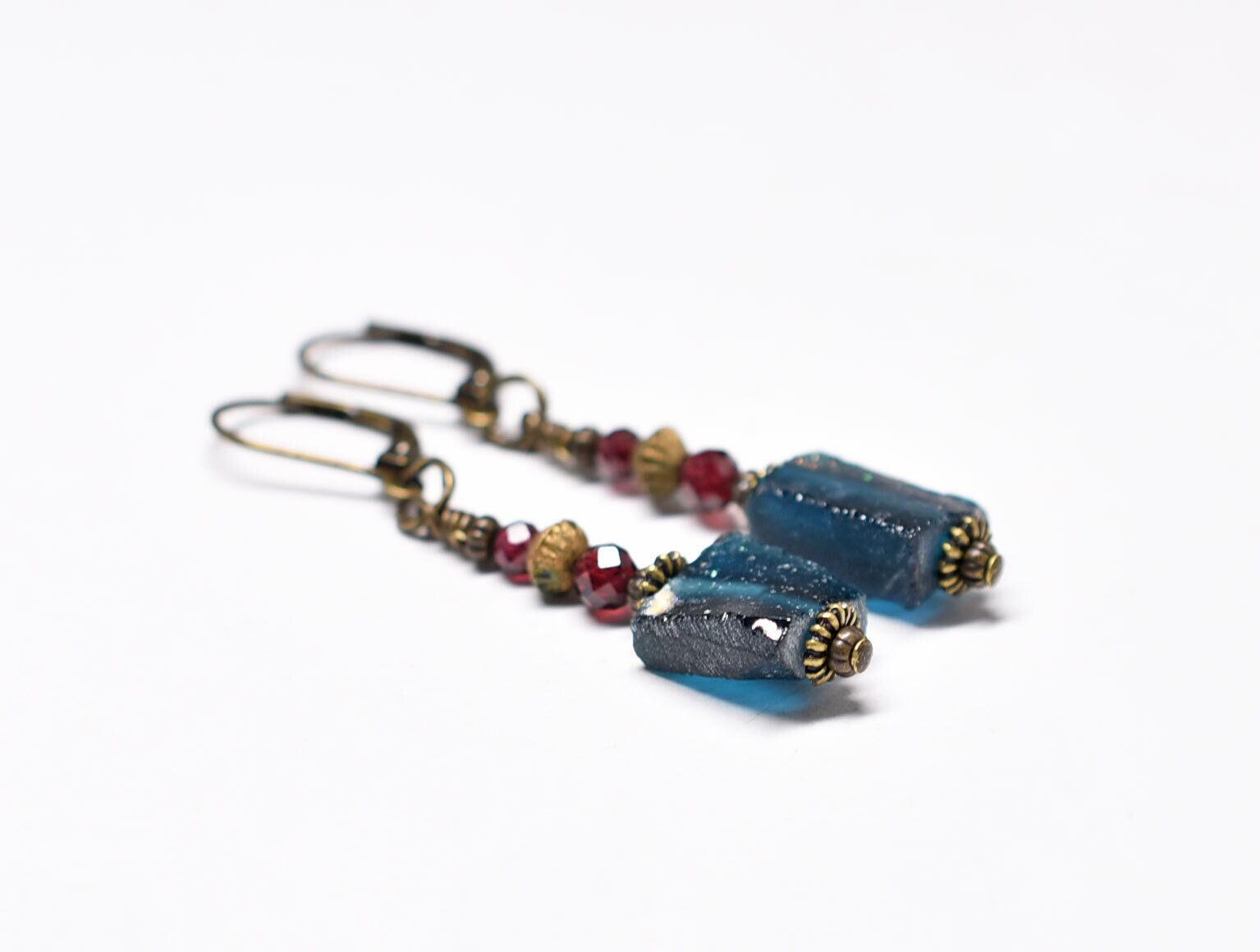 薄っすら銀化のブルーグリーンローマングラスとガーネット、ブラスビーズを繋いだピアスです。