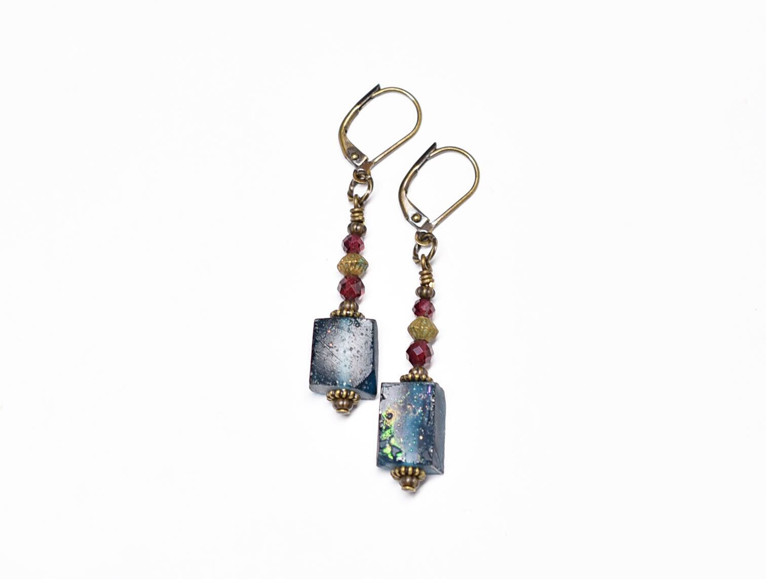 薄っすら銀化のブルーグリーンローマングラスとガーネット、ブラスビーズのピアス