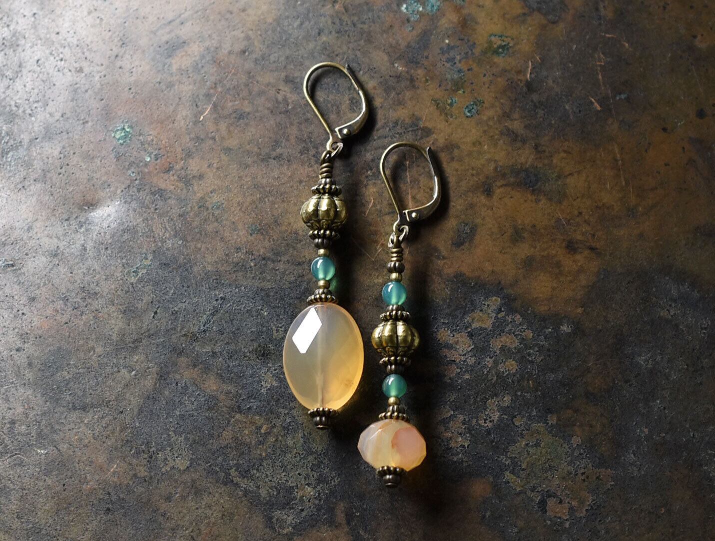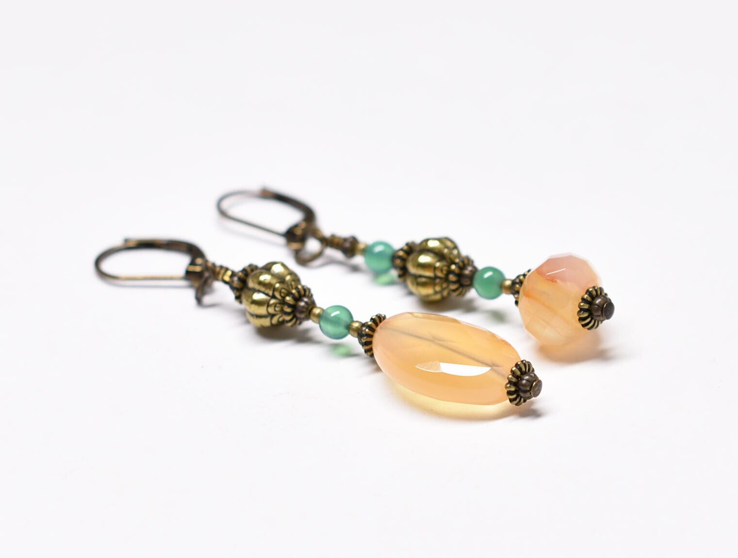 淡いアプリコットカーネリアンとグリーン瑪瑙、蓮華&手毬ブラスのアンシメトリーピアス