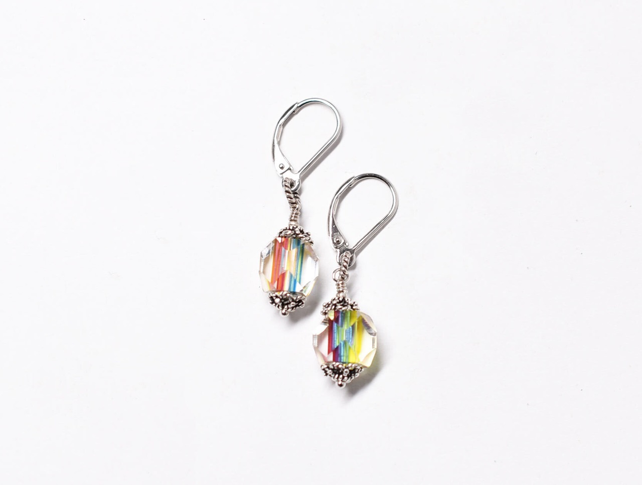 透明なガラスにピンク、イエロー、ブルーが線状に内包されています。