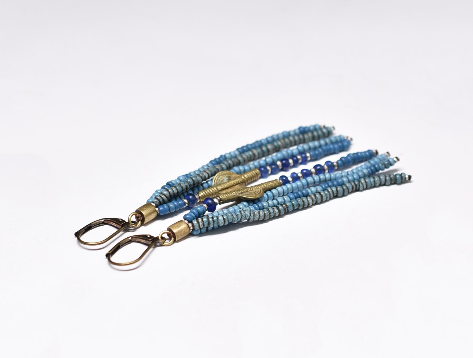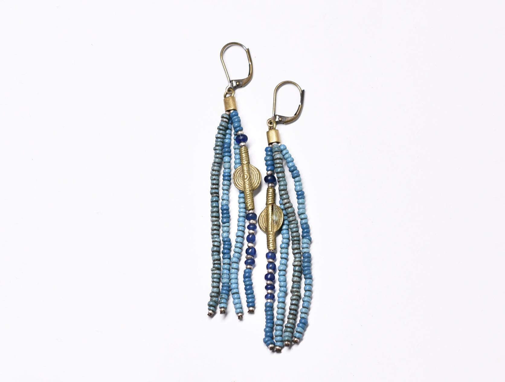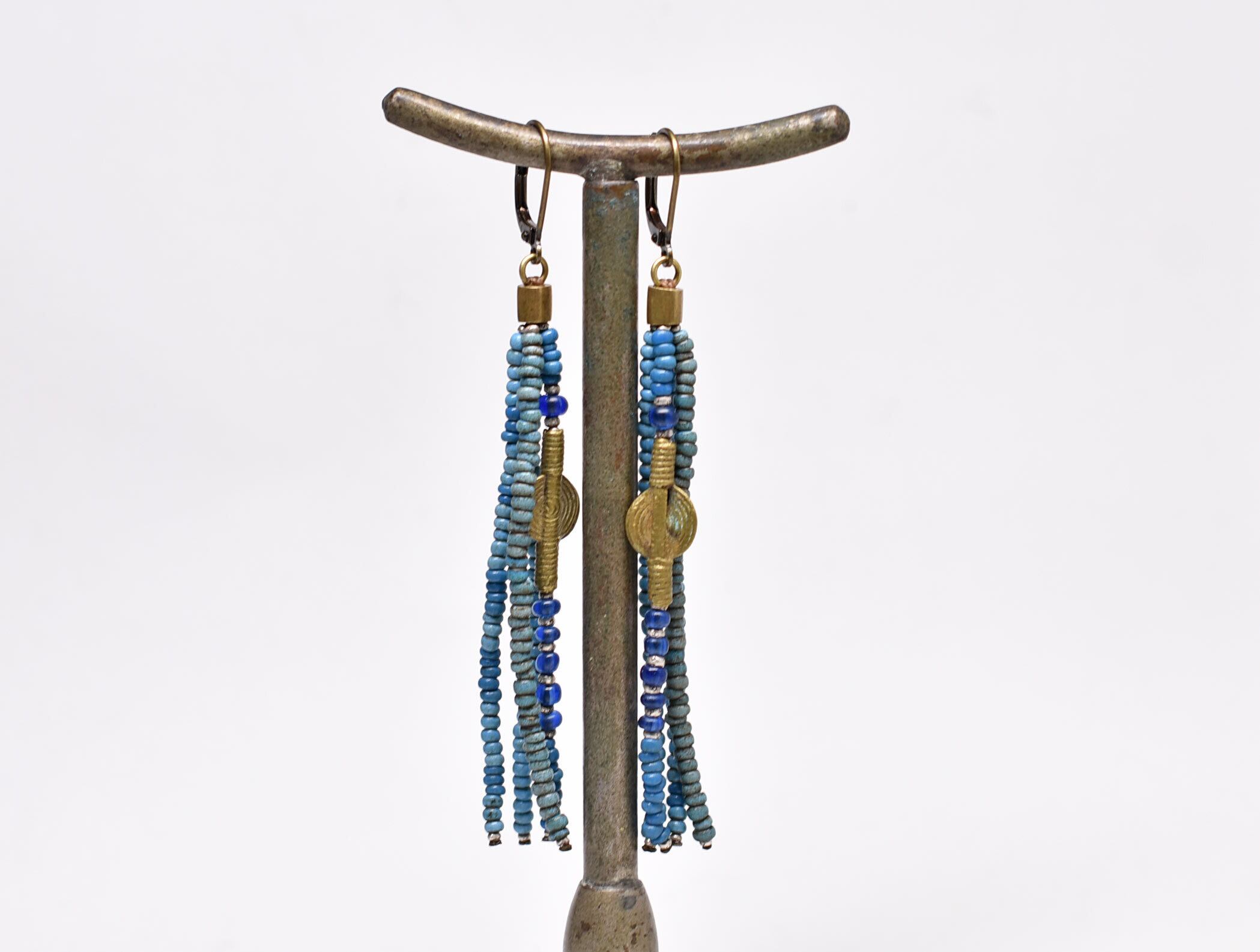 アフリカンブラスと様々な寒色系ブルーシードビーズを繋いだ4連のピアスです。