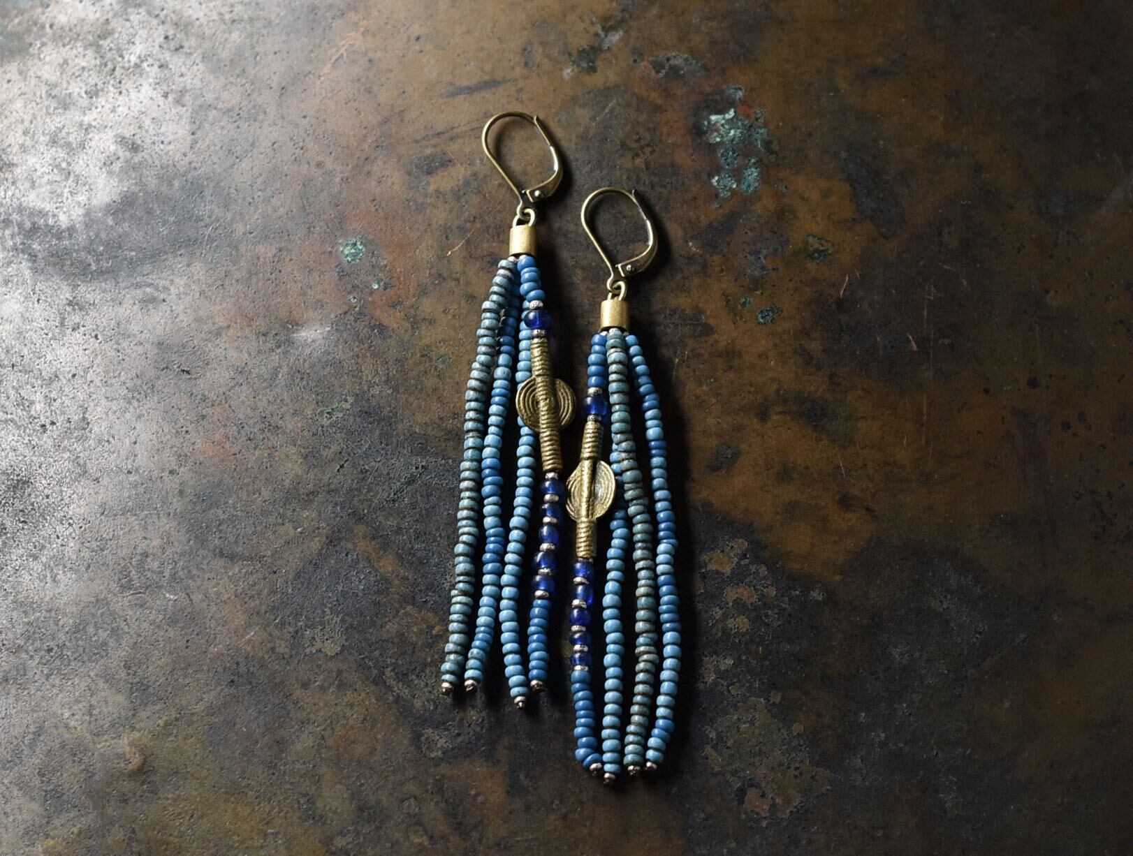 アフリカンブラスと多彩ブルーシードビーズの4連ピアス