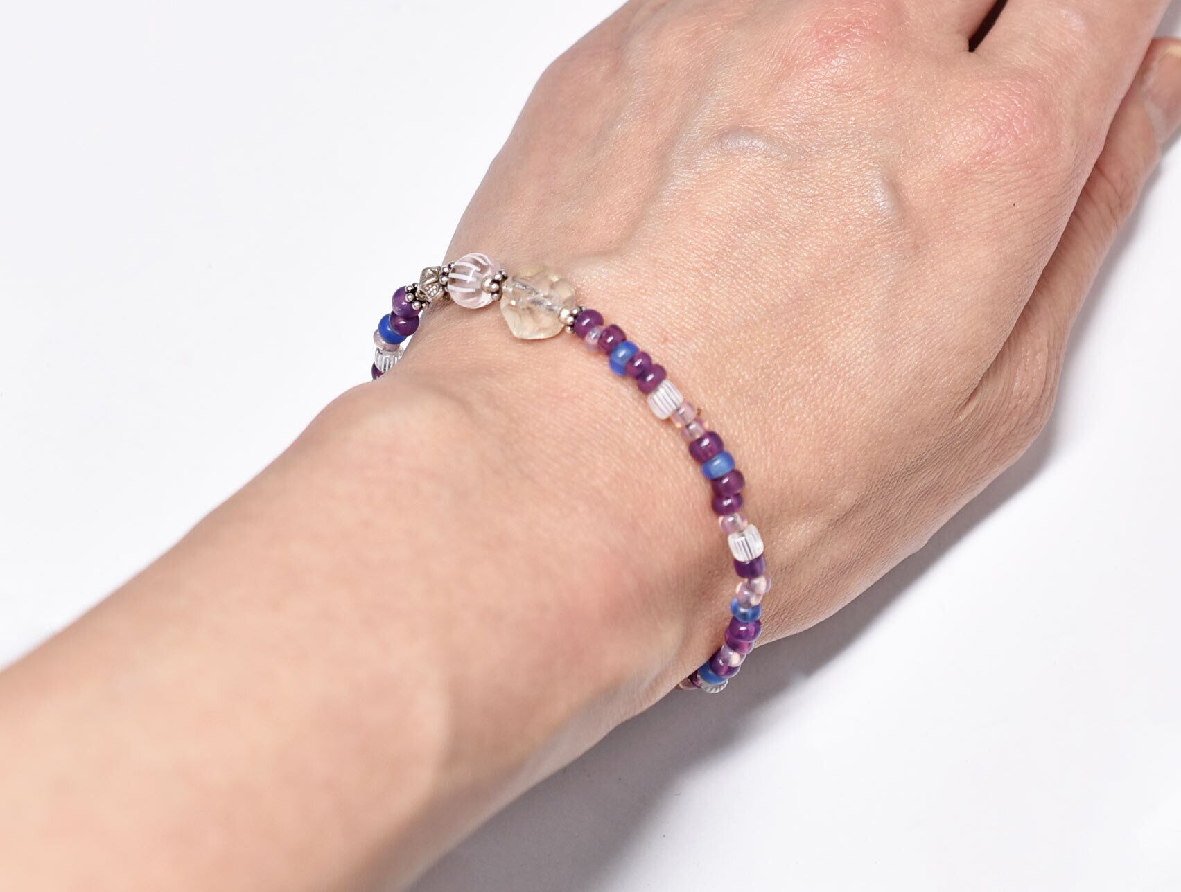 ヴィンテージオーロラビーズとカレンシルバー、グーズベリー、すみれ色&勿忘草色&桃色ビーズを繋いだブレスです。