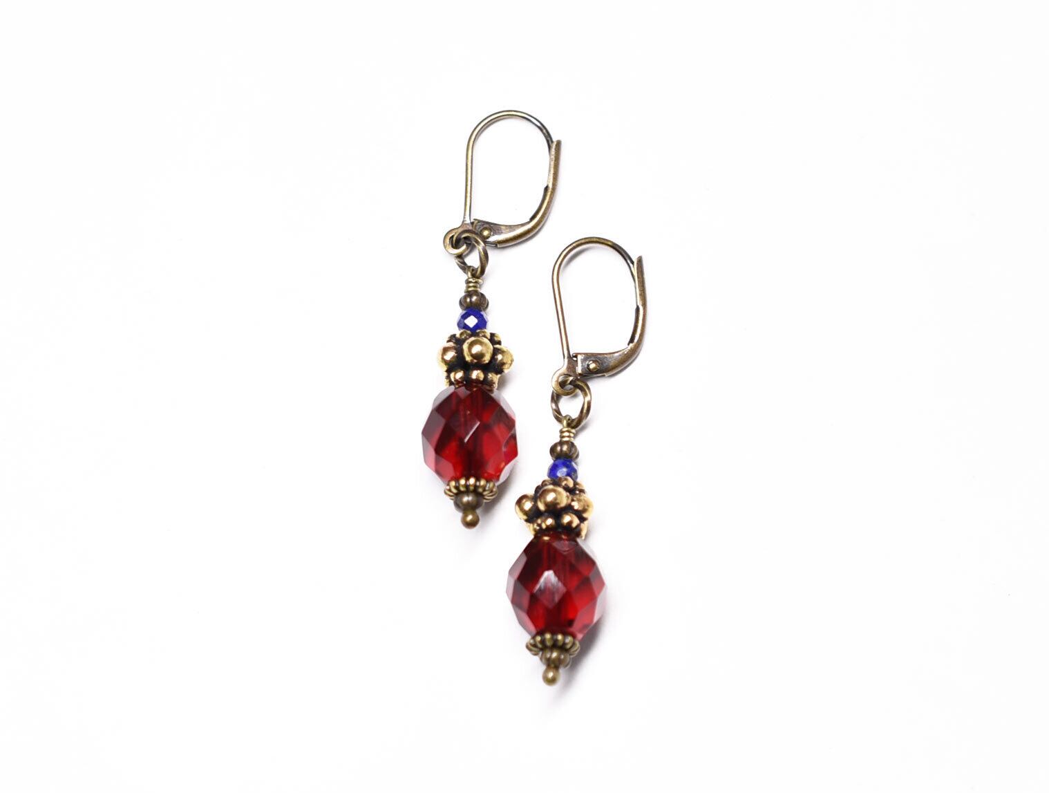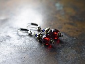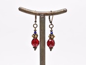 深紅チェコビーズとぷっくりブラスビーズ、ラピスのピアス