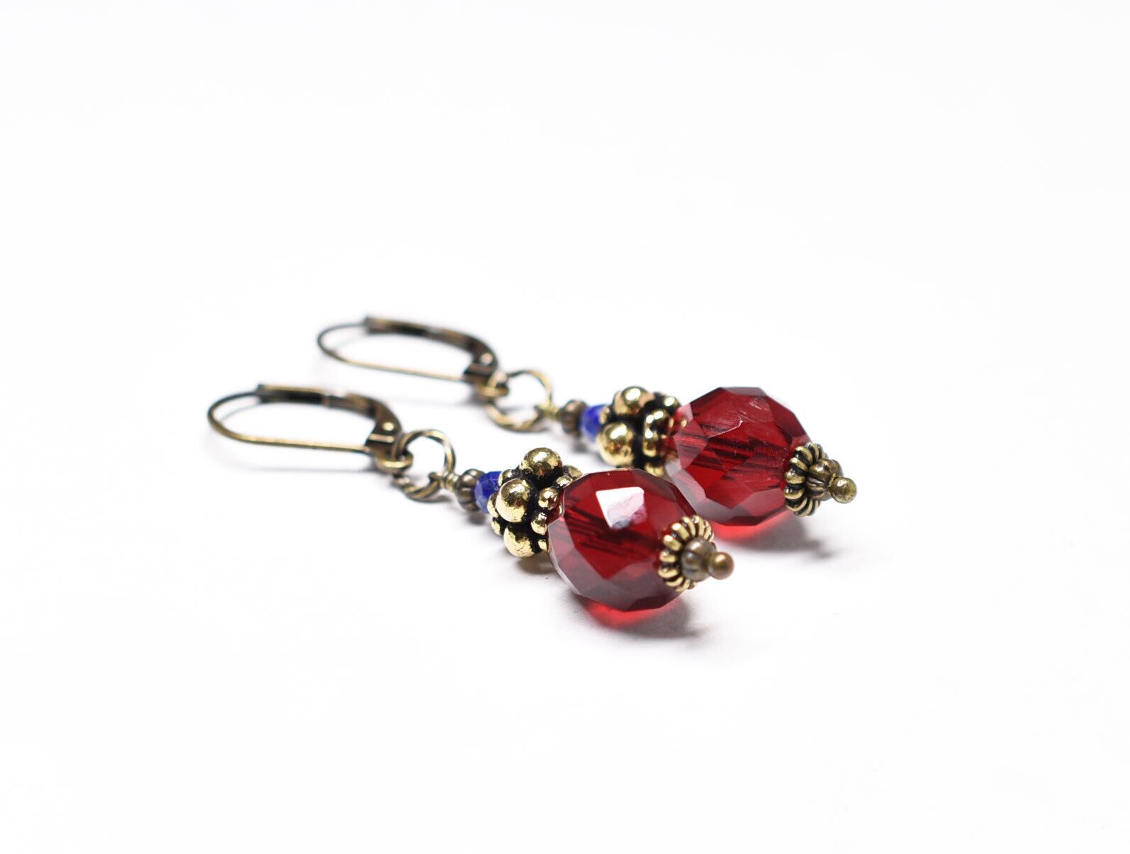 深紅チェコビーズとぷっくりブラスビーズ、ラピスを繋いだピアスです。