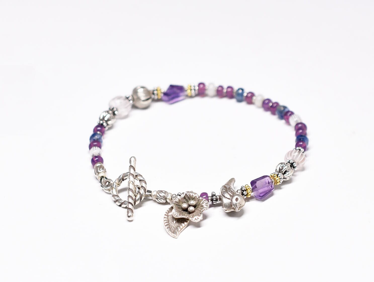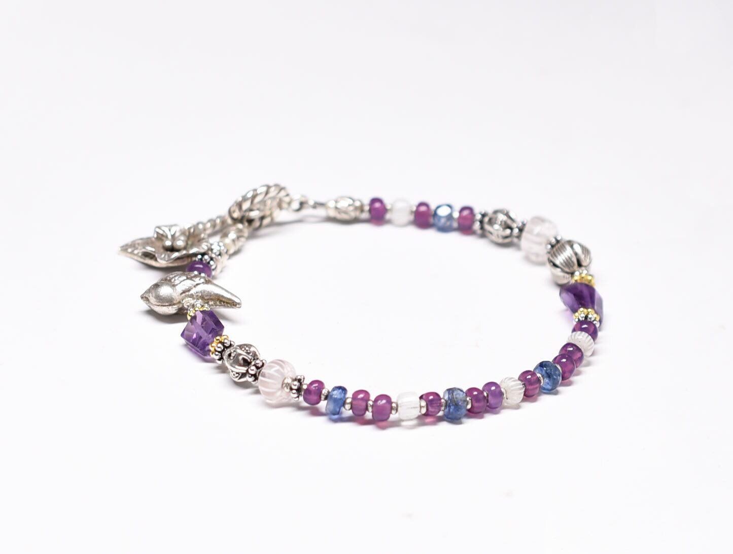 アメジストと小鳥などのカレンシルバー、グーズベリー、すみれ色フランスヴィンテージビーズ、カイヤナイトを繋いだブレスです。