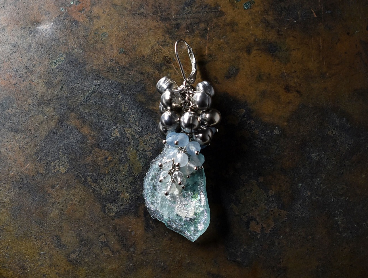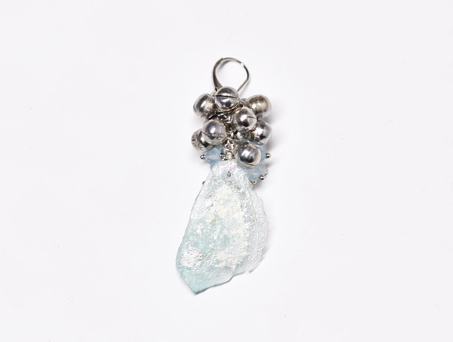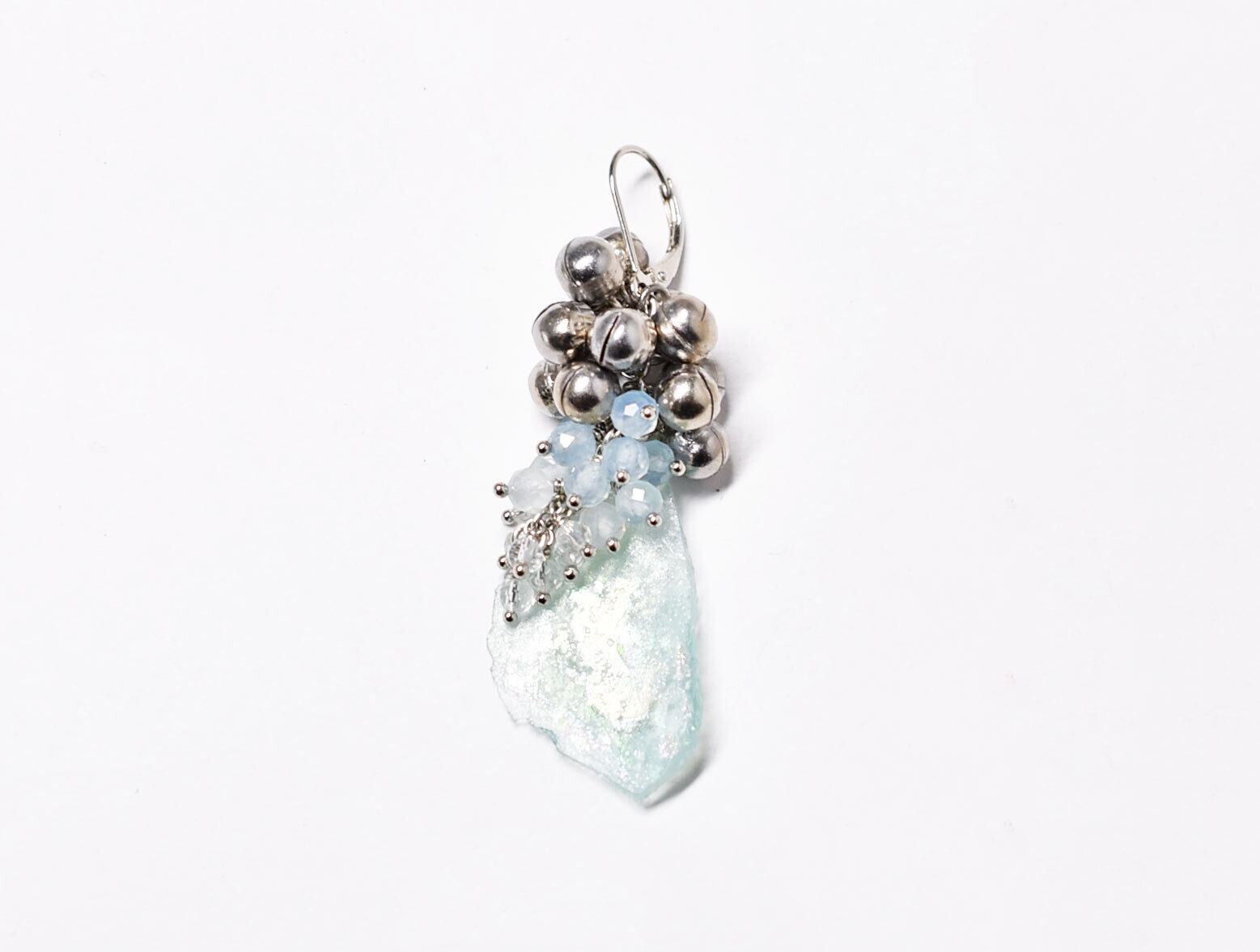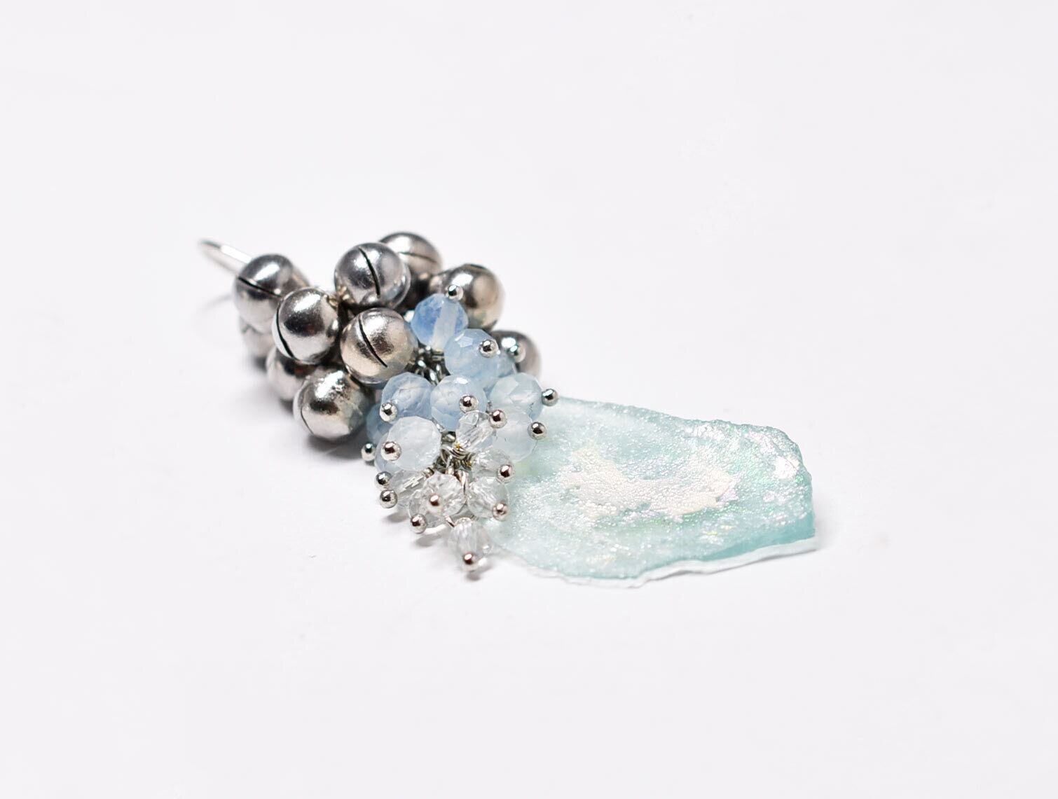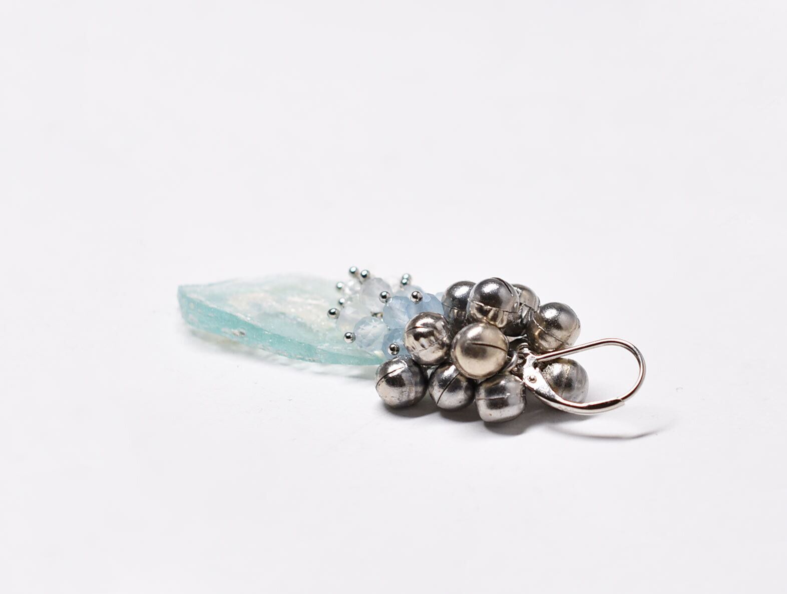 ソーダブルー銀化ローマングラスとたわわなアクアマリン&クォーツ、鈴を繋いだ片耳のピアスです。