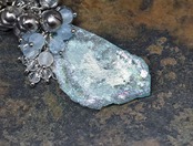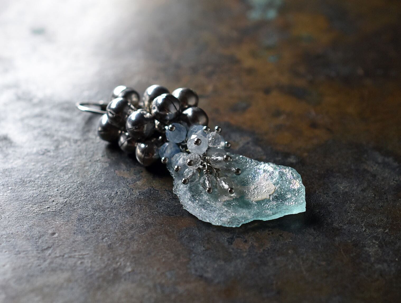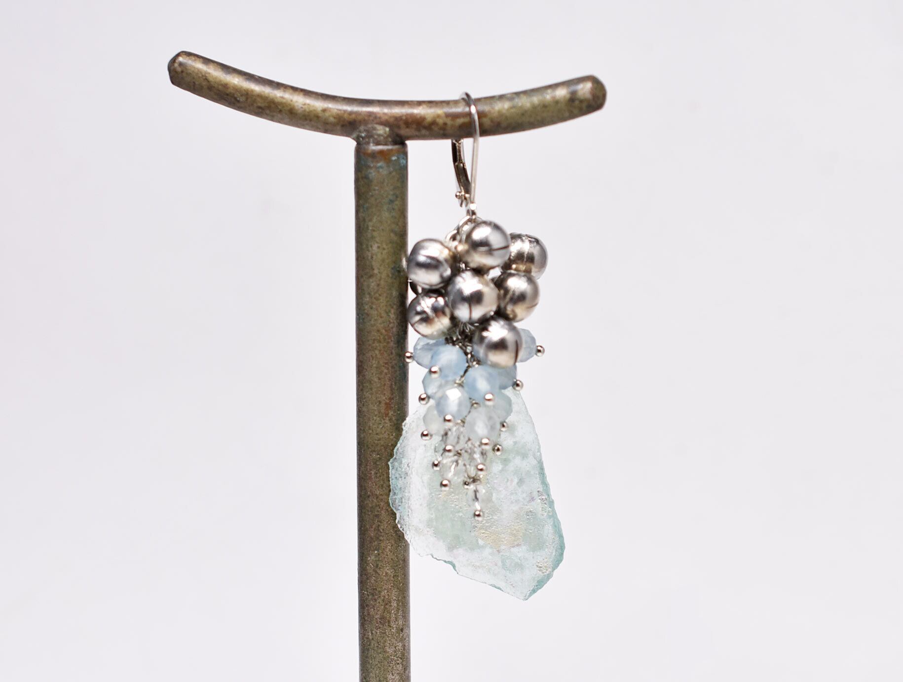 ソーダブルー銀化ローマングラスとたわわなアクアマリン&クォーツ、鈴の片耳ピアス