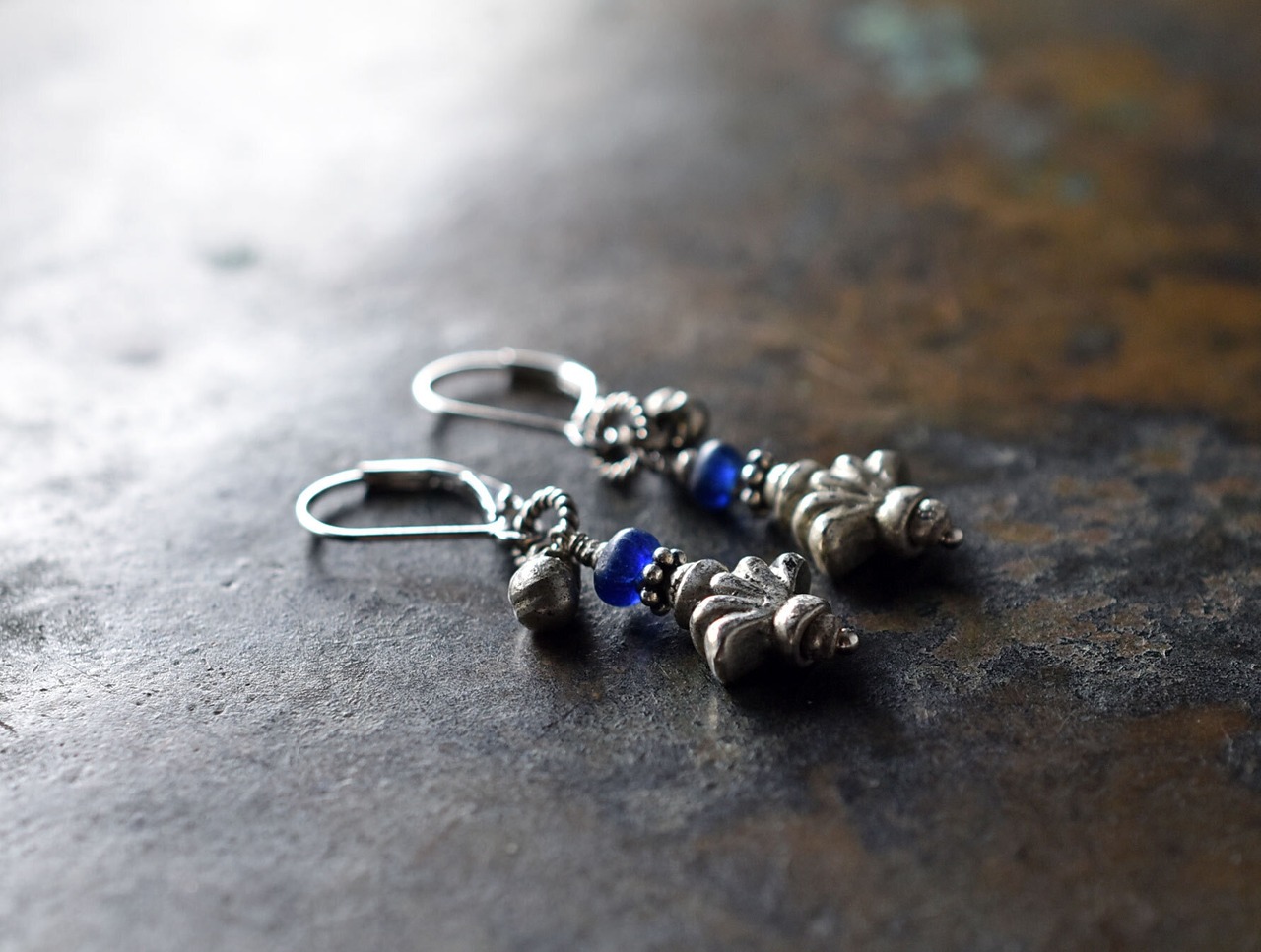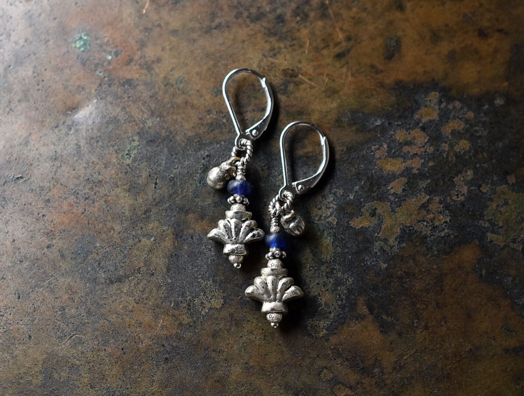 百合インドピューター繊細細工パーツとブルーアンティークビーズ、民族鈴のピアス