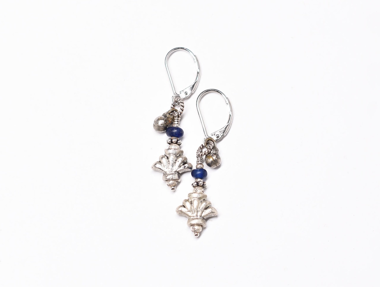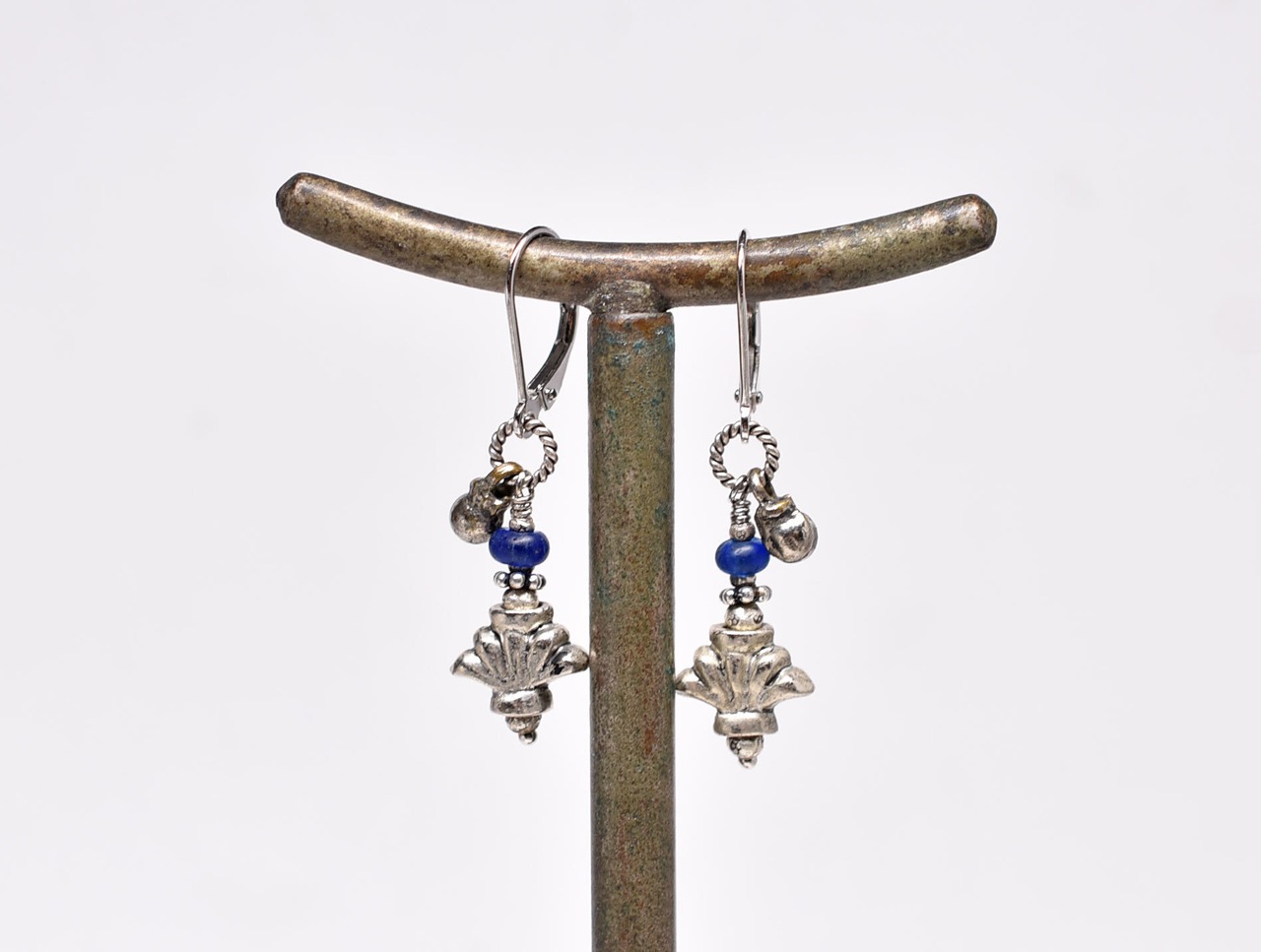 百合インドピューター繊細細工パーツとブルーアンティークビーズ、民族鈴を繋いだピアスです。