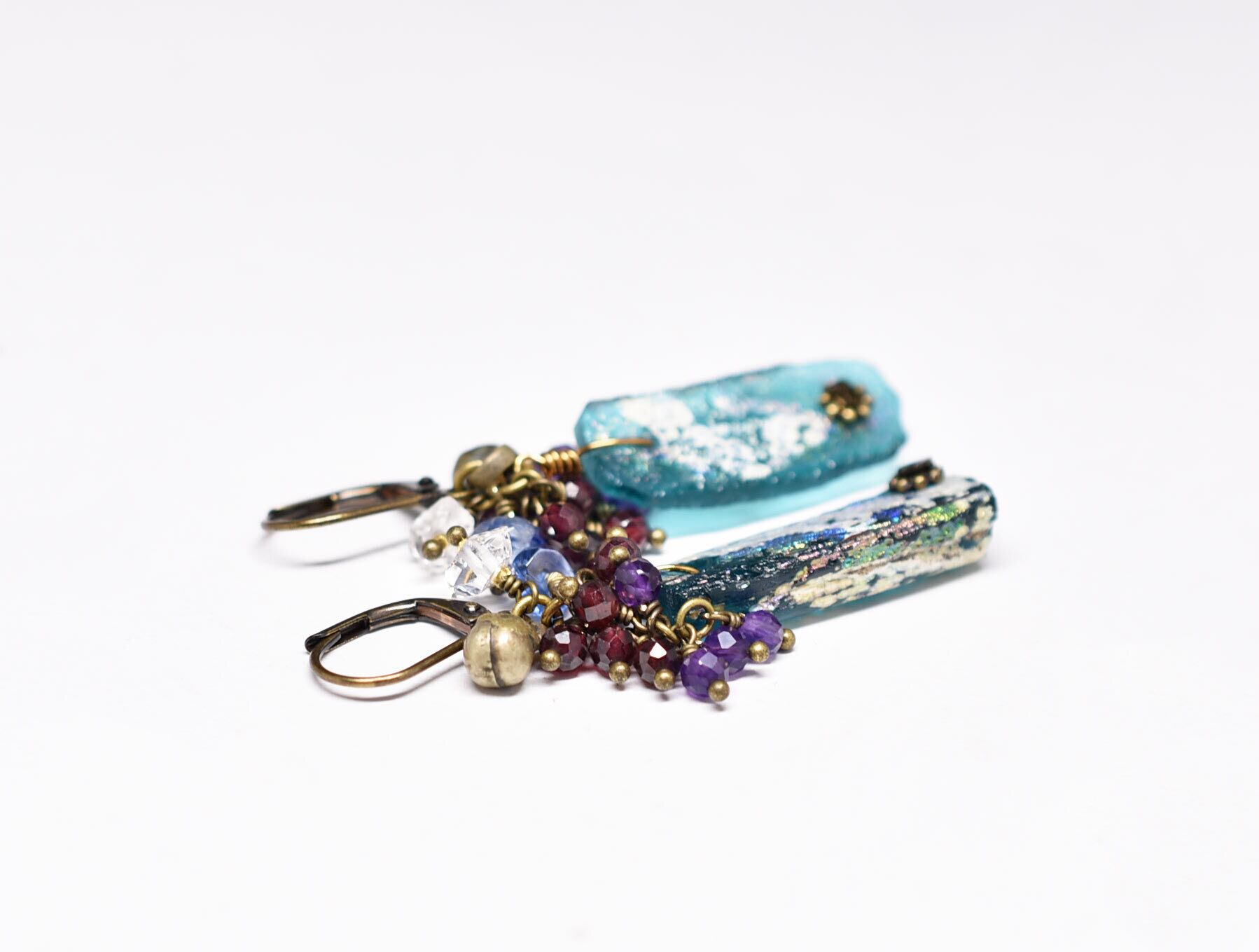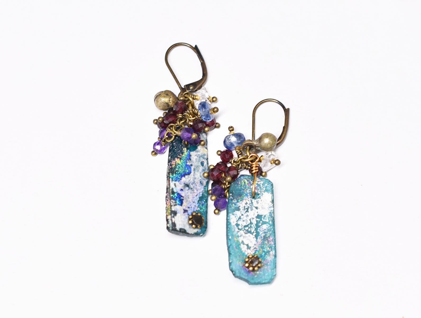 ブルーグリーン銀化ローマングラスと、たわわなガーネット&アメジスト、カイヤナイト、ハーキマーダイヤモンド、民族鈴を繋いだピアスです。