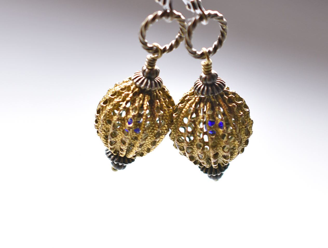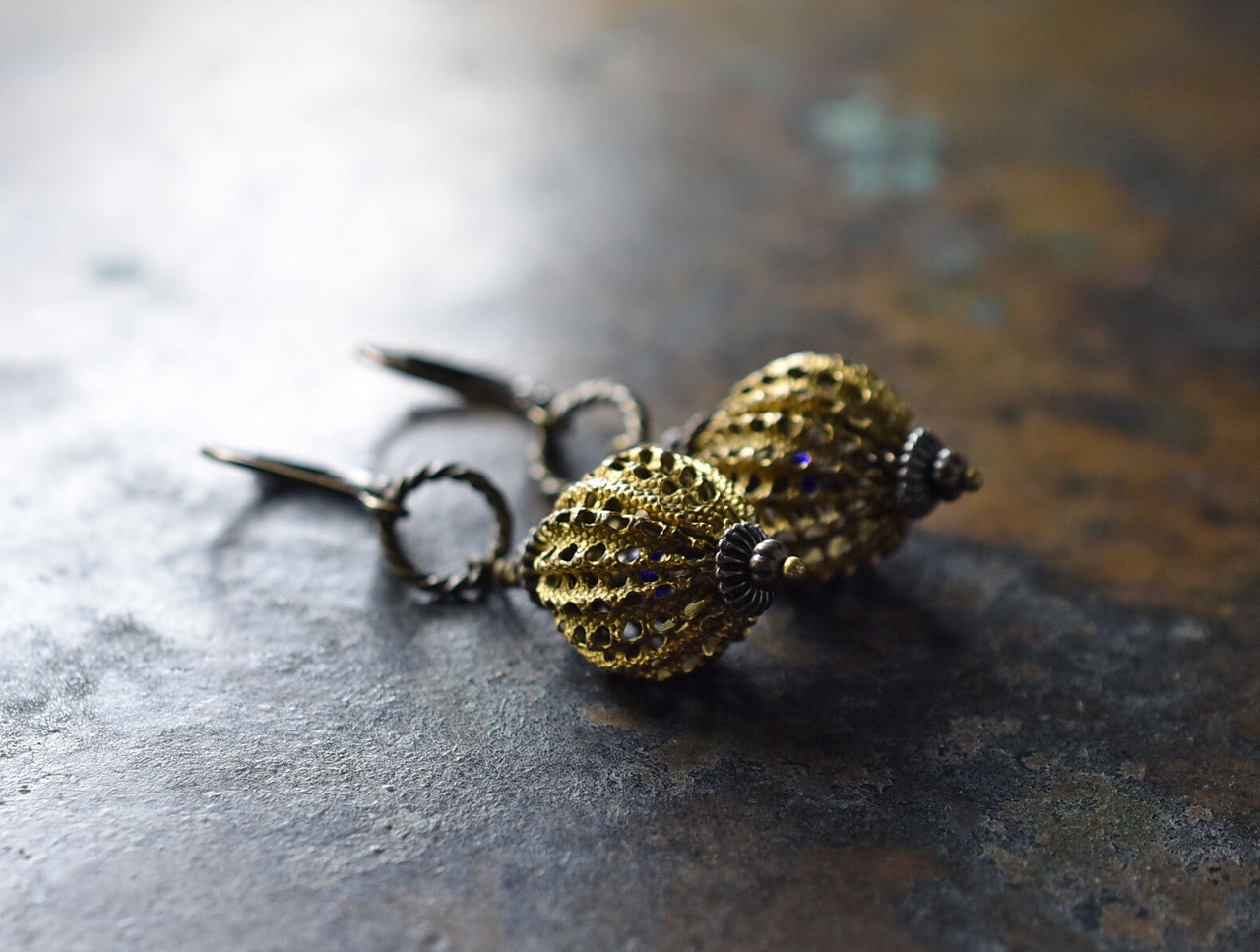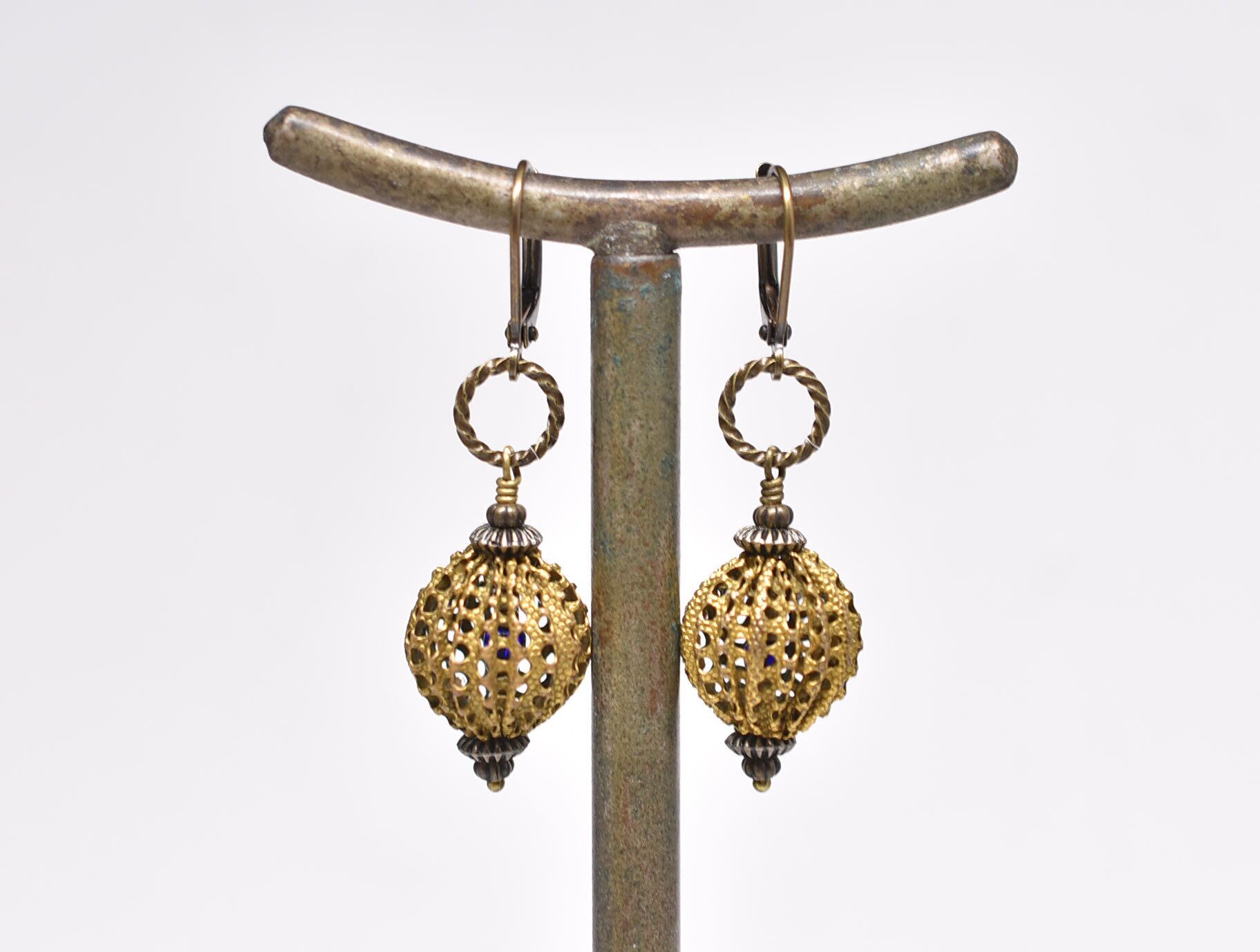 ブラスビーズの内部には、ブルーのヴェネチアアンティークビーズを一粒忍ばせました。