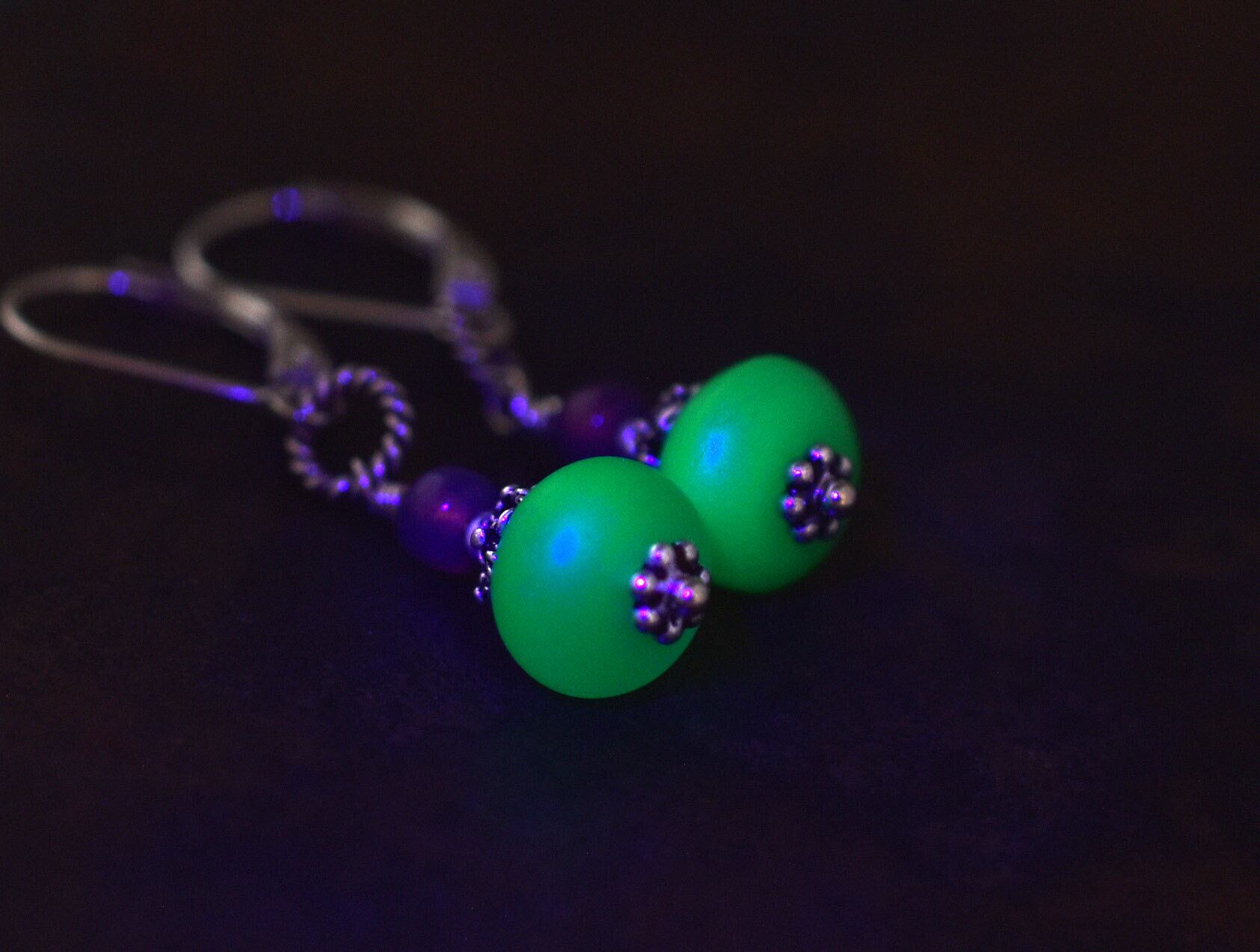 独特な乳白色のセミクリアグリーンのビーズは、極々微量のウランで発色させています。ブラックライトを当てると光ります!