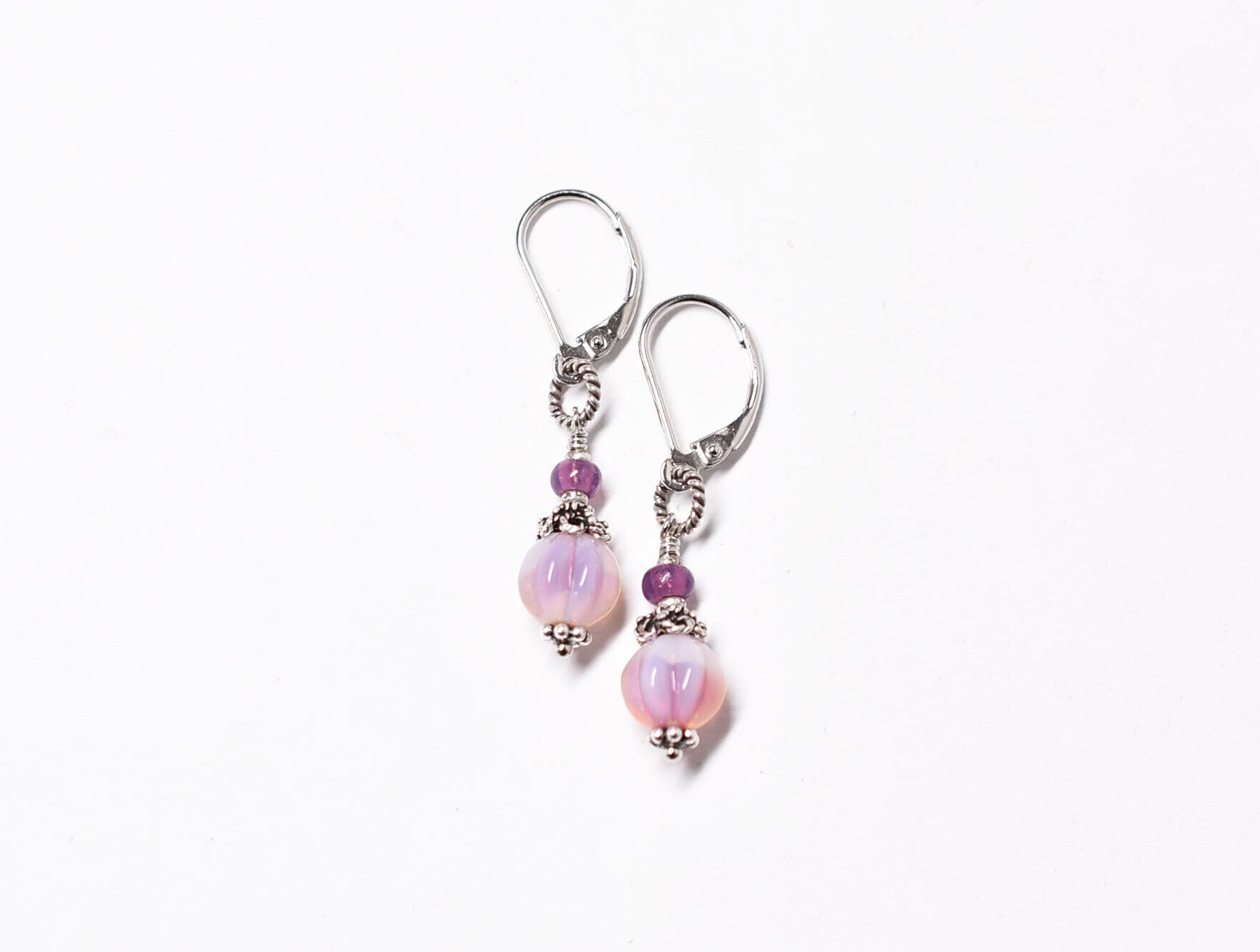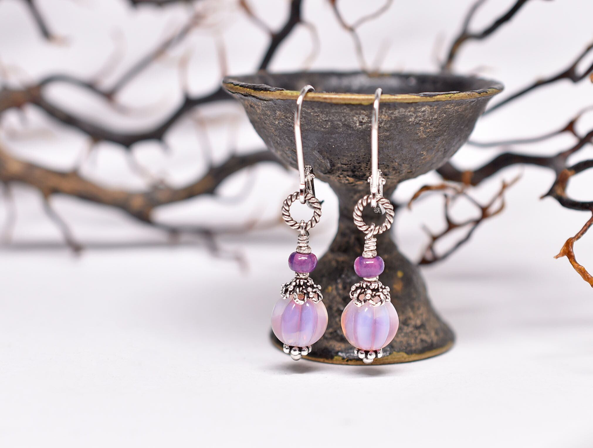 アンティークオパールガラスとすみれ色フランスヴィンテージビーズのピアス