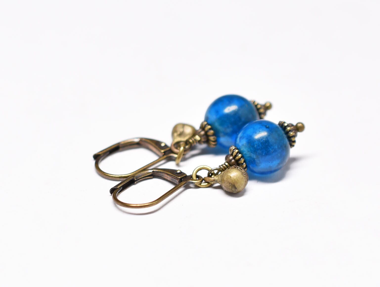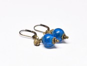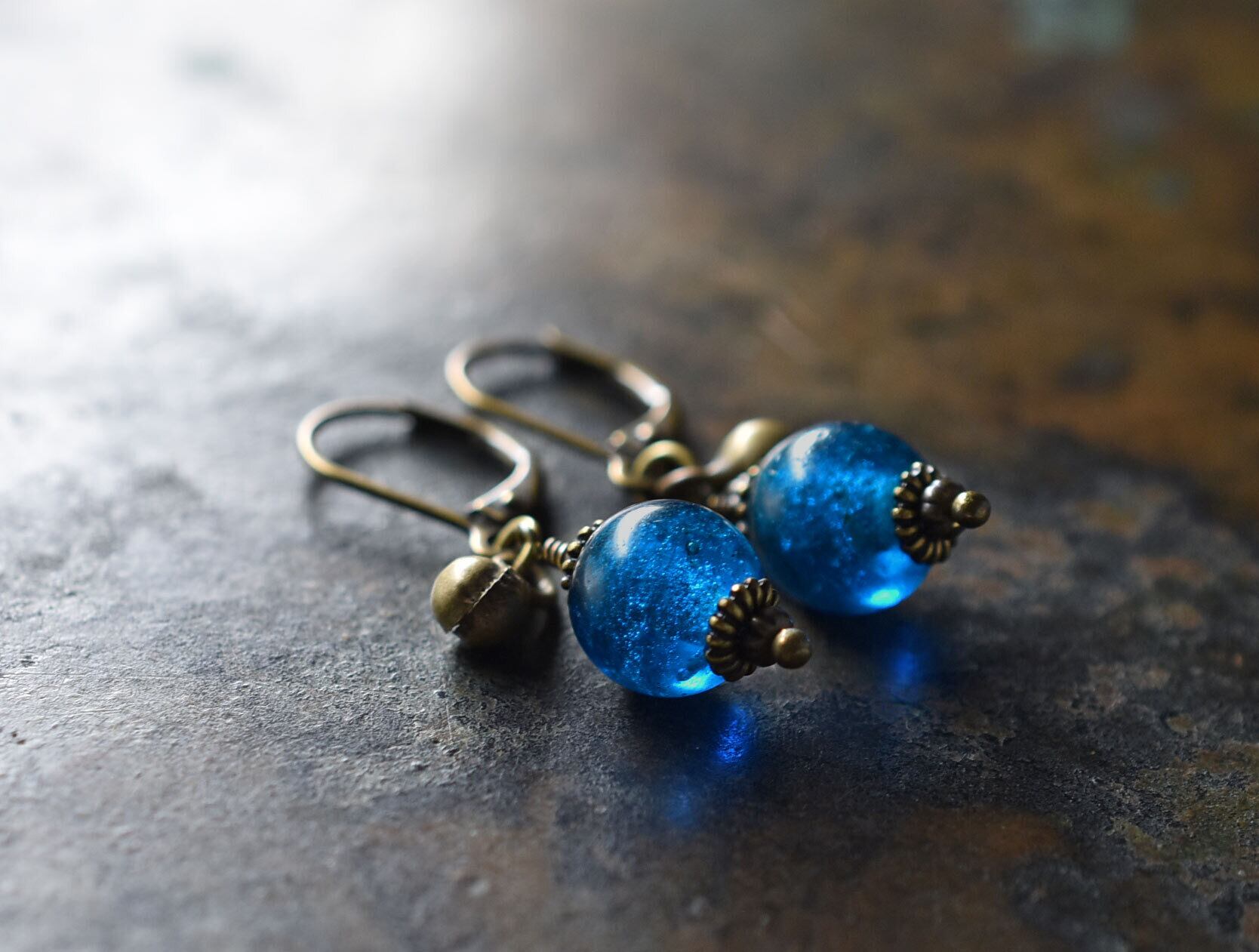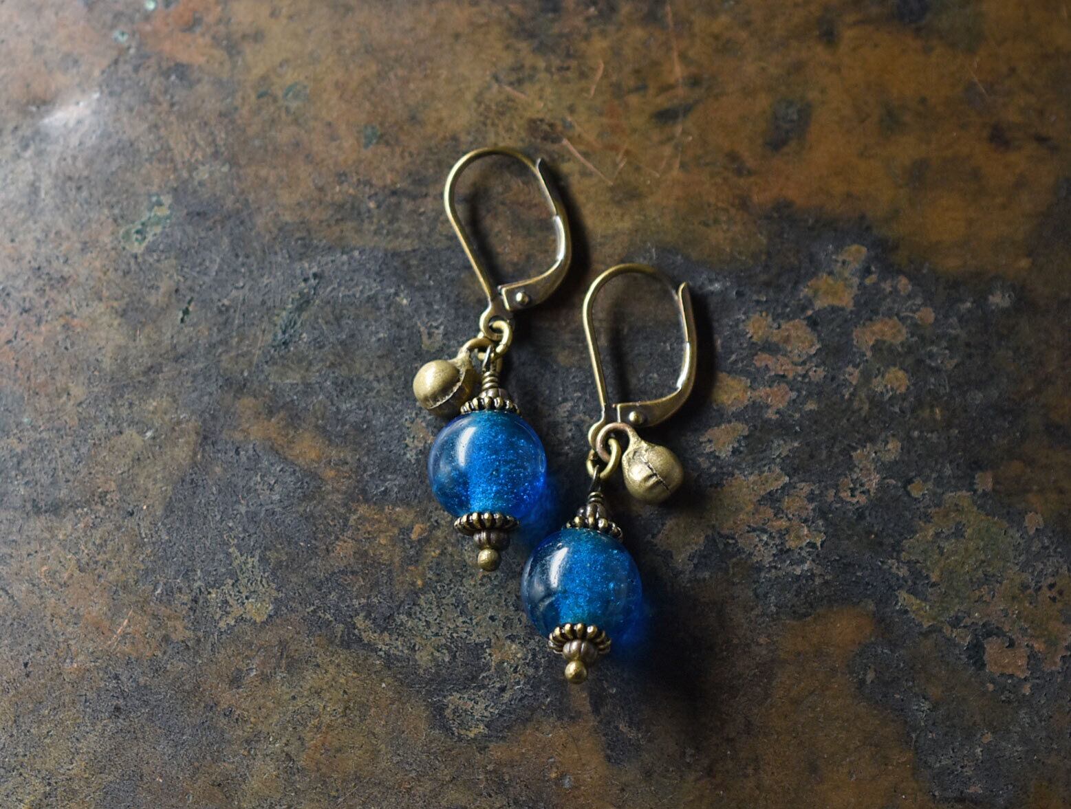 ブルーアンティークボヘミアビーズと民族鈴のピアス