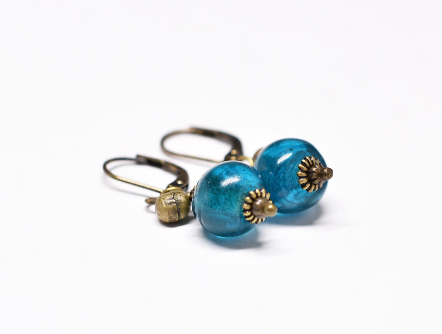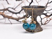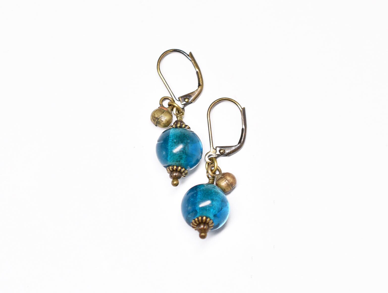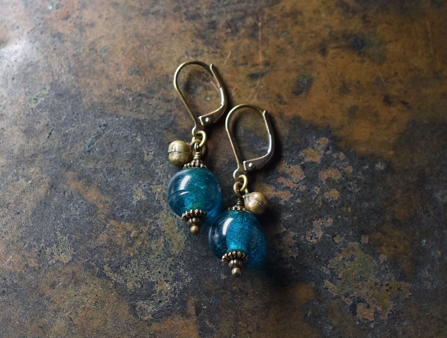 ブルーグリーンアンティークボヘミアビーズと民族鈴のピアス
