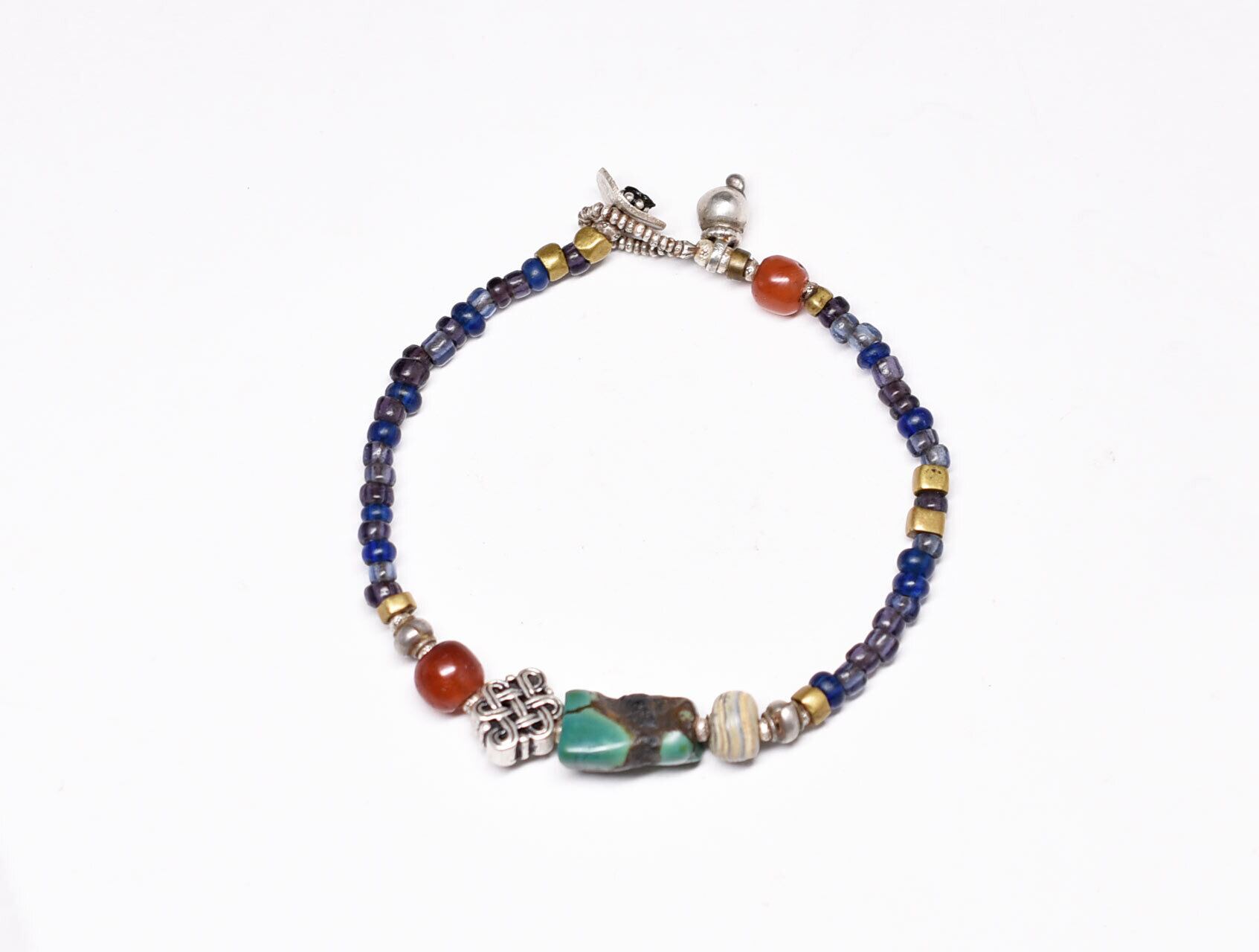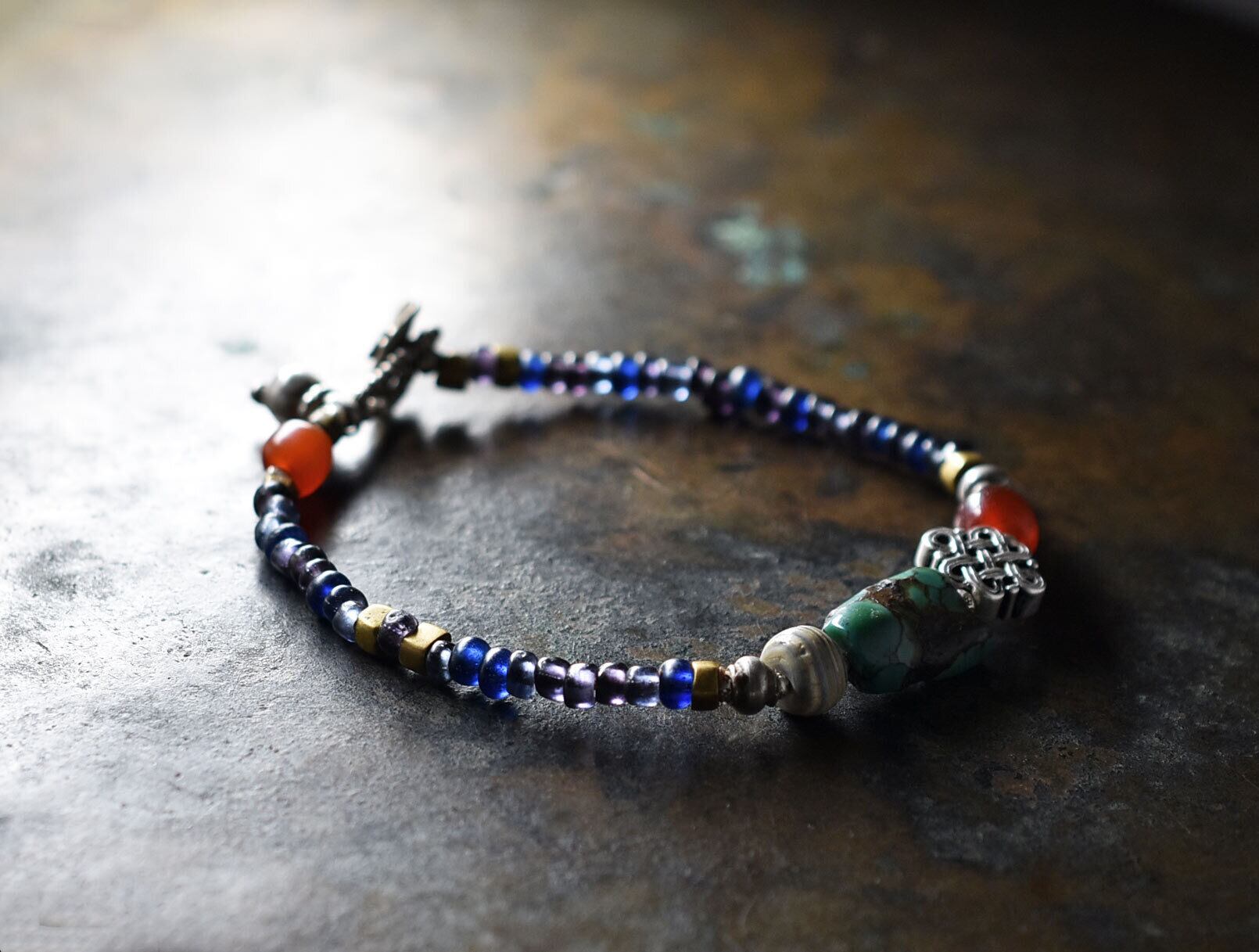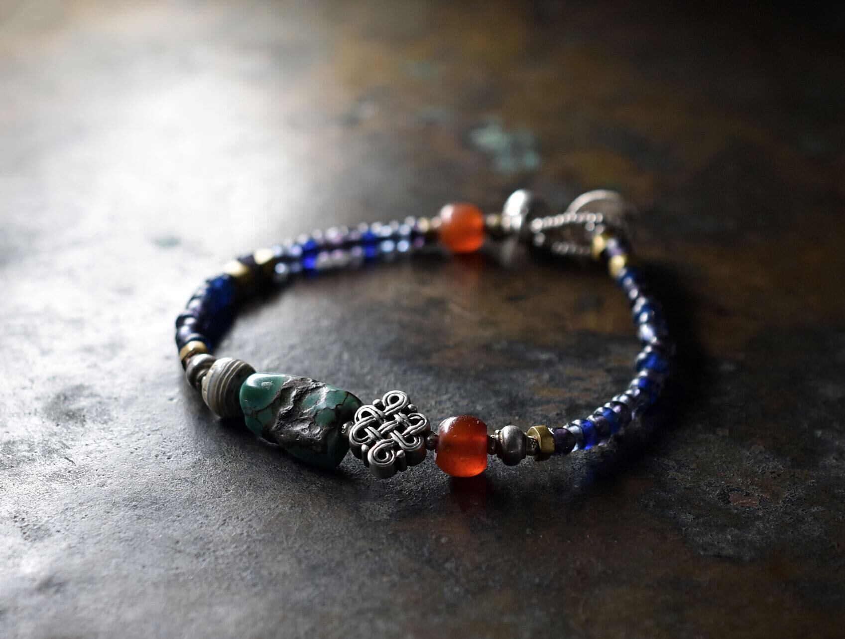 oldチベタンターコイズとエンドレスノット、ミゾーラムカーネリアン、古代瑪瑙、oldオリッサブラス、ブルー&パープルビーズのブレス