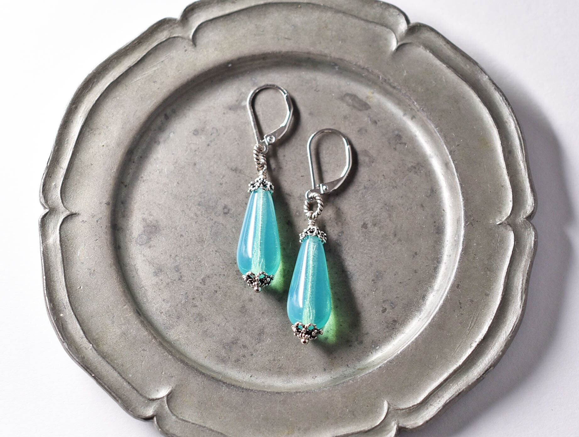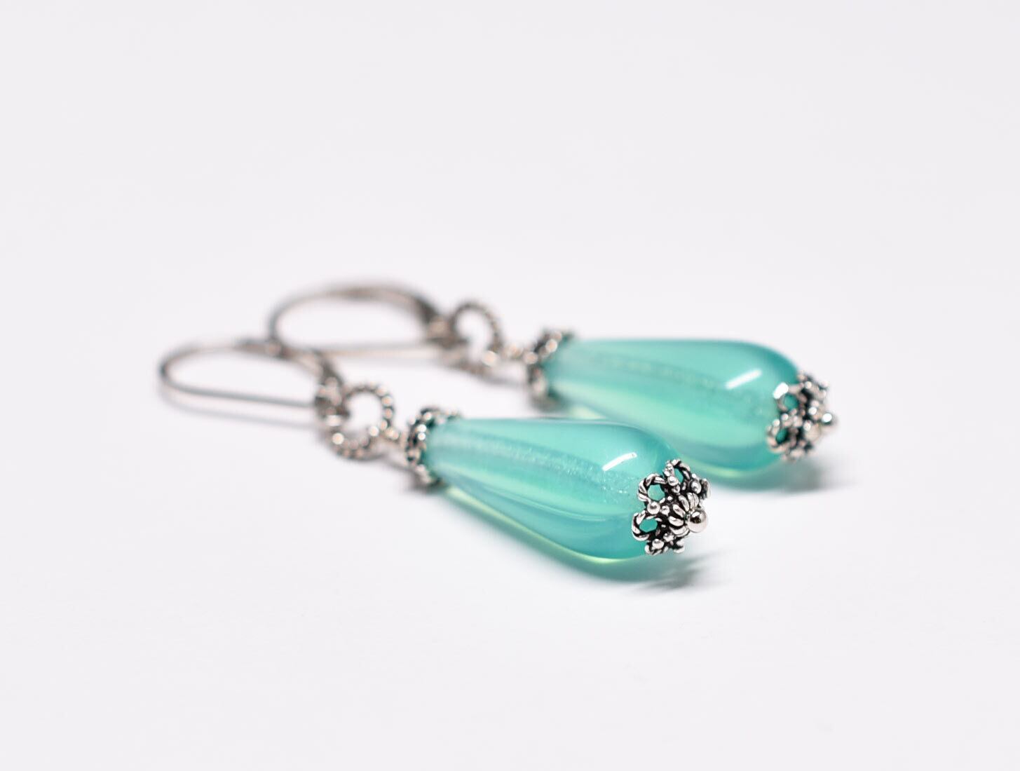 「A様専用」雫型ピーコックグリーンウランガラスの一粒ピアス