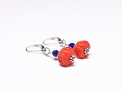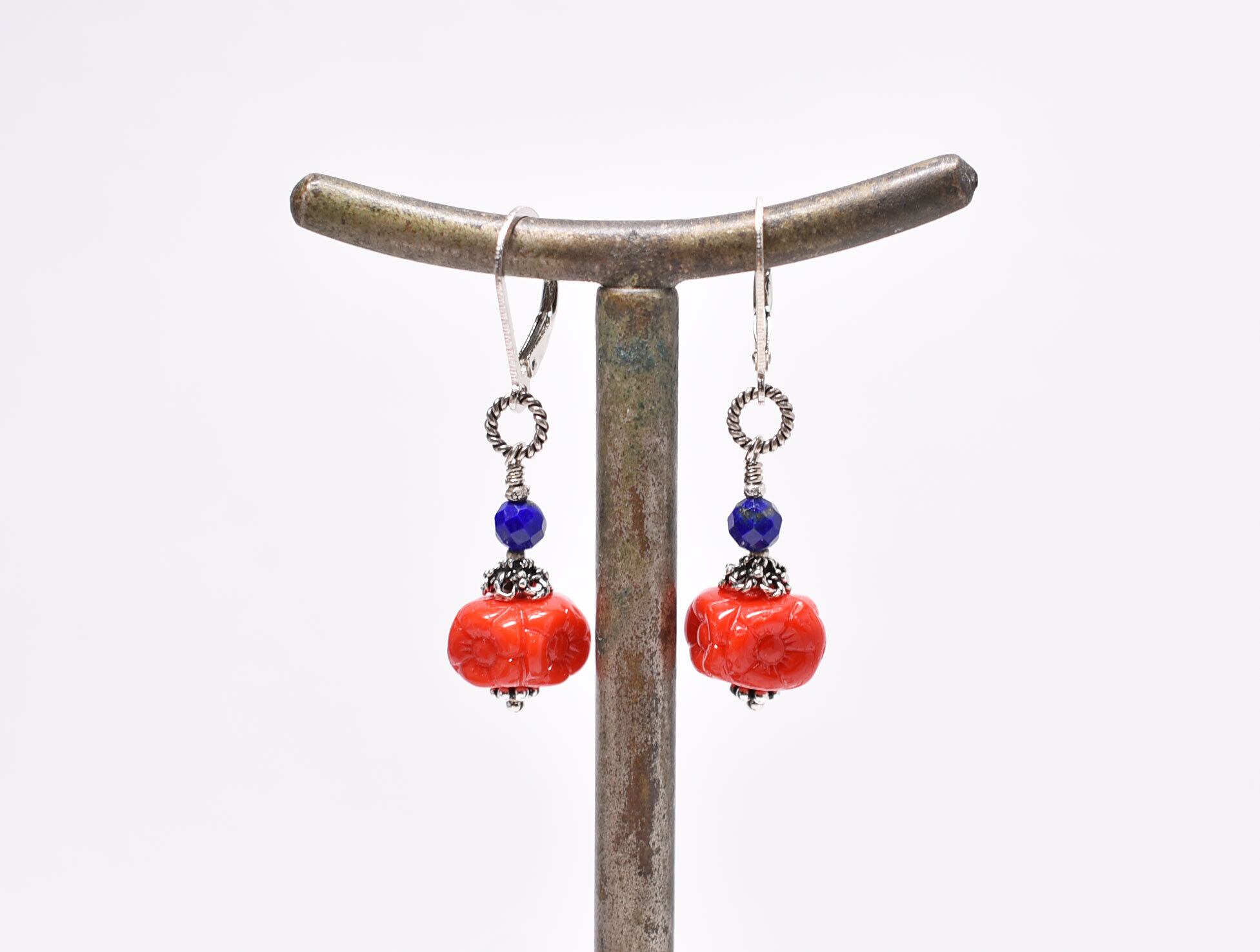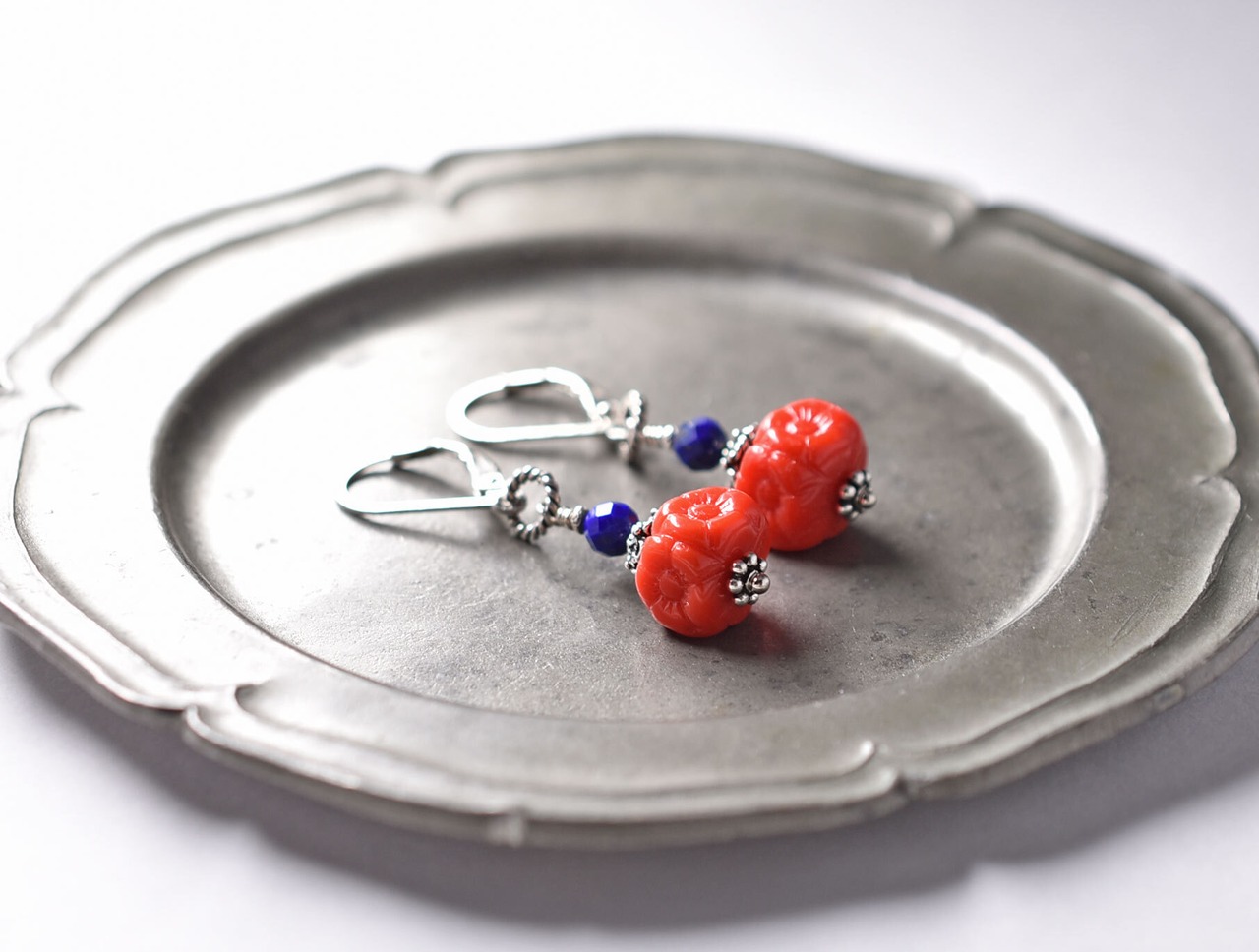 朱赤花模様ヴィンテージビーズとラピスのピアス