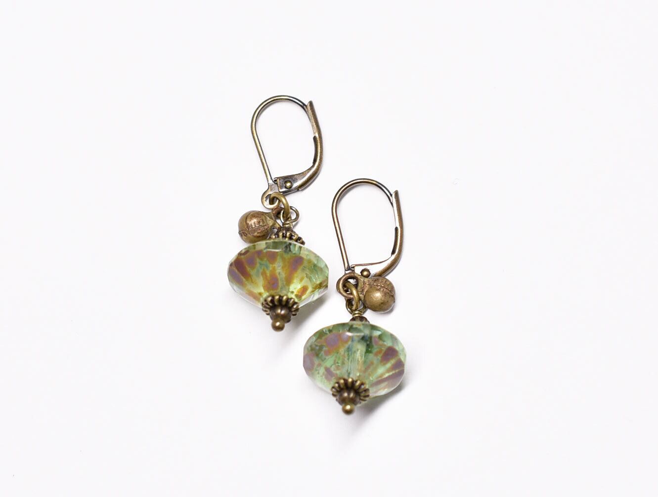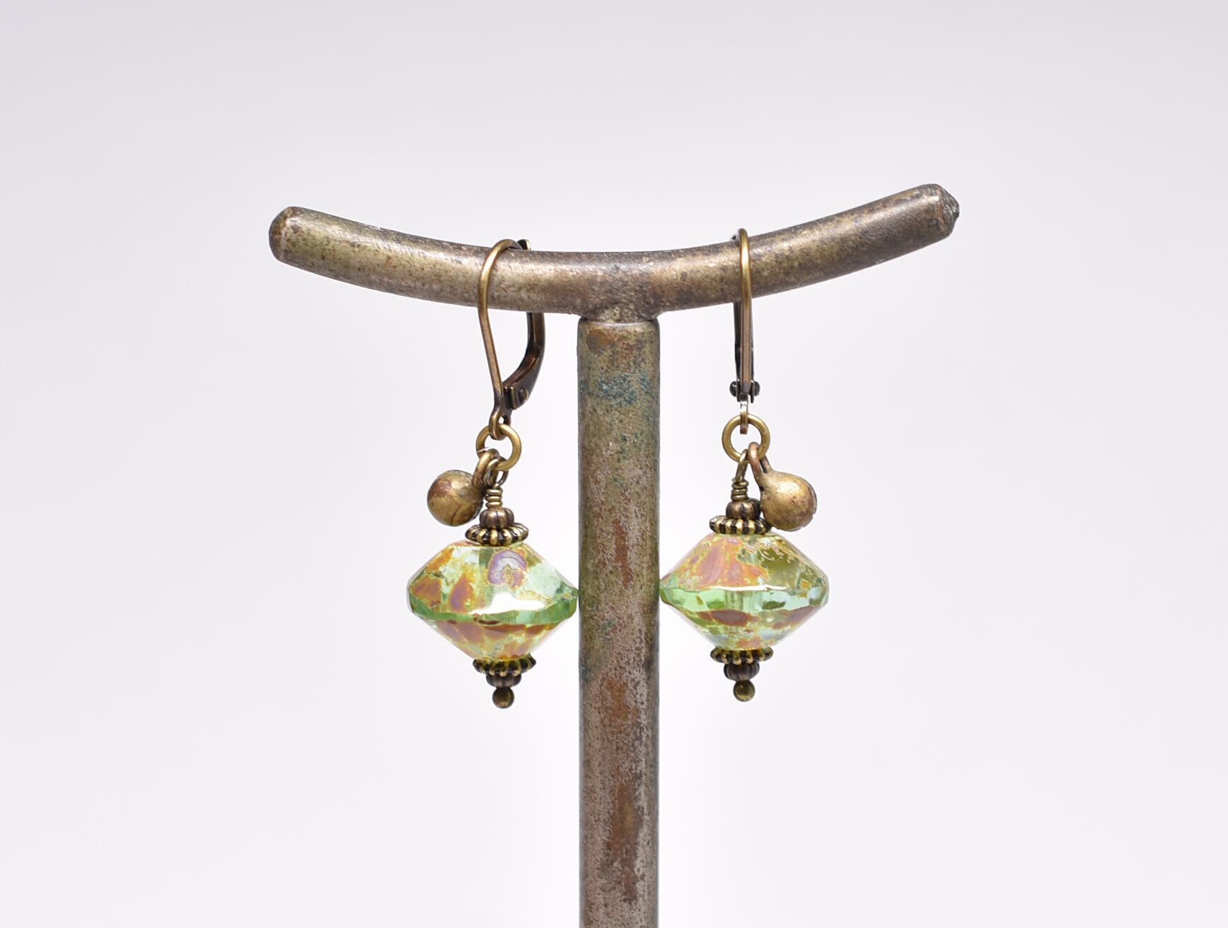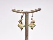 ピスタチオグリーンウランガラスと民族鈴を繋いだピアスです。