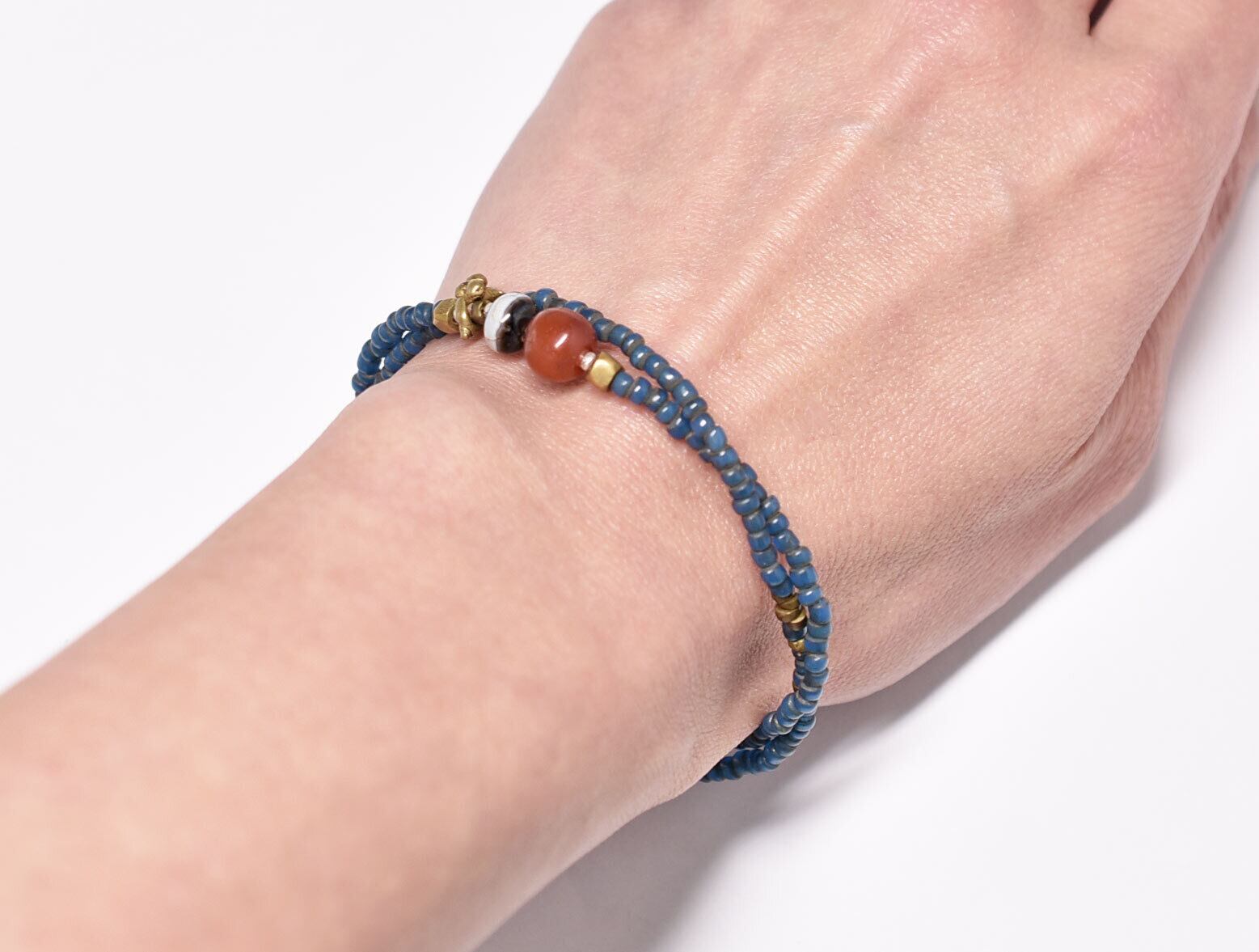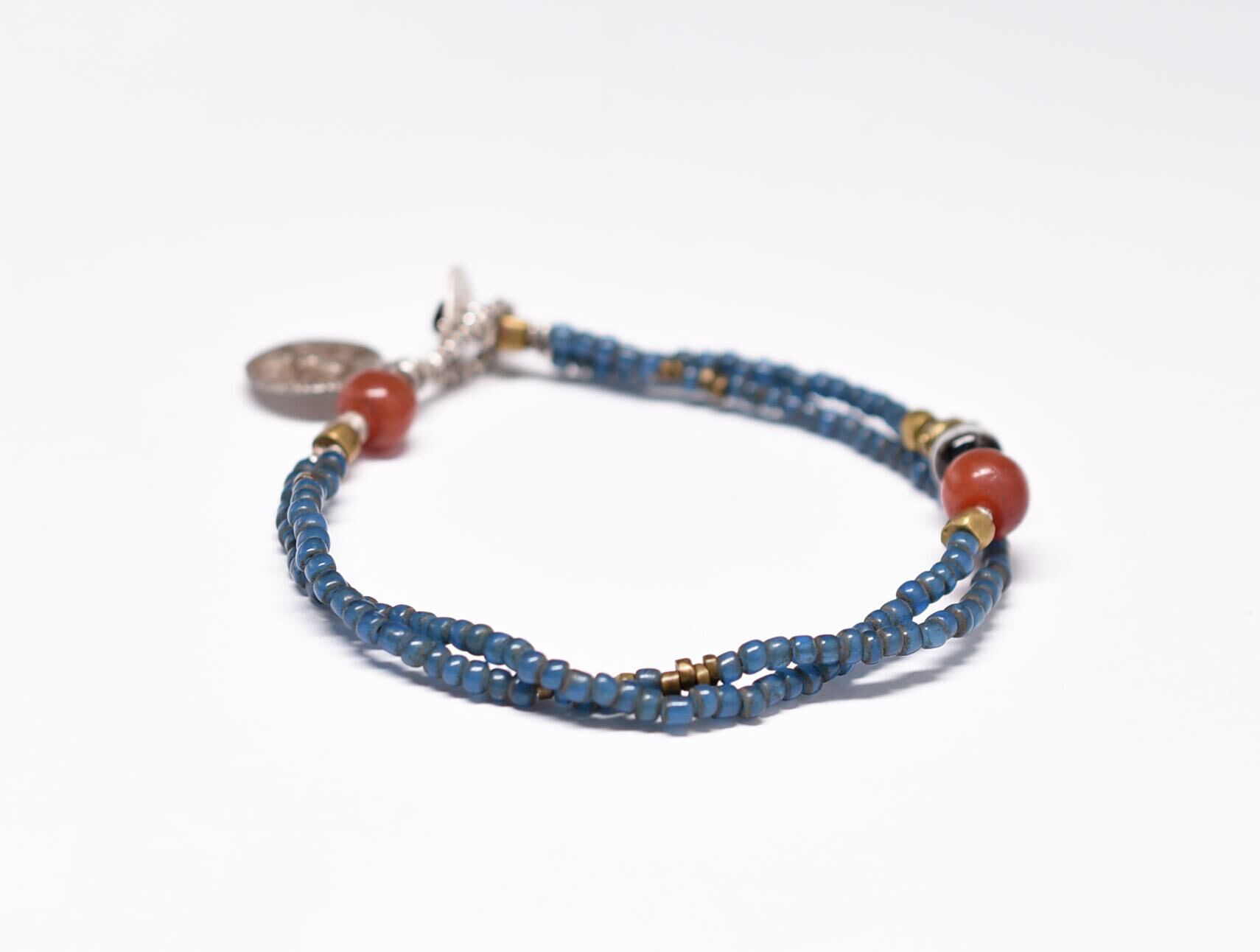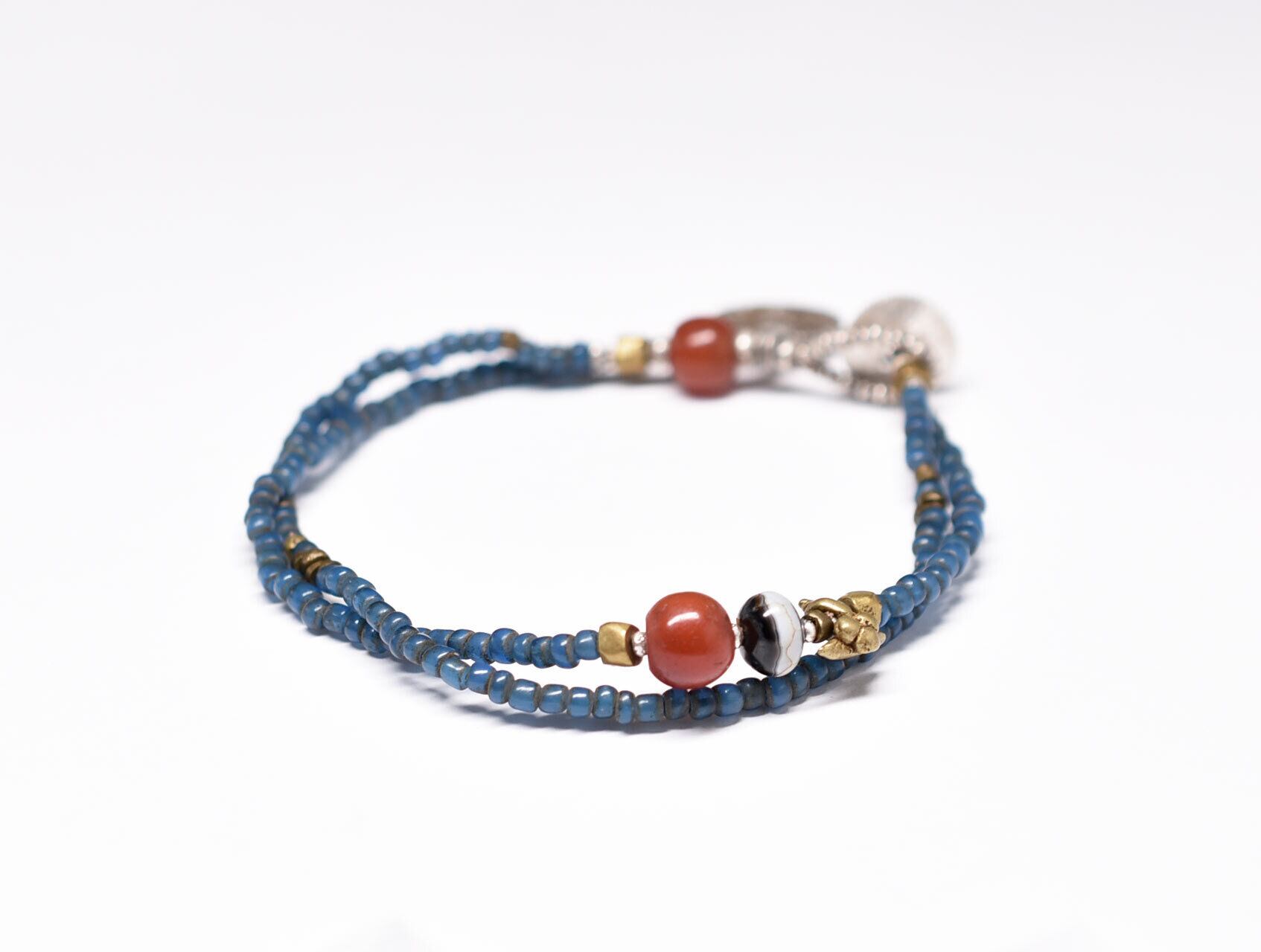 ミゾーラムカーネリアン、古代瑪瑙、oldオリッサブラス、ジェイブルーシードビーズ、インドシルバーチャームを繋いだブレスです。