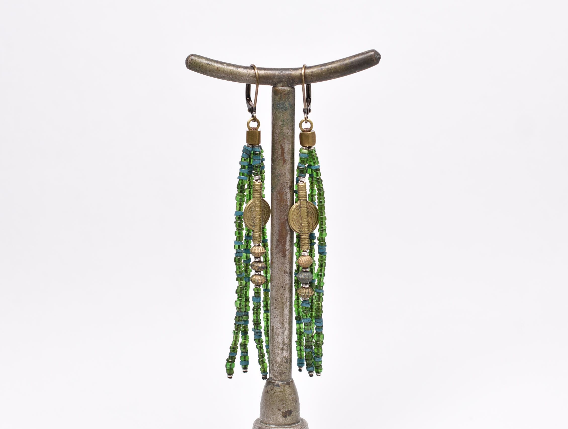 アフリカンブラスとグリーンミックスシードビーズ、ヴィンテージブラスの4連ピアス