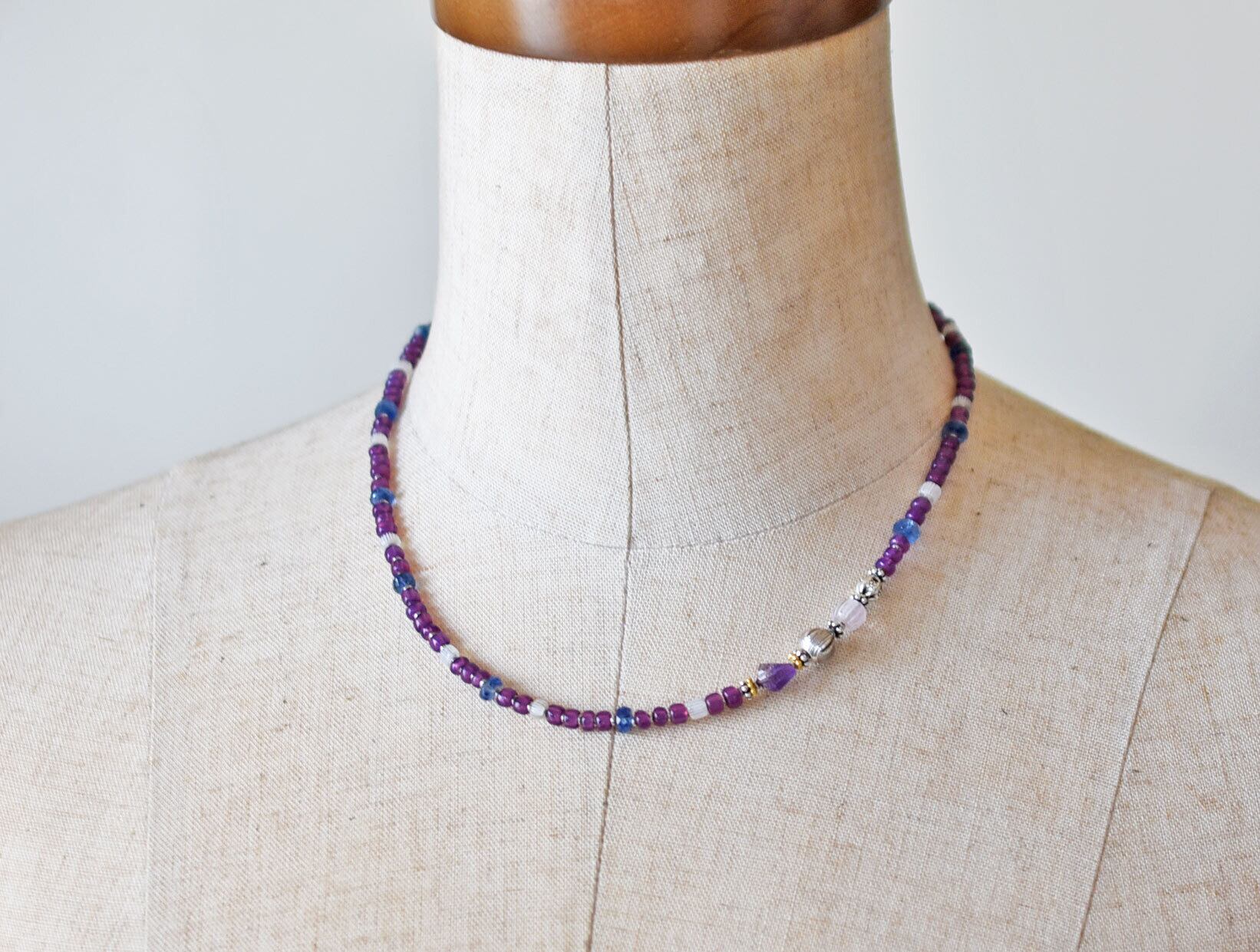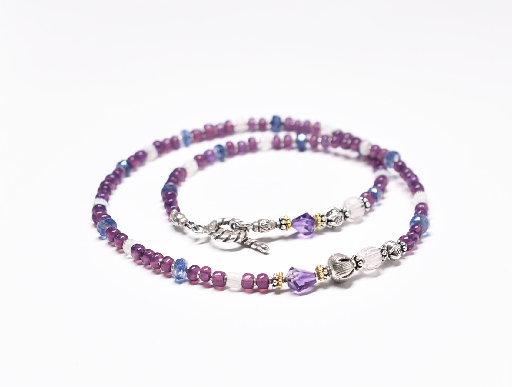 アメジストとカレンシルバー、グーズベリー、すみれ色フランスヴィンテージビーズ、カイヤナイトを繋いだネックレスです。