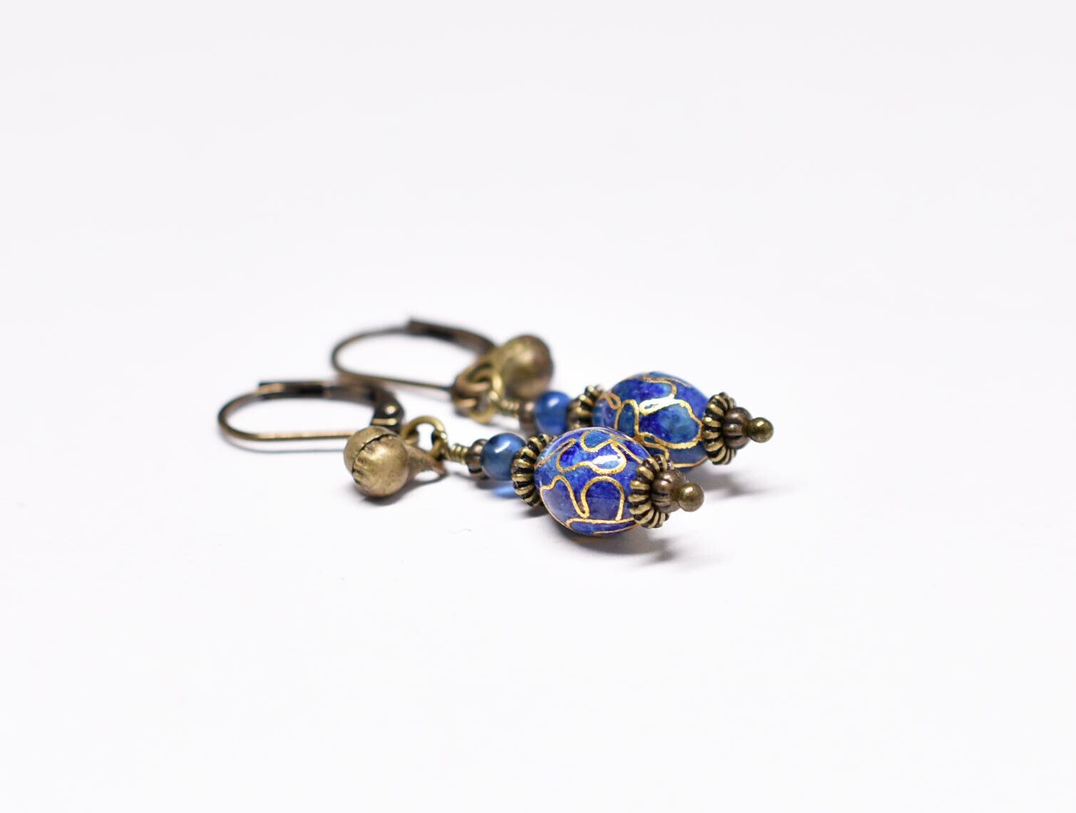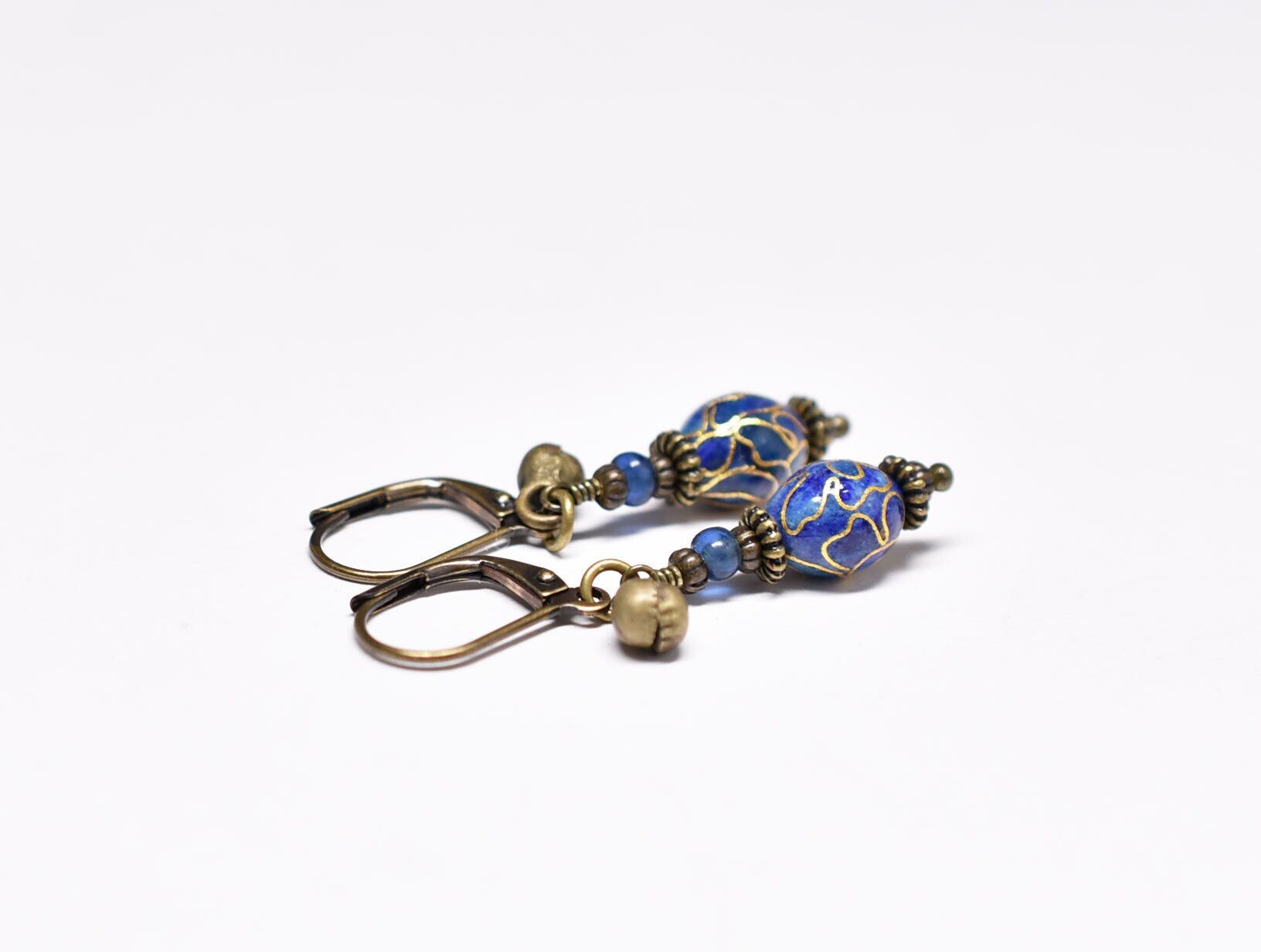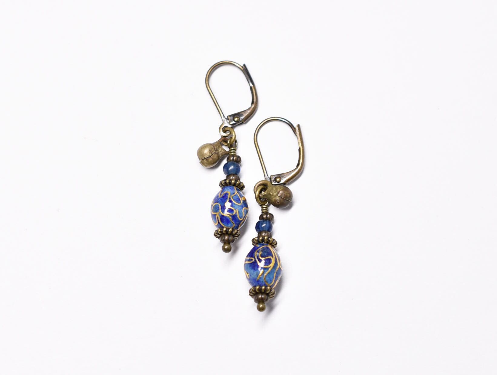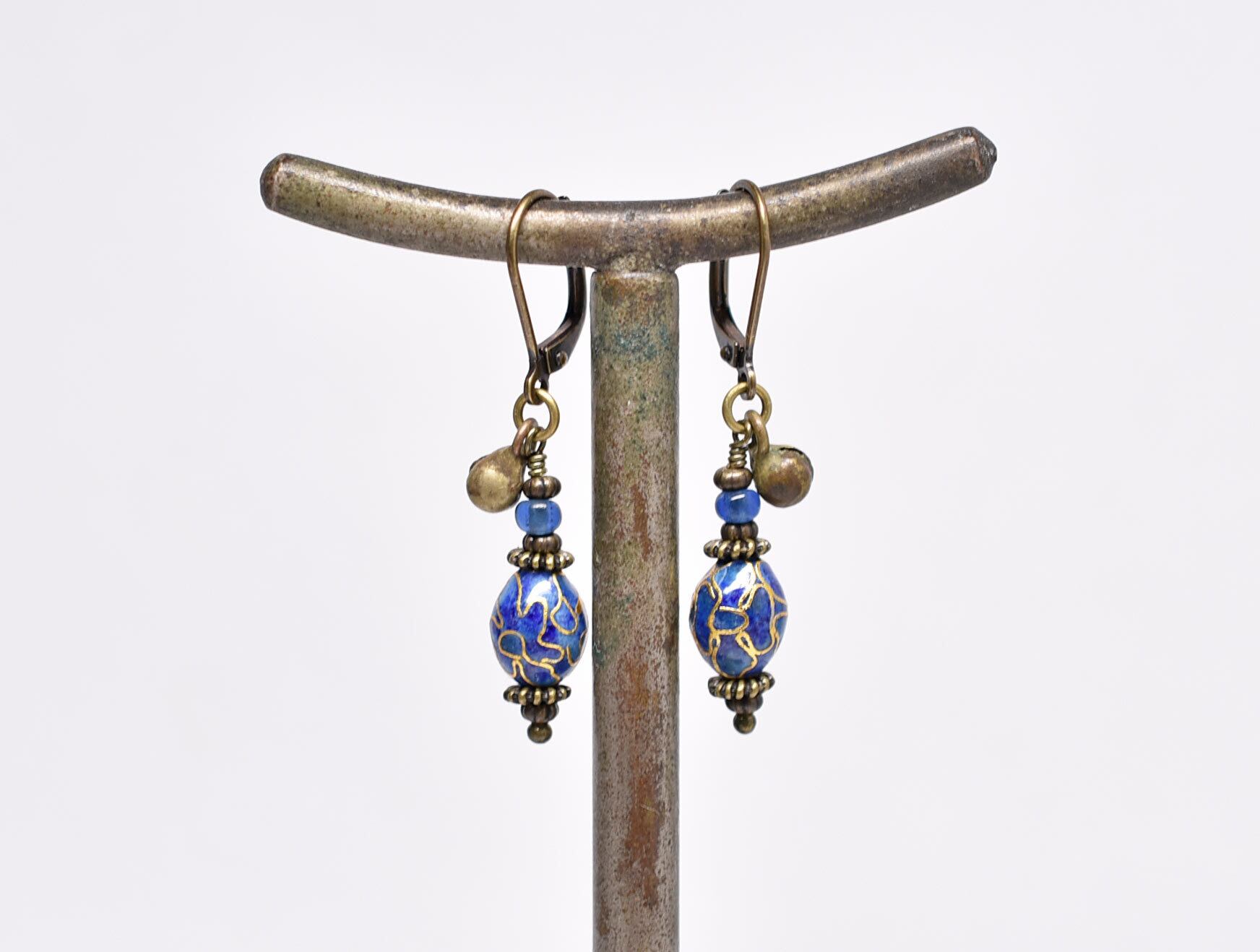 瑠璃色中国七宝焼きとブルーアンティークビーズ、民族鈴のピアス