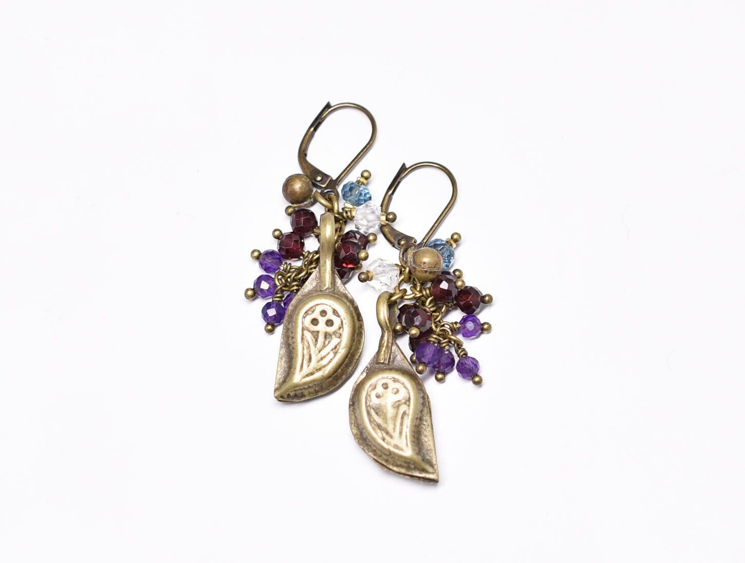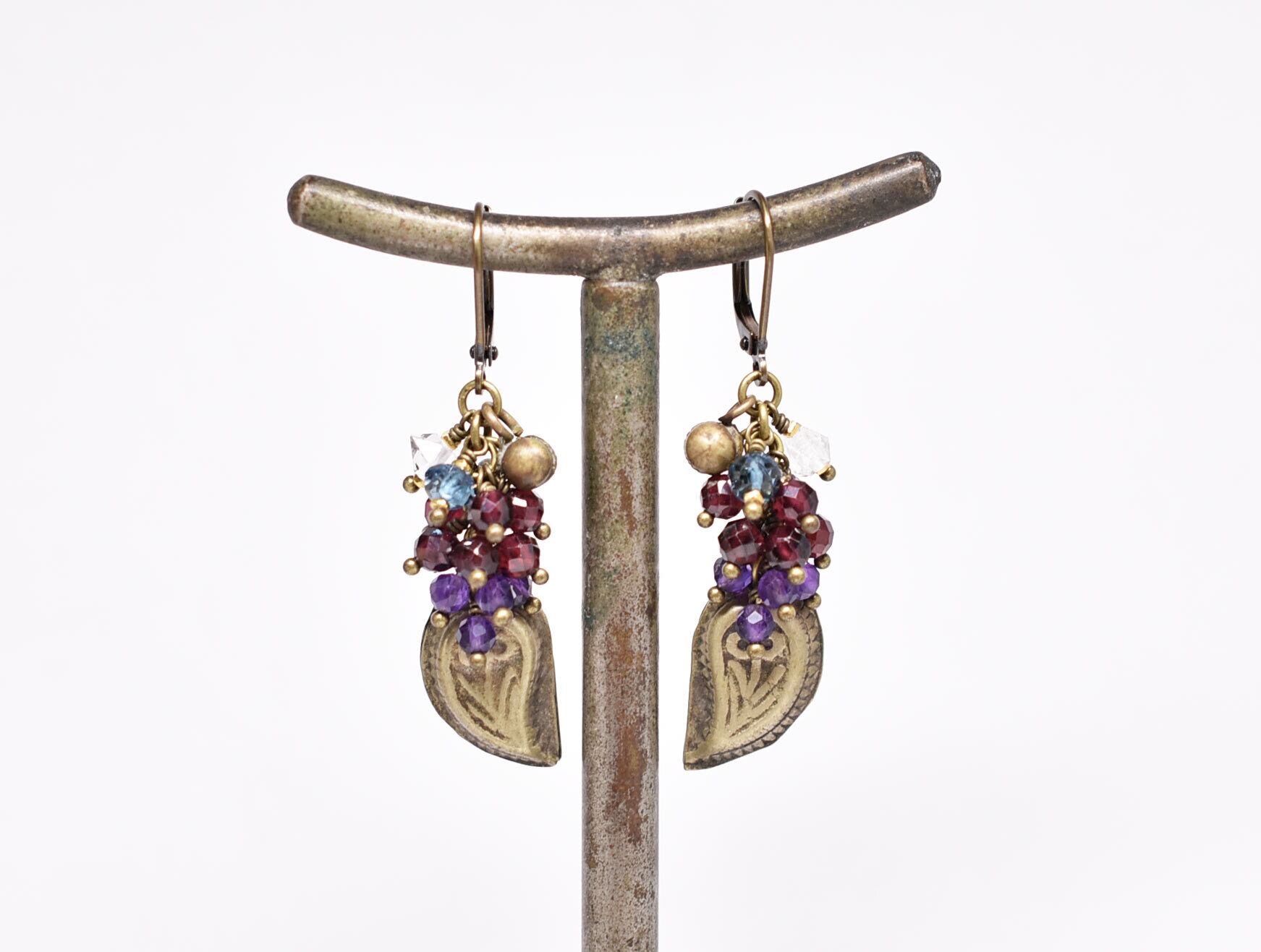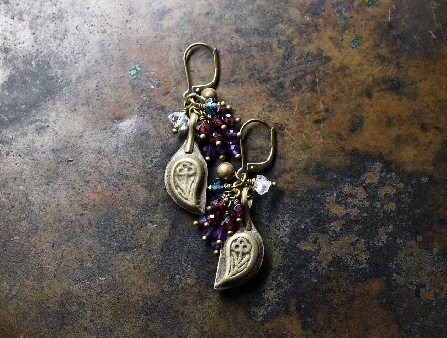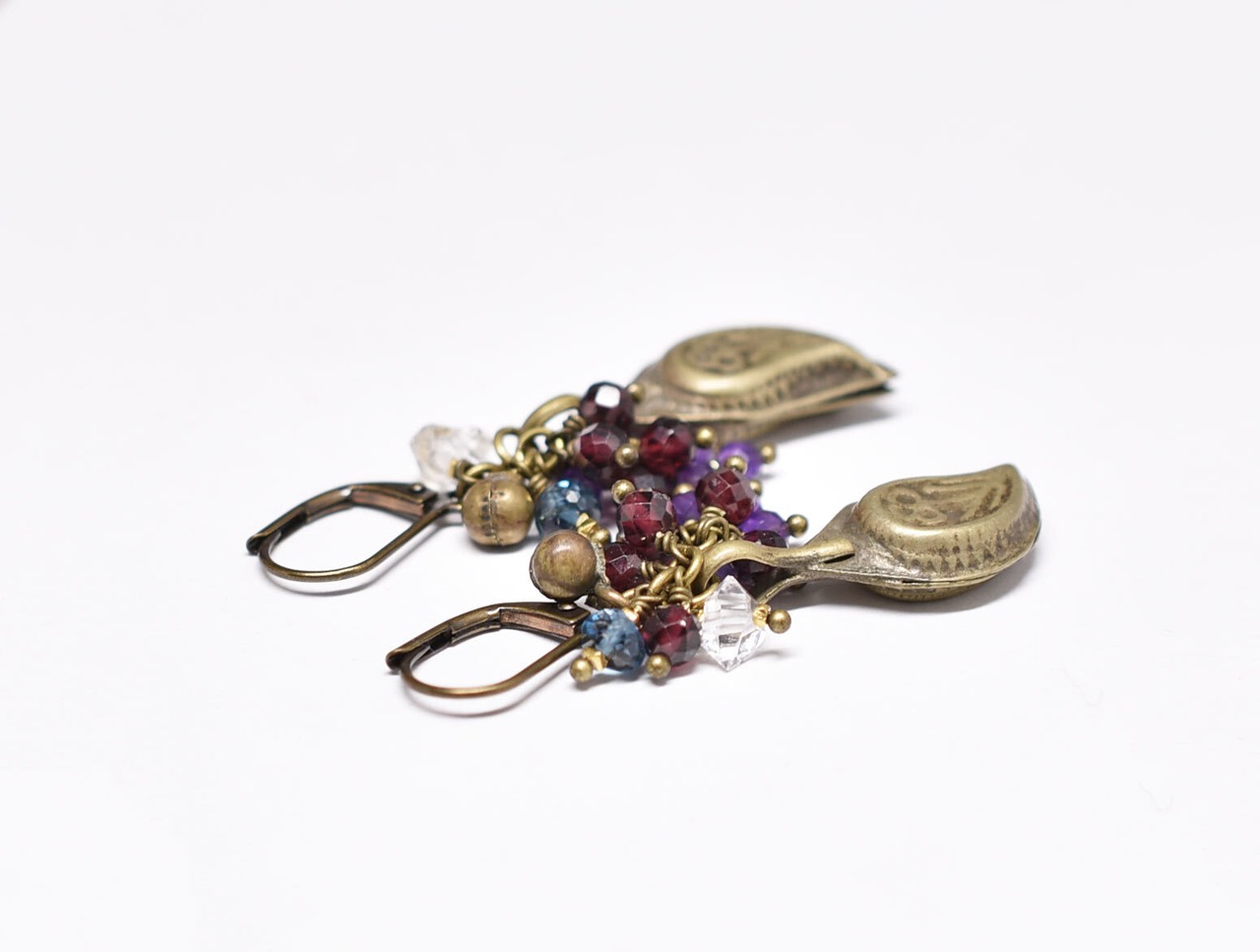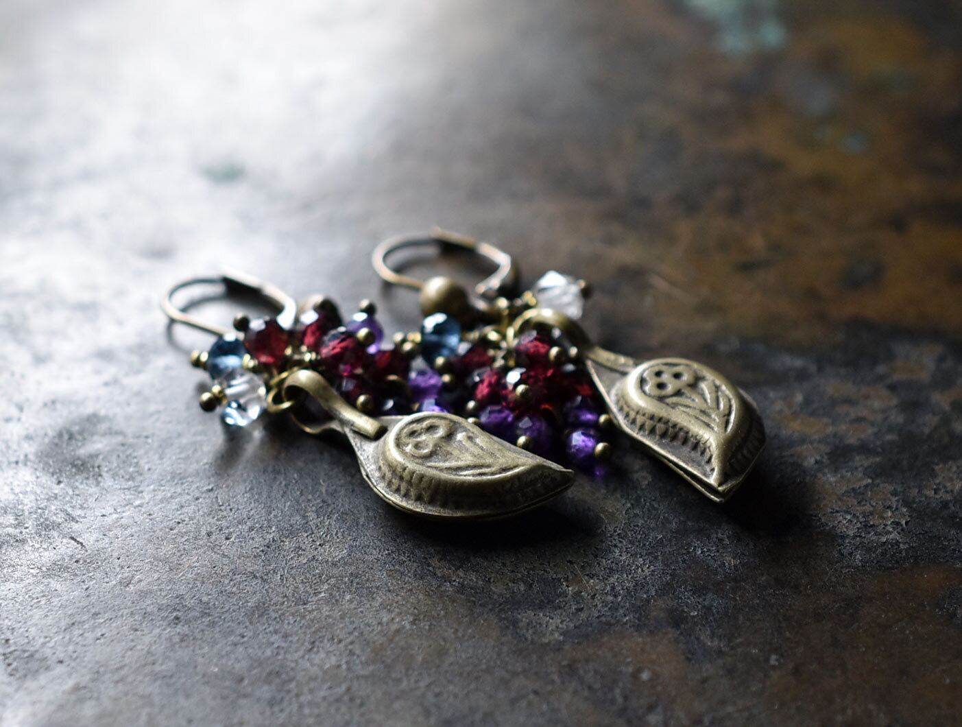 アフガニスタンメタルとたわわなガーネット&アメジスト、ロンドンブルートパーズ、ハーキマーダイヤモンド、民族鈴のピアス