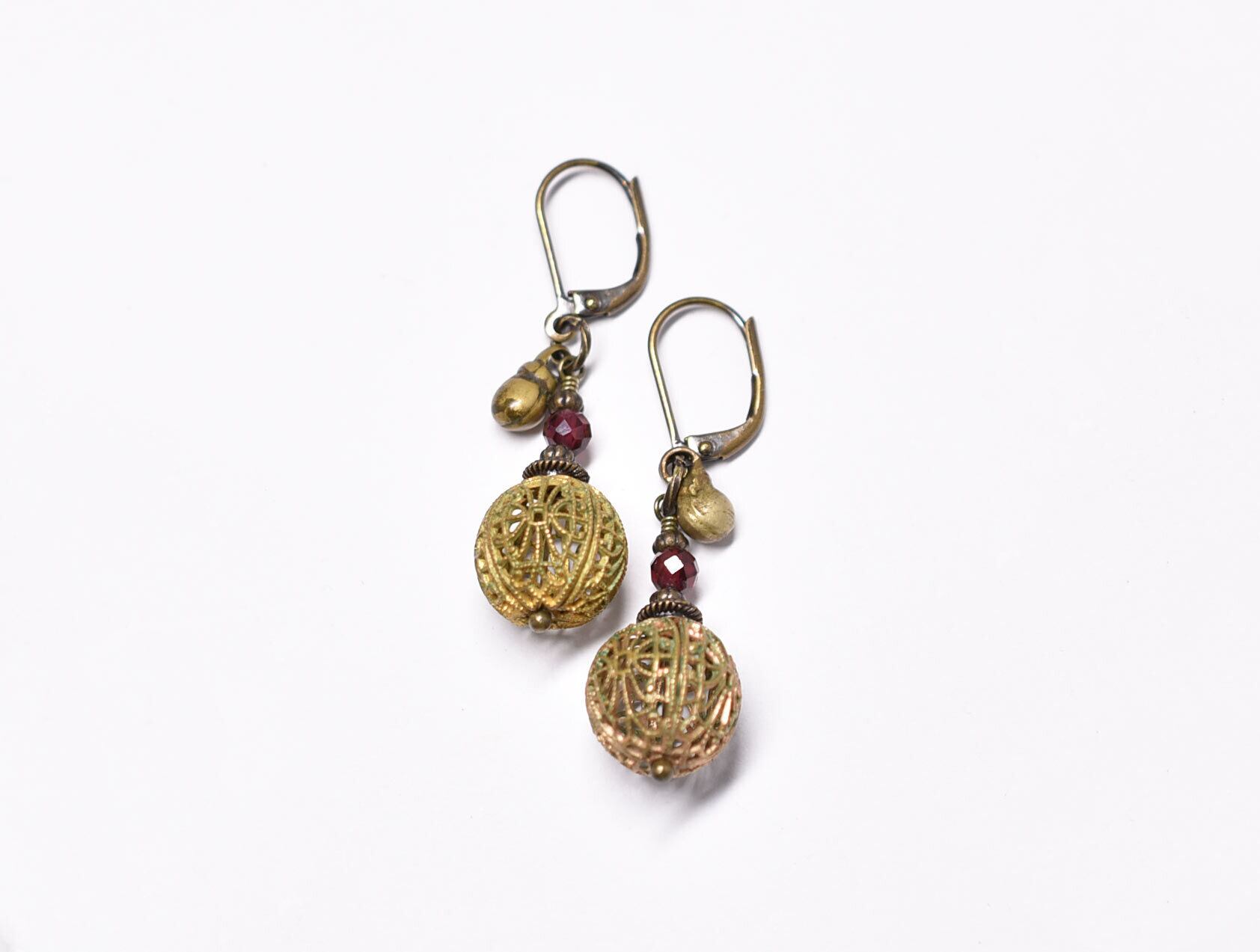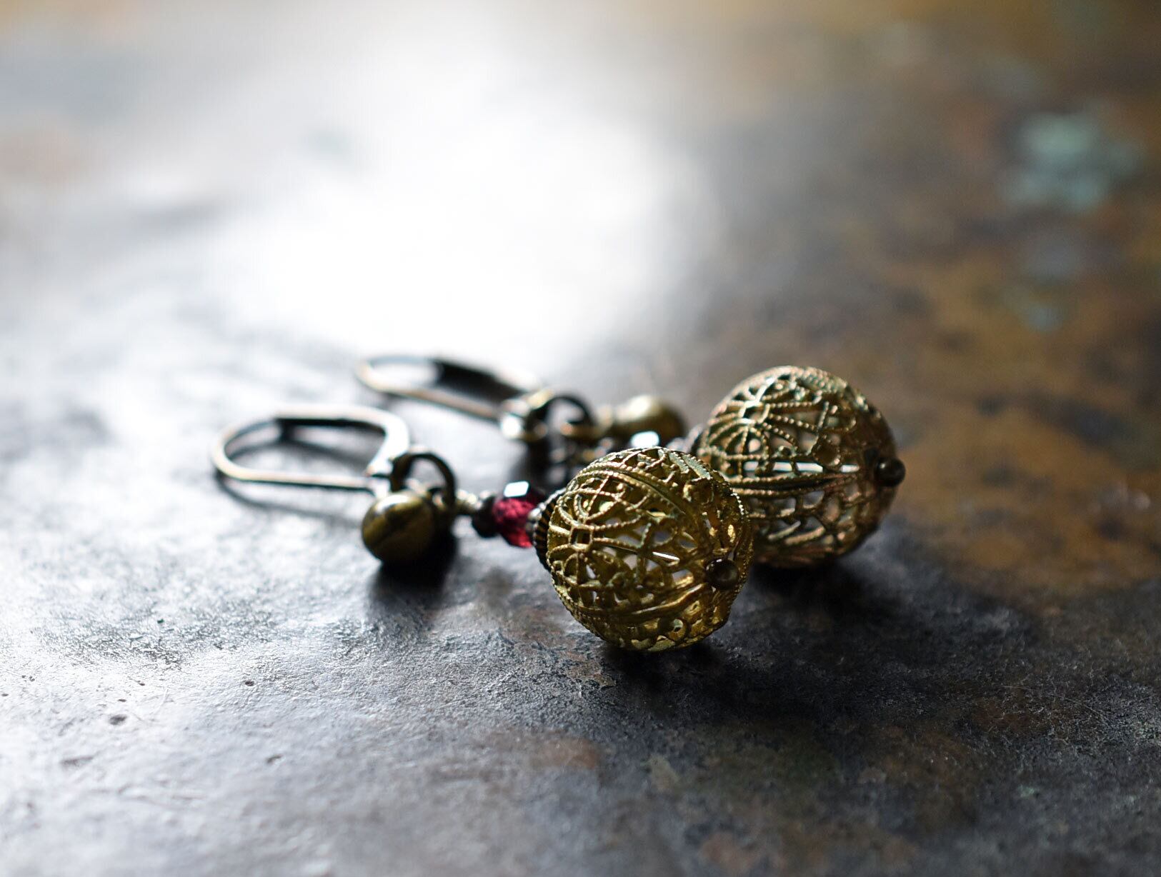 ヨーロッパヴィンテージメタルパーツとガーネット、民族鈴を繋いだピアスです。