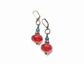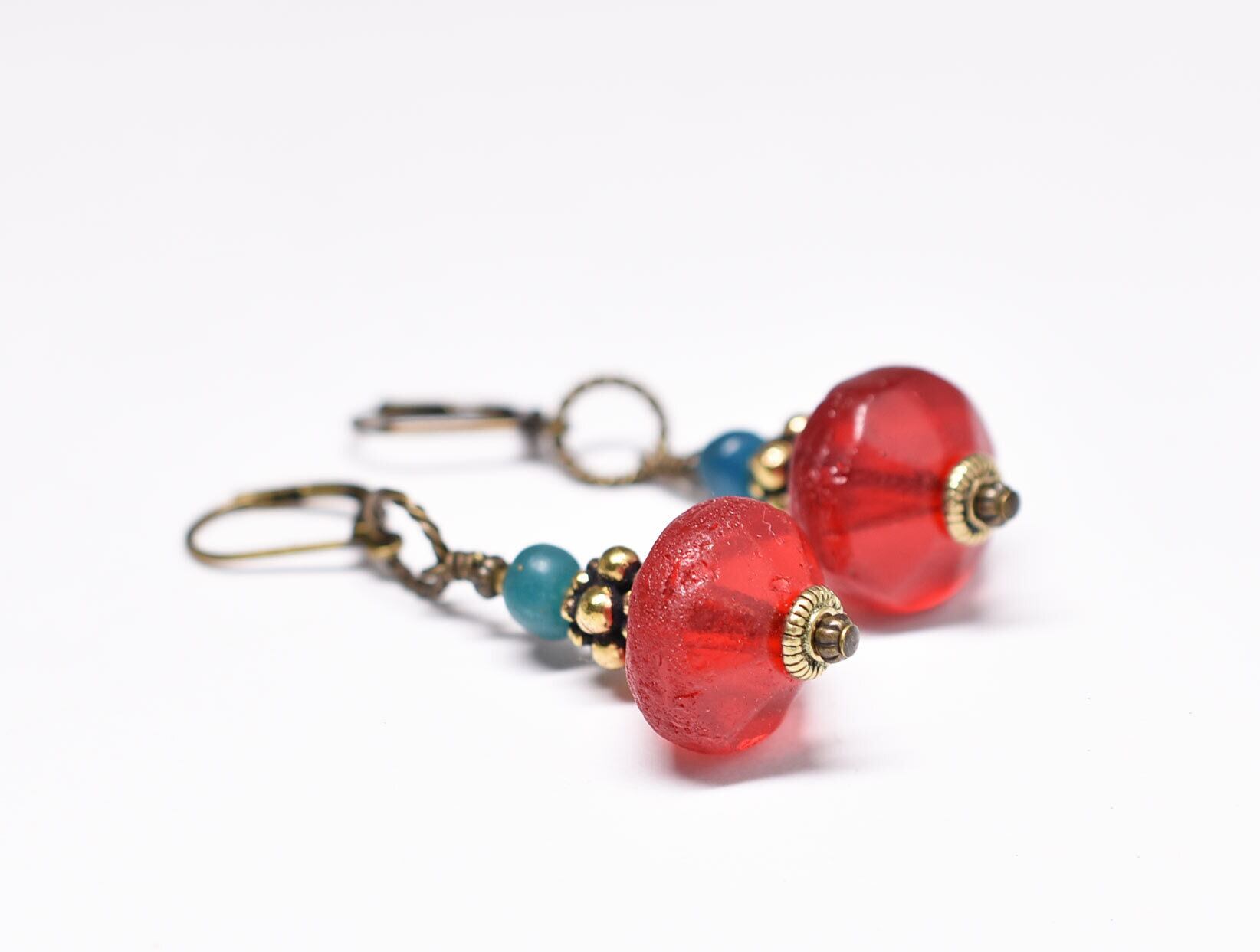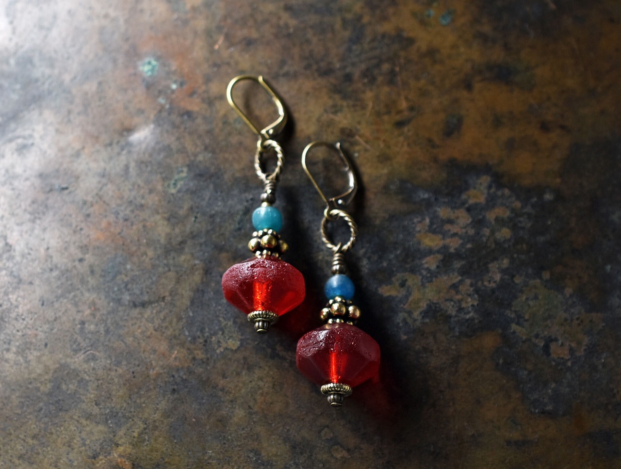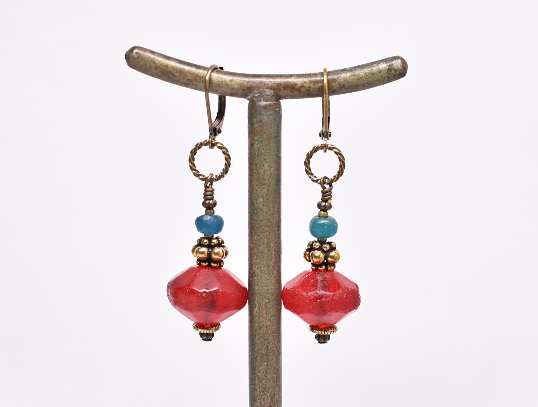 真っ赤な算盤型アンティークボヘミアビーズと、ぷっくりブラス、浅葱色アンティークビーズのピアス