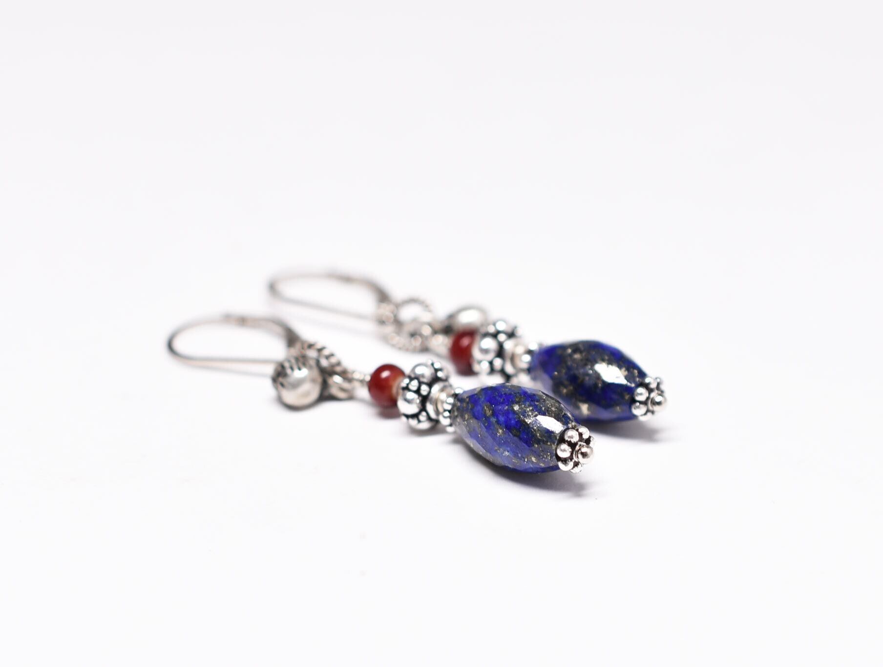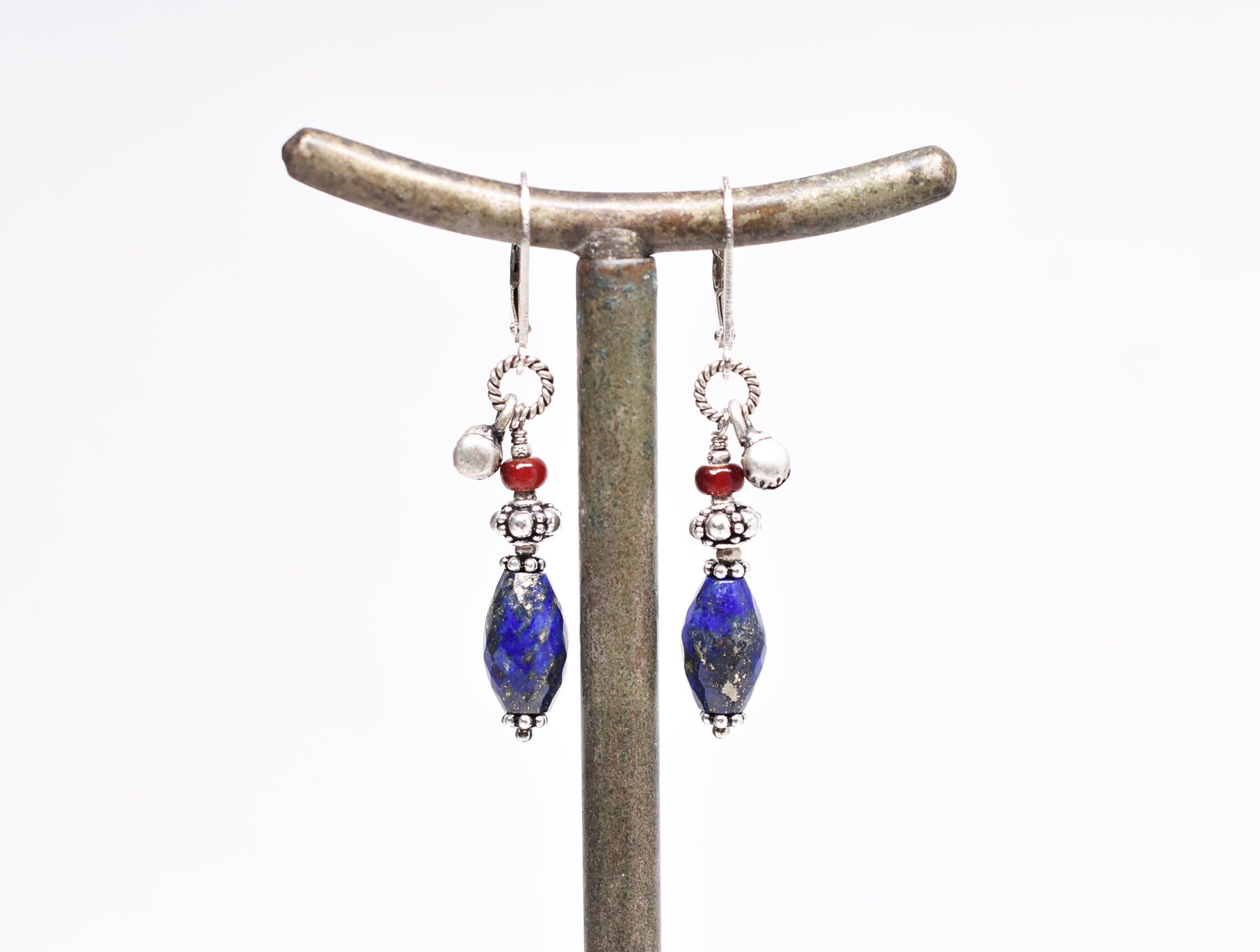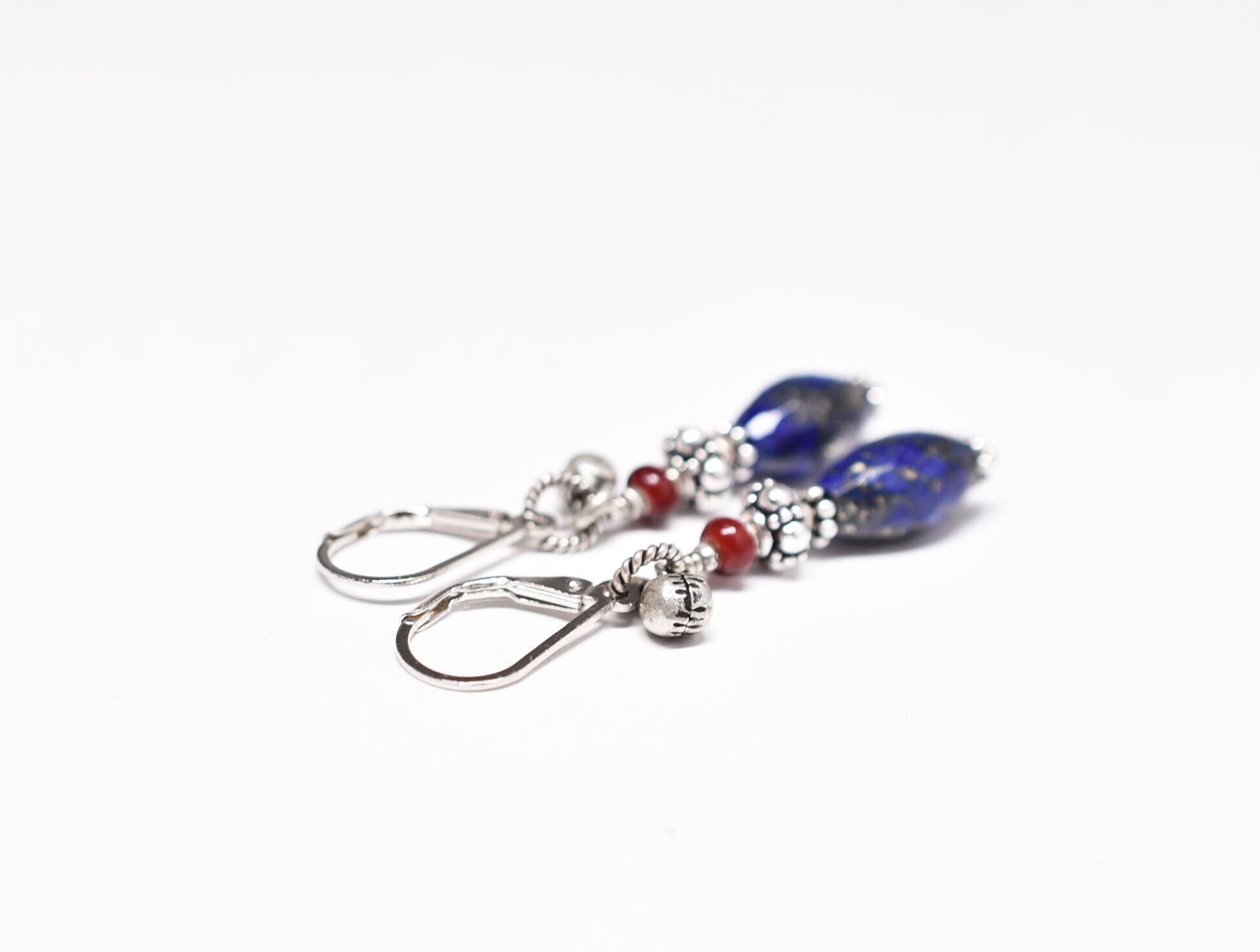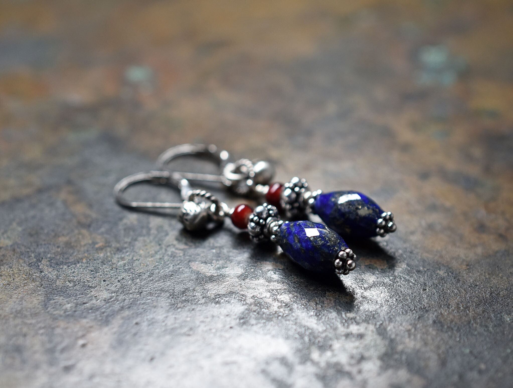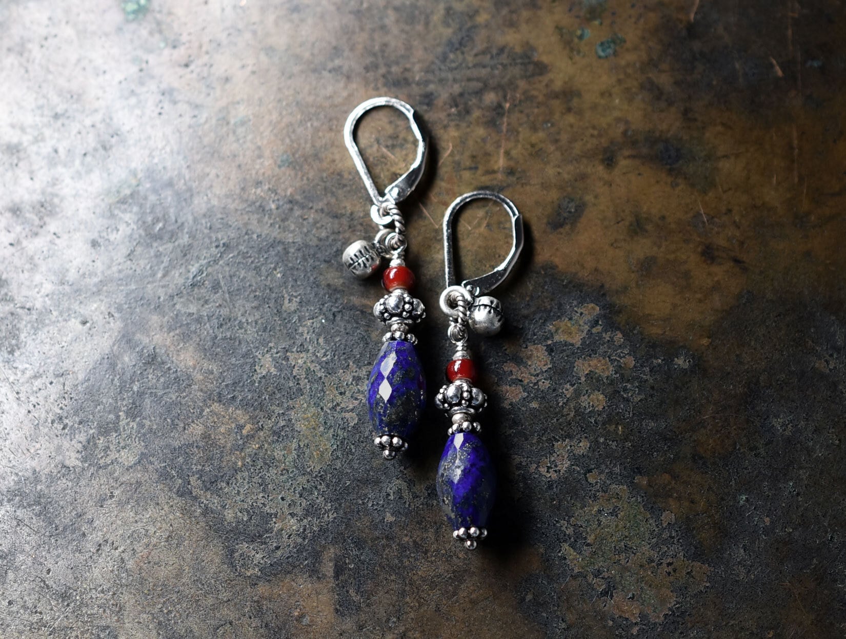 ラピスラズリと濃赤ホワイトハーツ、シルバービーズ、インドシルバー鈴を繋いだピアスです。