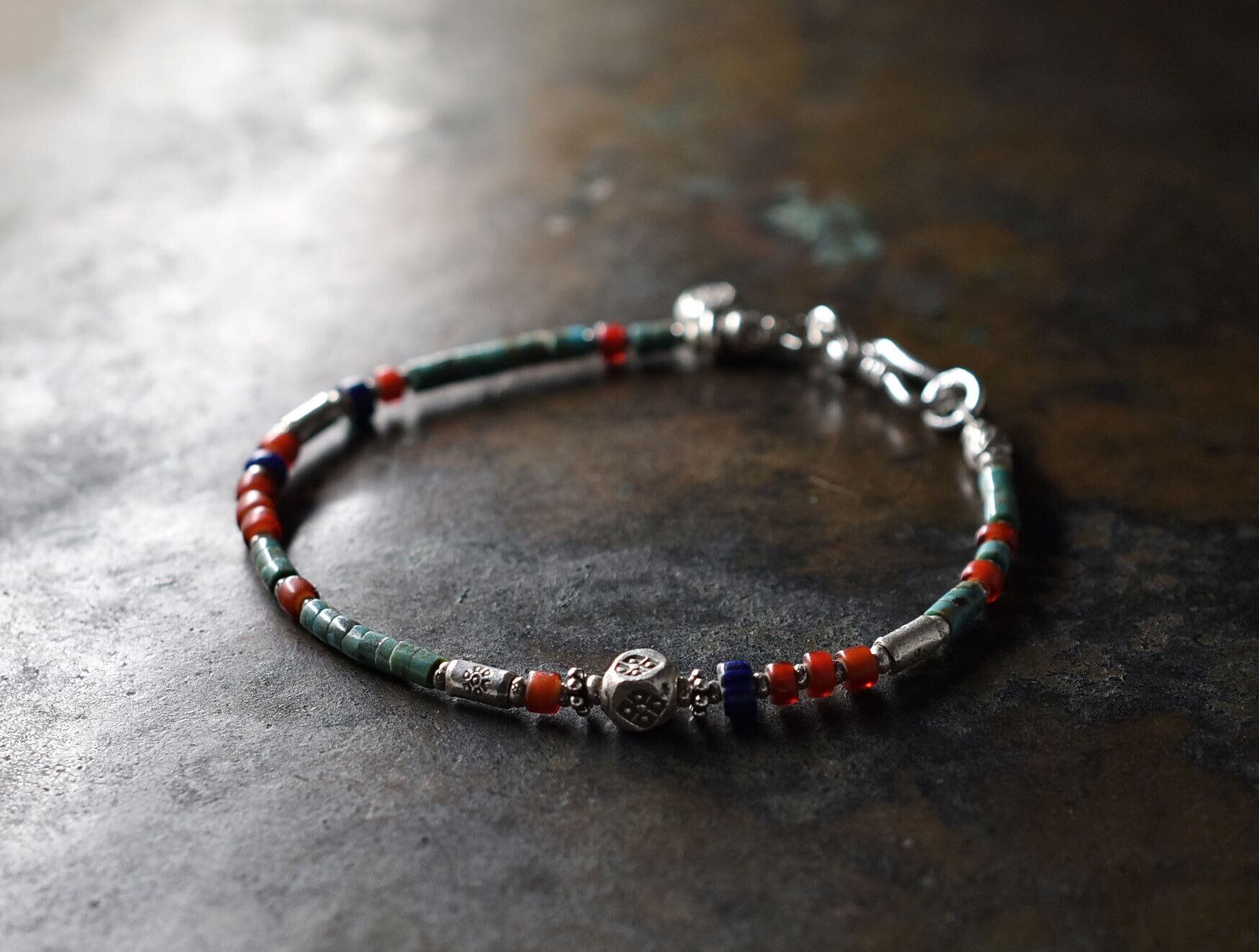 グリーンターコイズと飴色ホワイトハーツ 、ブルーシェブロン、カレンシルバーを繋いだ華奢なブレスです。