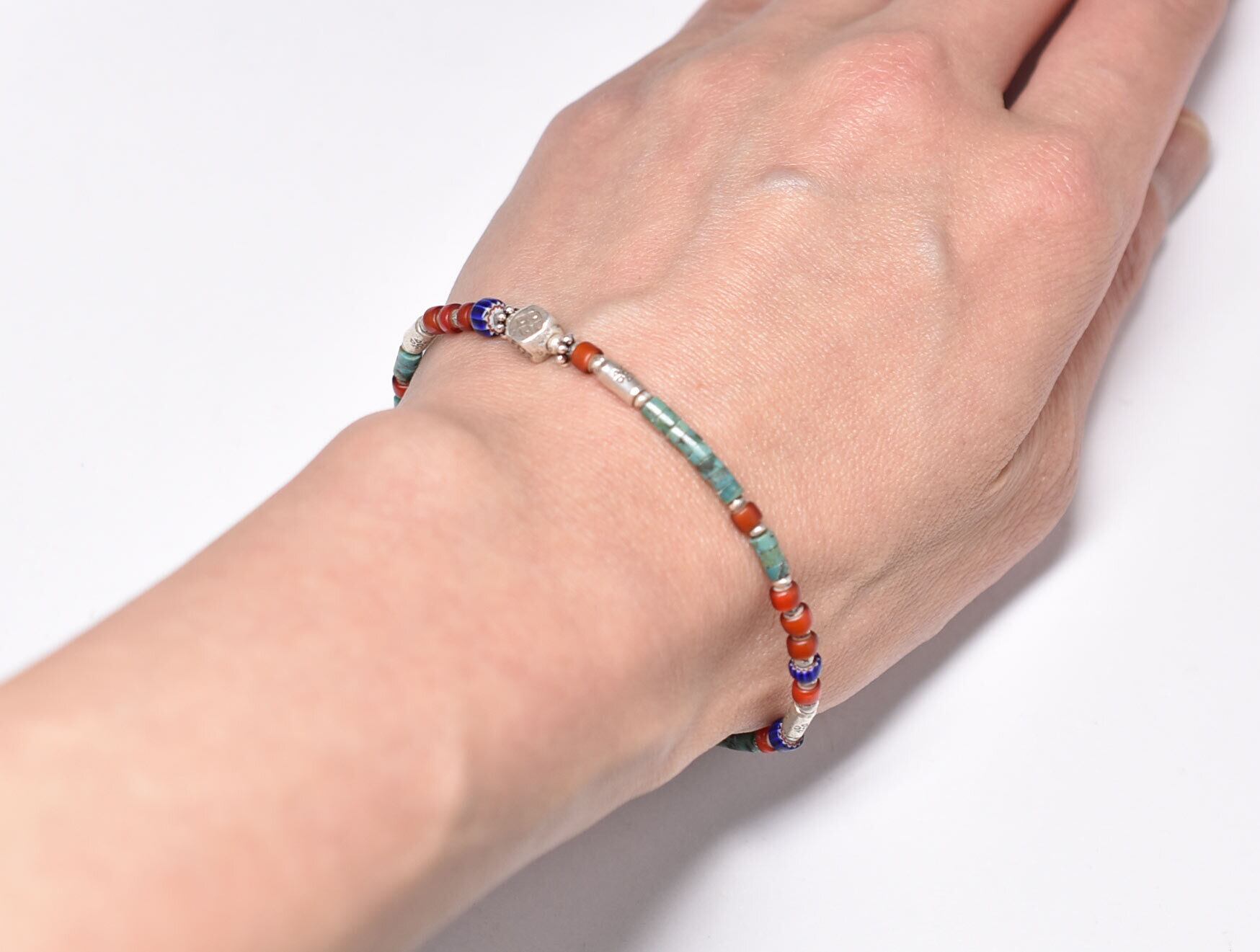 グリーンターコイズと飴色ホワイトハーツ 、ブルーシェブロン、カレンシルバーの華奢なブレス
