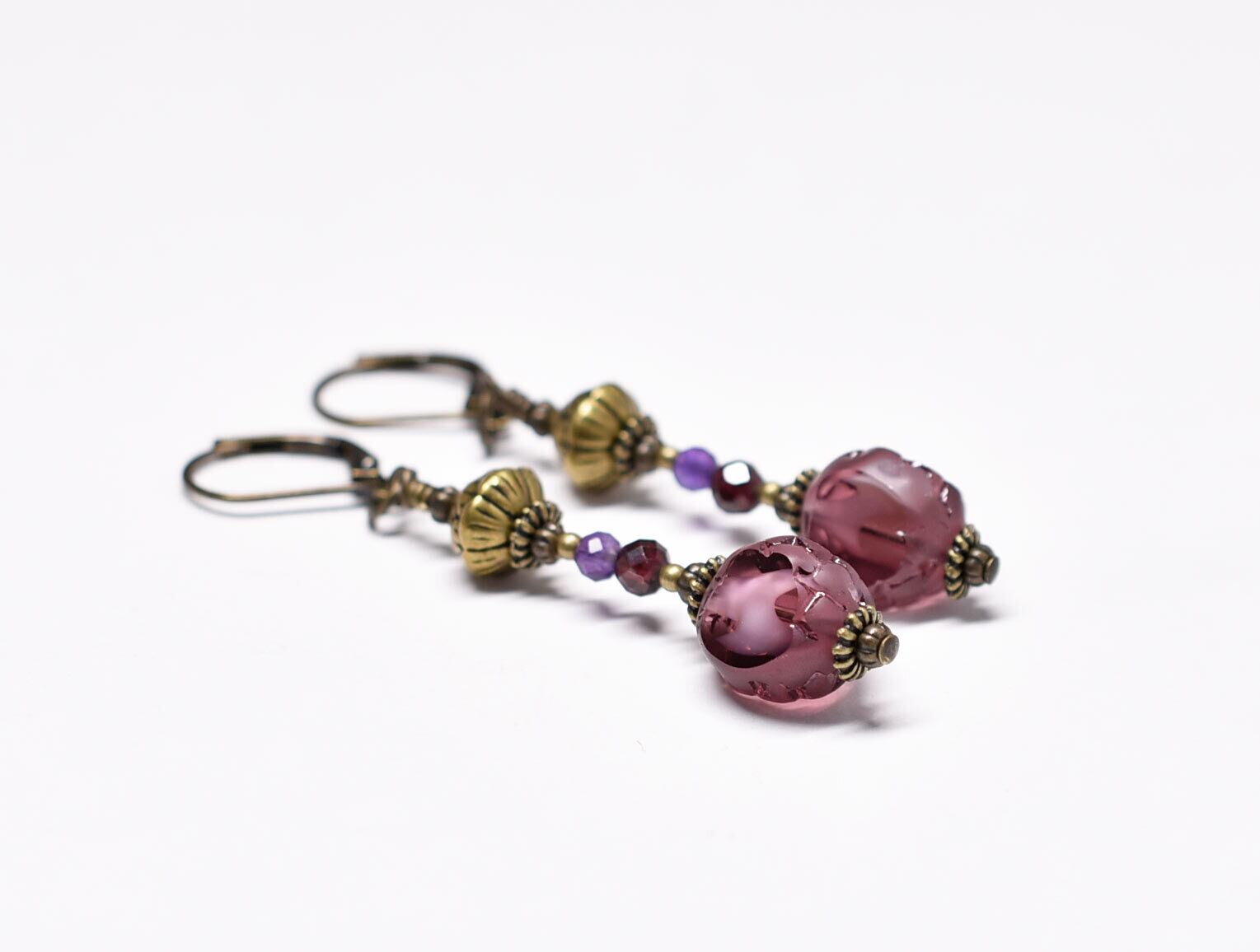 ドイツヴィンテージビーズ、ガーネットとアメジスト、蓮華ブラスのピアス