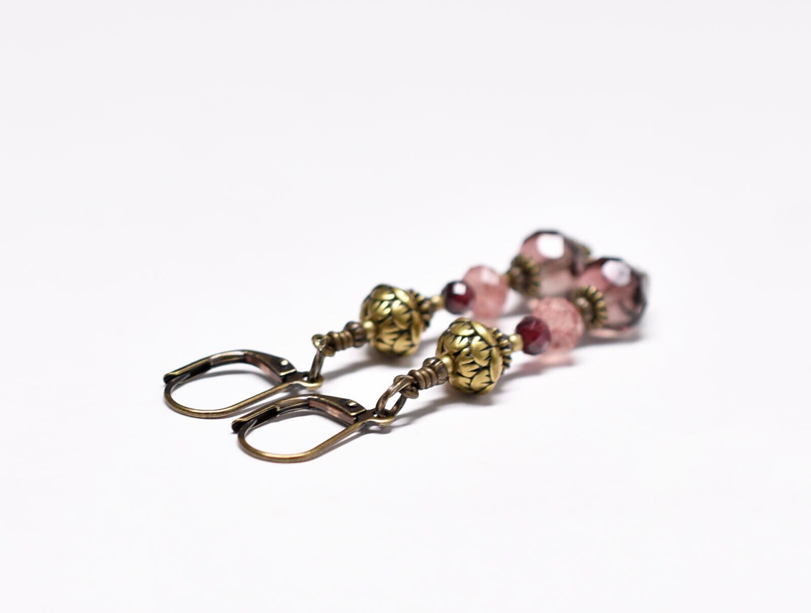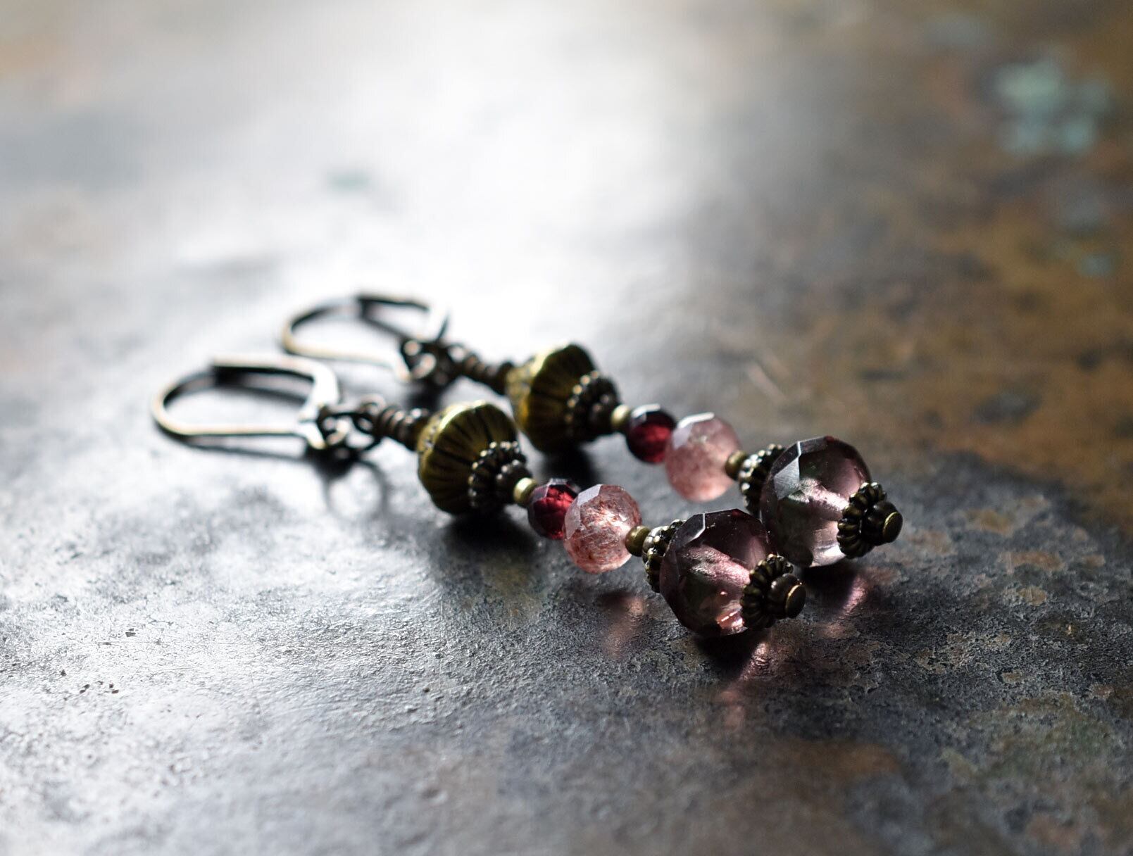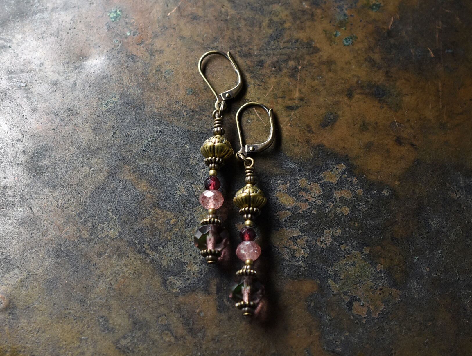 ウランガラスと蓮華ブラス、ストロベリークォーツとガーネットのピアス