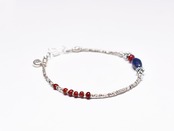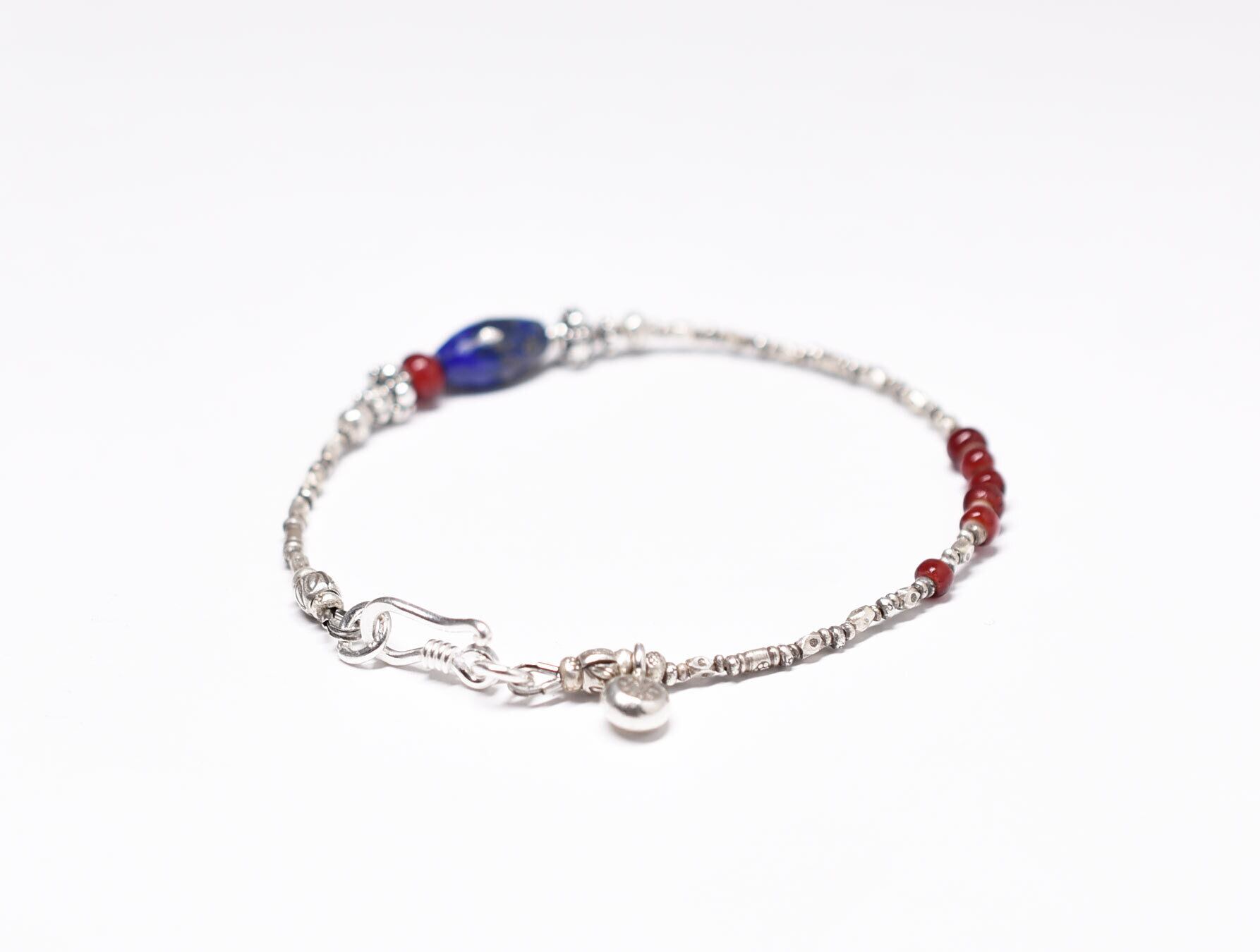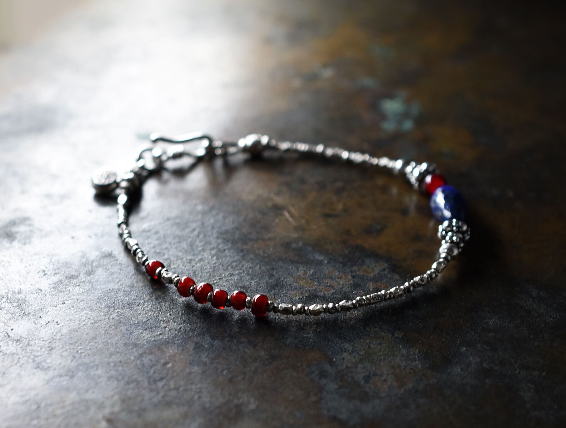 ラピスラズリと濃赤ホワイトハーツ、カレンシルバーなどを繋いだ華奢なブレスです。