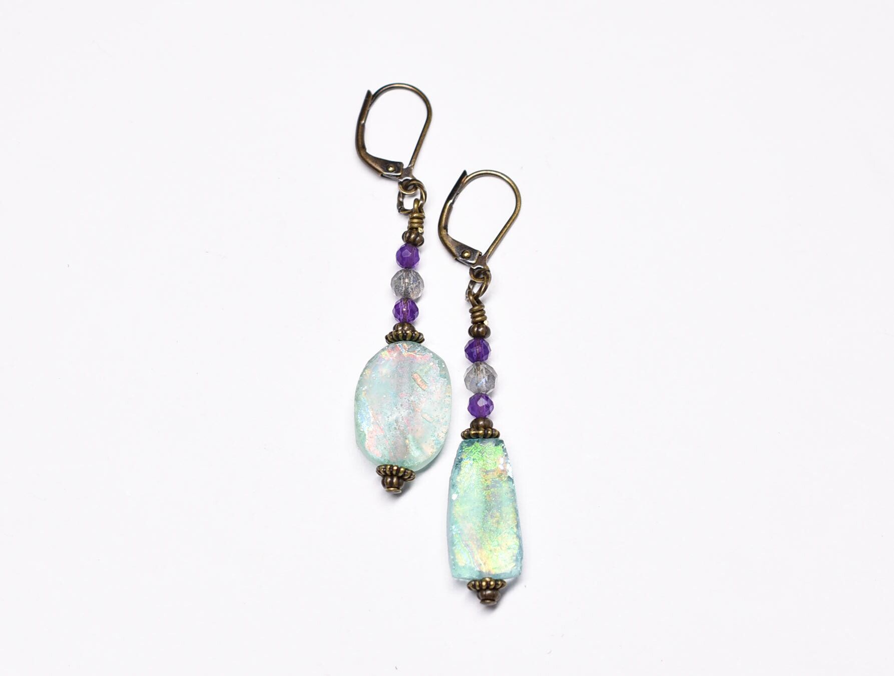ソーダブルー銀化ローマングラスとアメジスト、ラブラドライトを繋いだピアです。