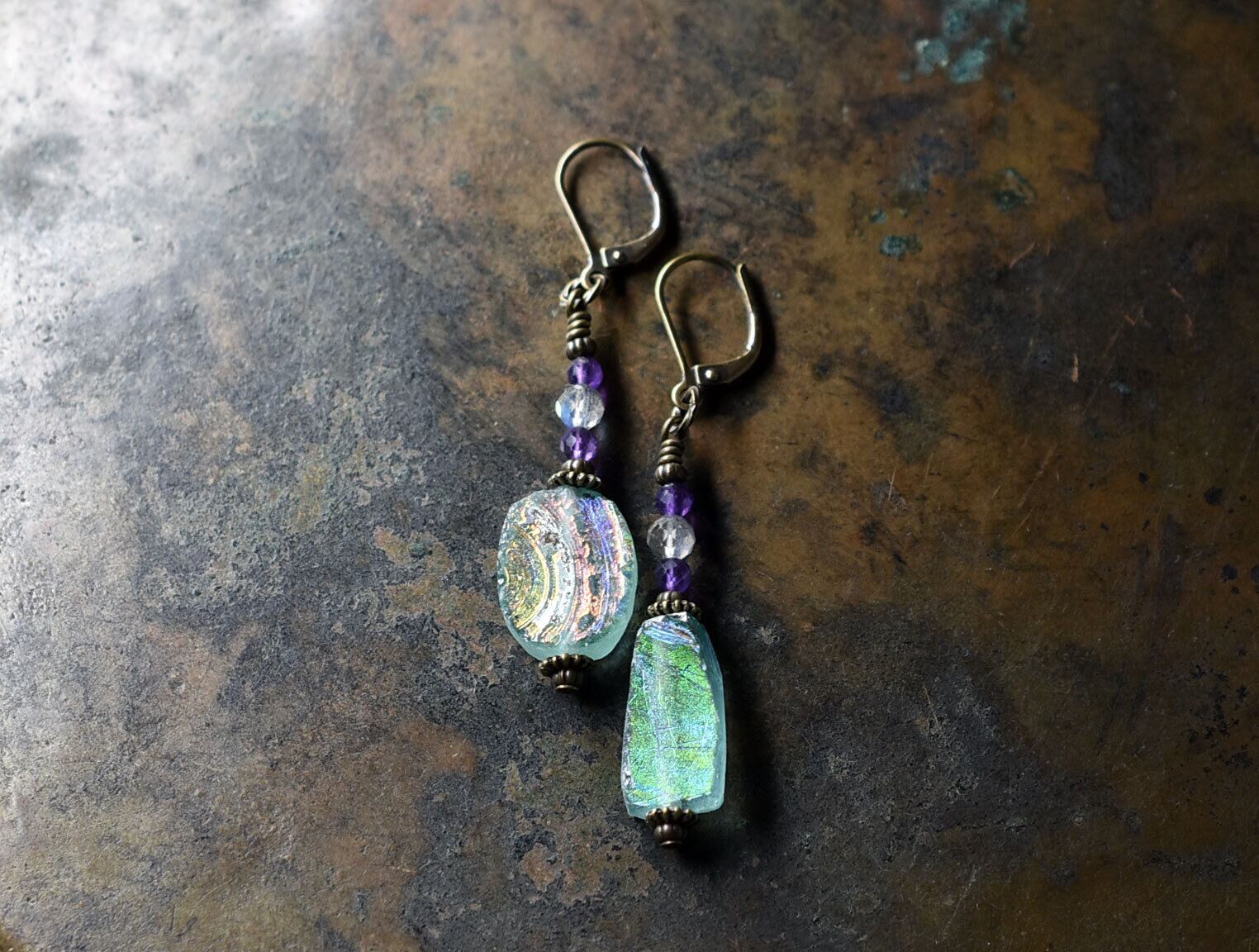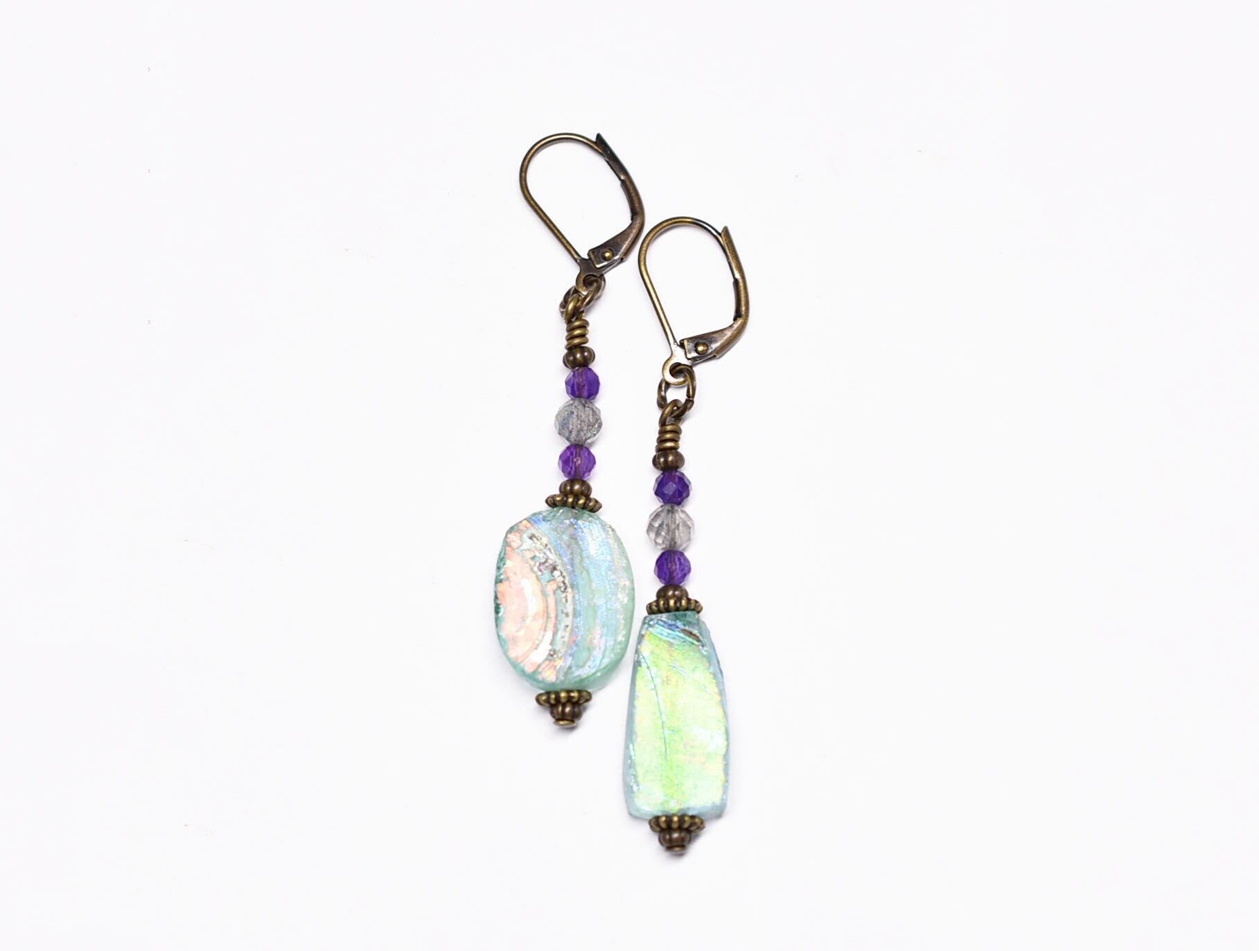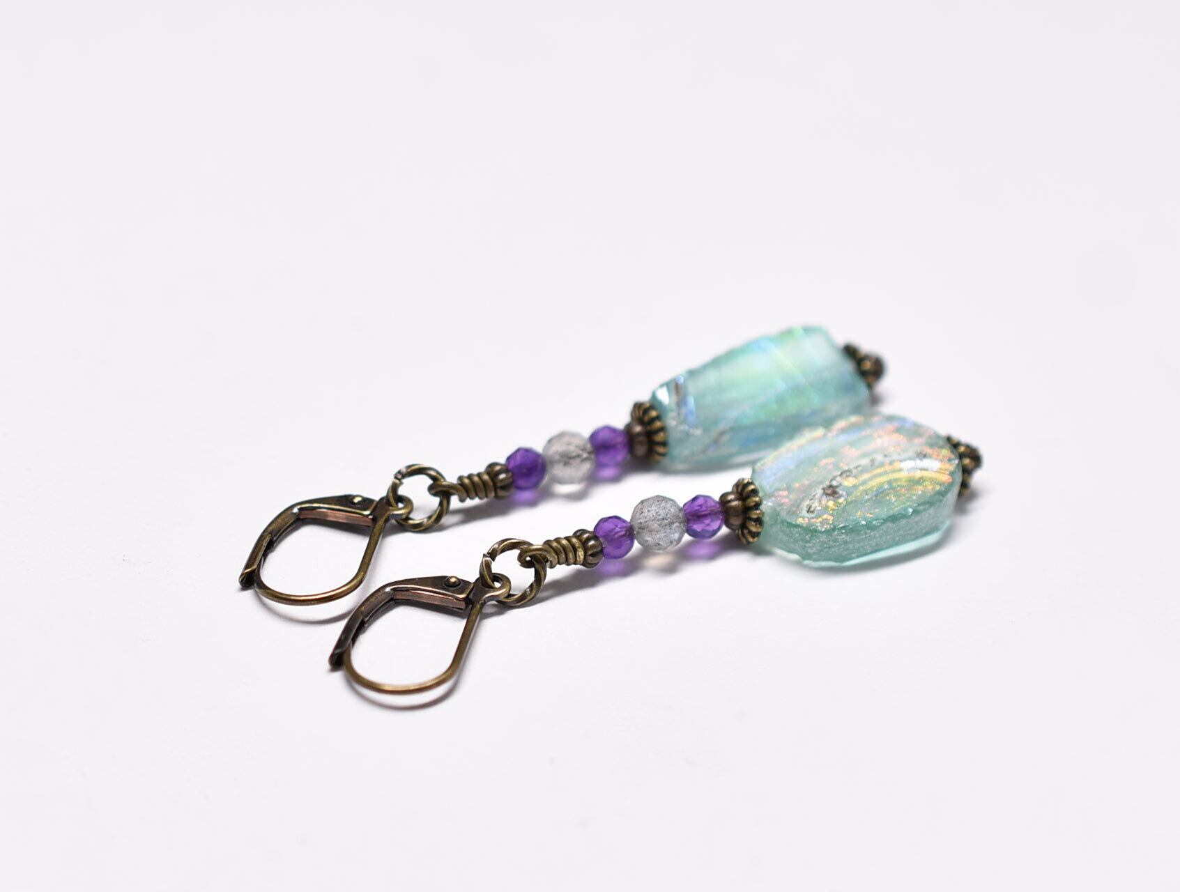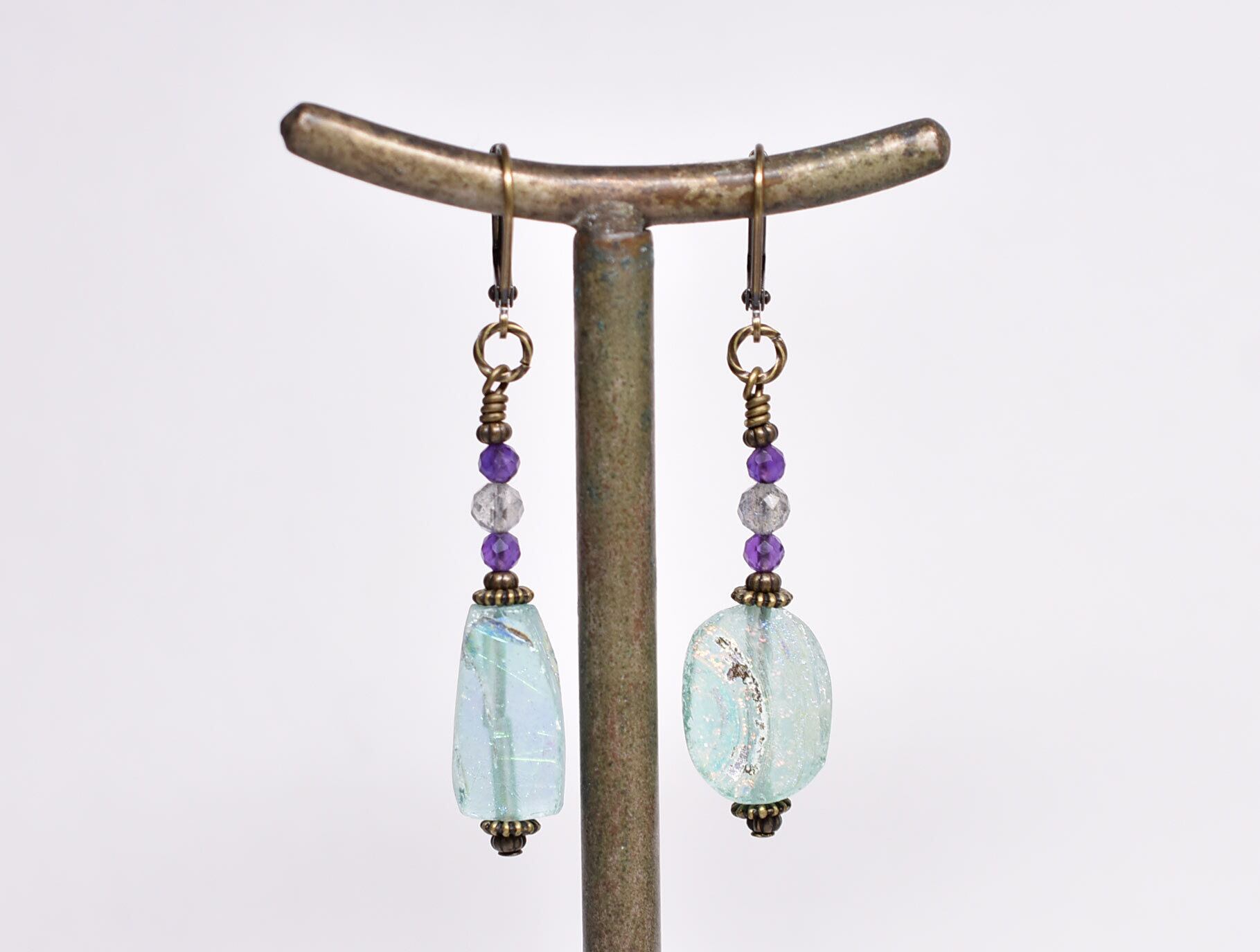 ソーダブルー銀化ローマングラスとアメジスト、ラブラドライトのピアス