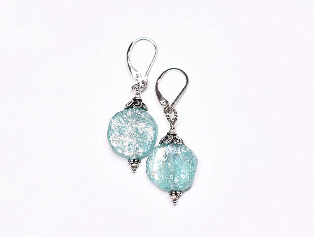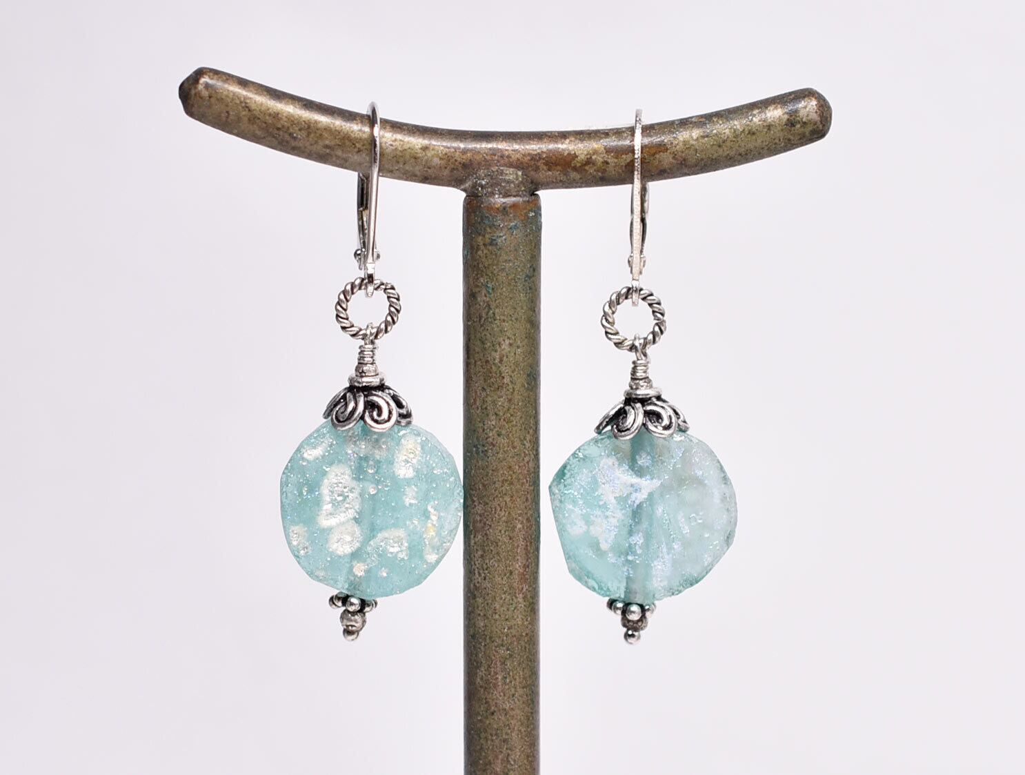 丸いソーダブルー銀化ローマングラスの一粒ピアス