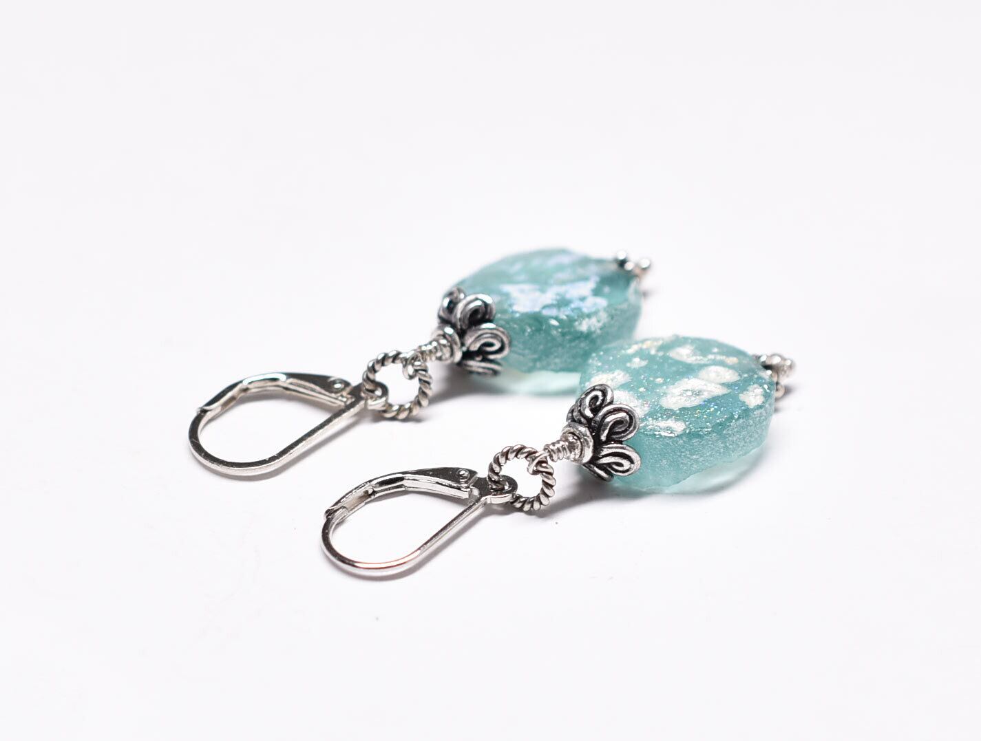 丸いソーダブルー銀化ローマングラスを繋いだ一粒ピアスです。