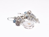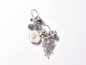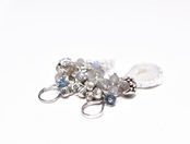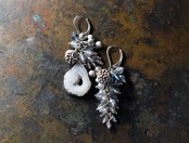 ドゥルジーアゲートとロンドンブルートパーズ、たわわなラブラドライト、カレンシルバーの蕾、インドシルバー鈴を繋いだアンシメトリーなピアスです。