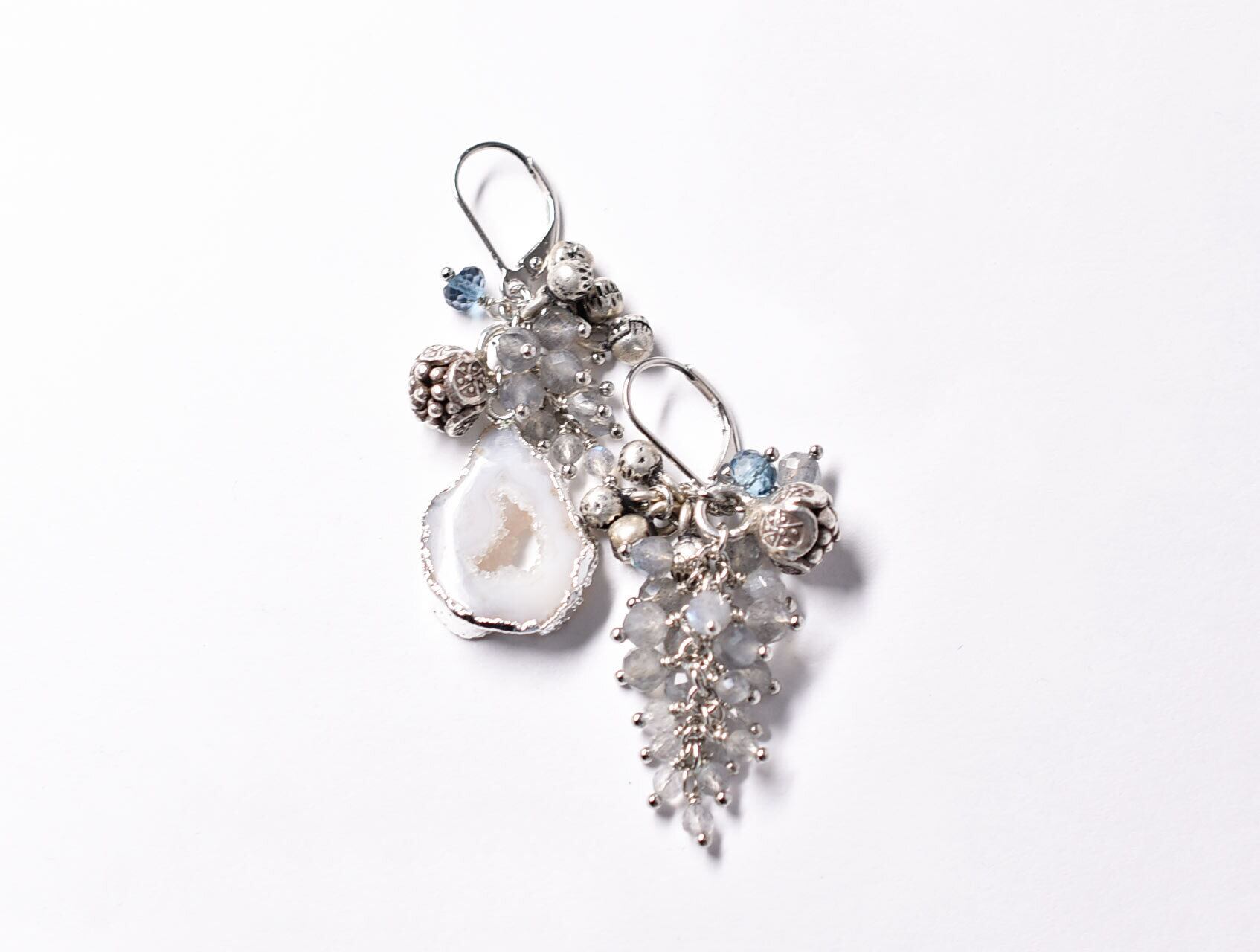 ドゥルジーアゲートとロンドンブルートパーズ、たわわなラブラドライト、カレンシルバーの蕾、インドシルバー鈴のアンシメトリーピアス