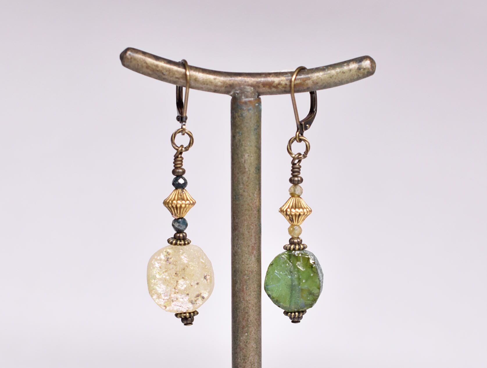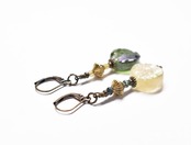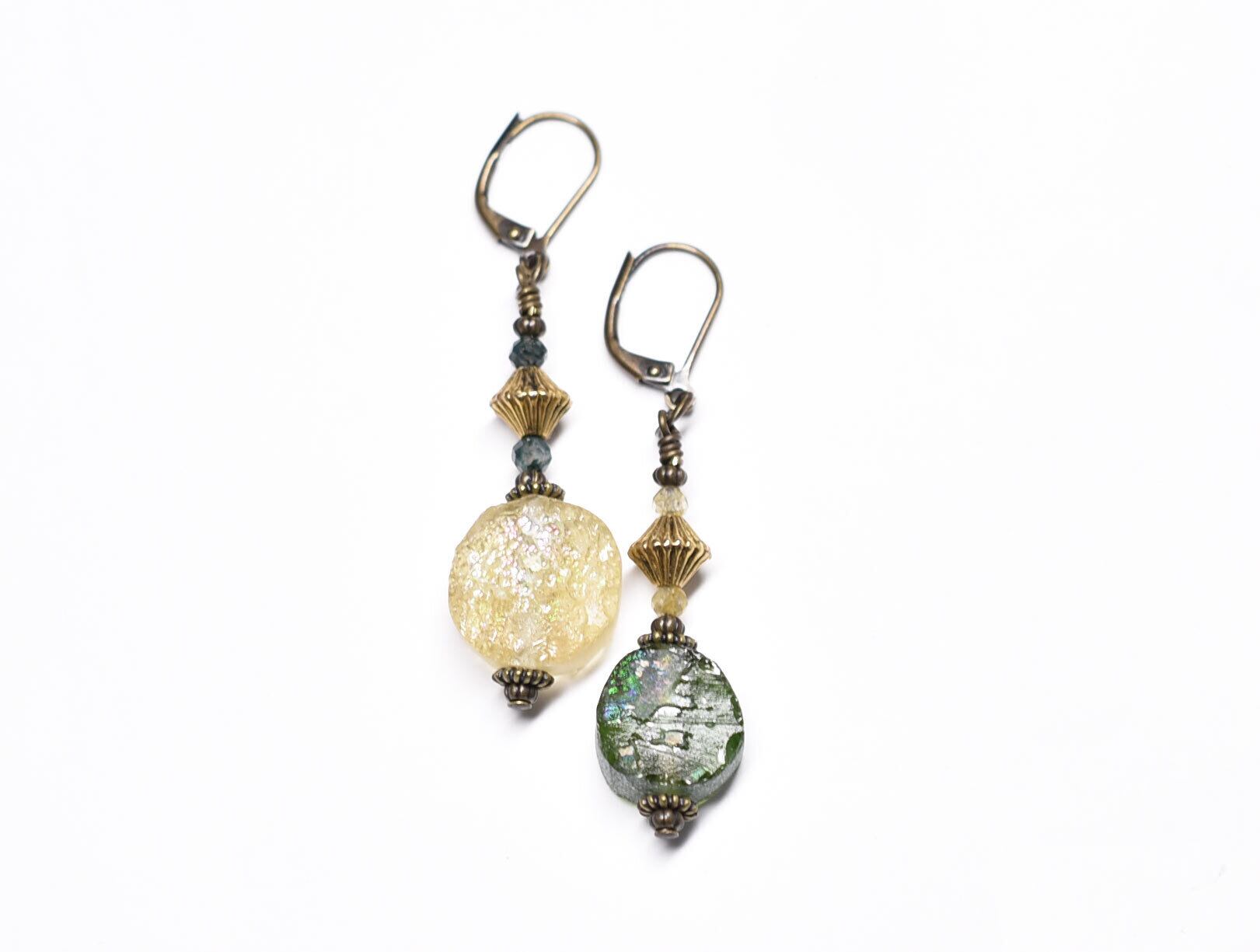オリーブイエロー&グリーン銀化ローマングラスとモスアゲート&ラブラドライト、ヴィンテージブラスのピアス