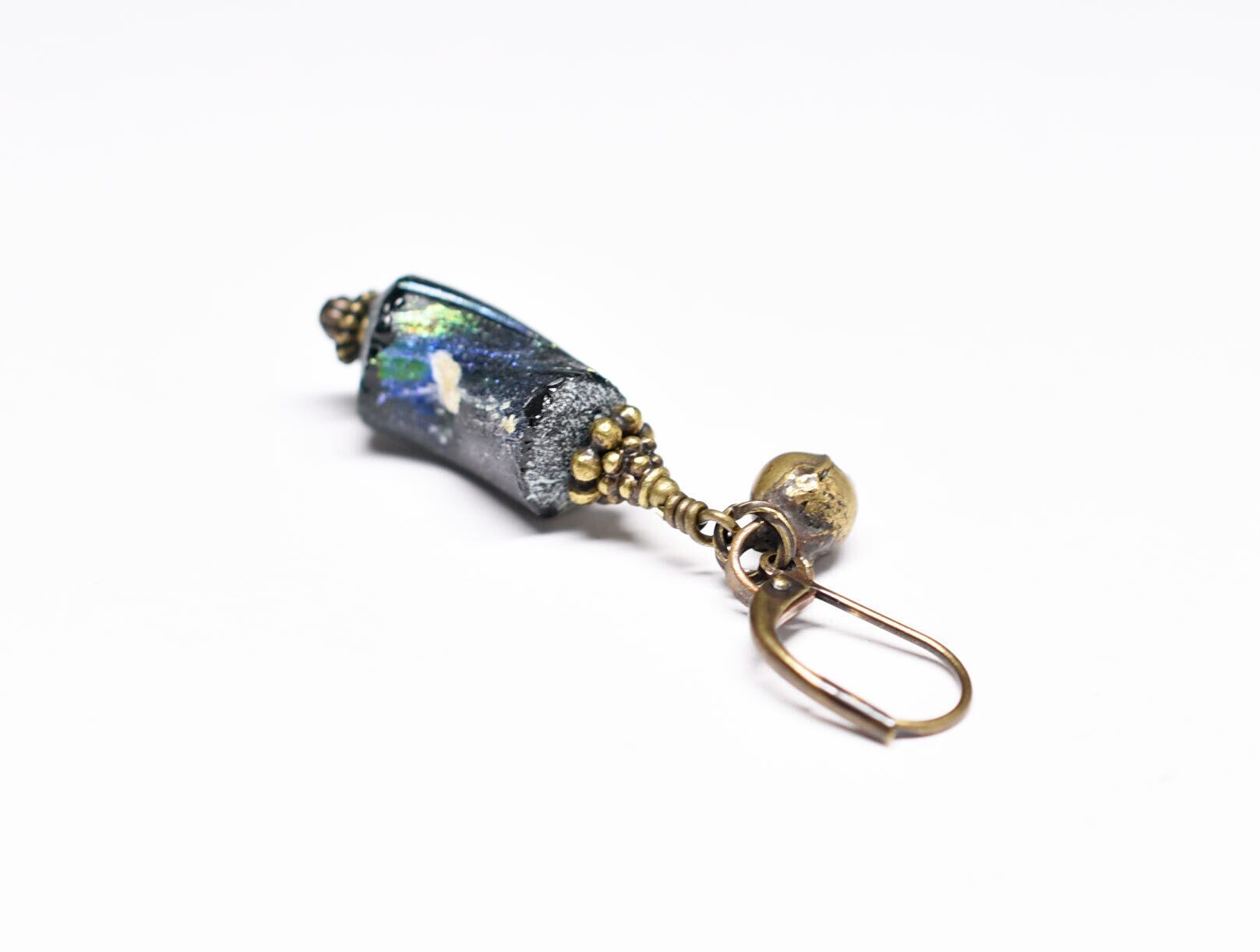 深い色合いのローマングラスに、控えめな銀化の輝きを纏ったピアスです」。