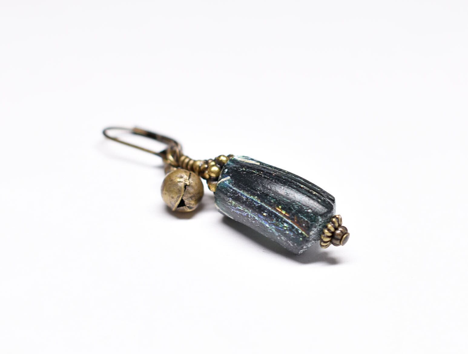 ブルーグリーン筒型銀化ローマングラスと民族鈴を繋いだ片耳のピアスです。