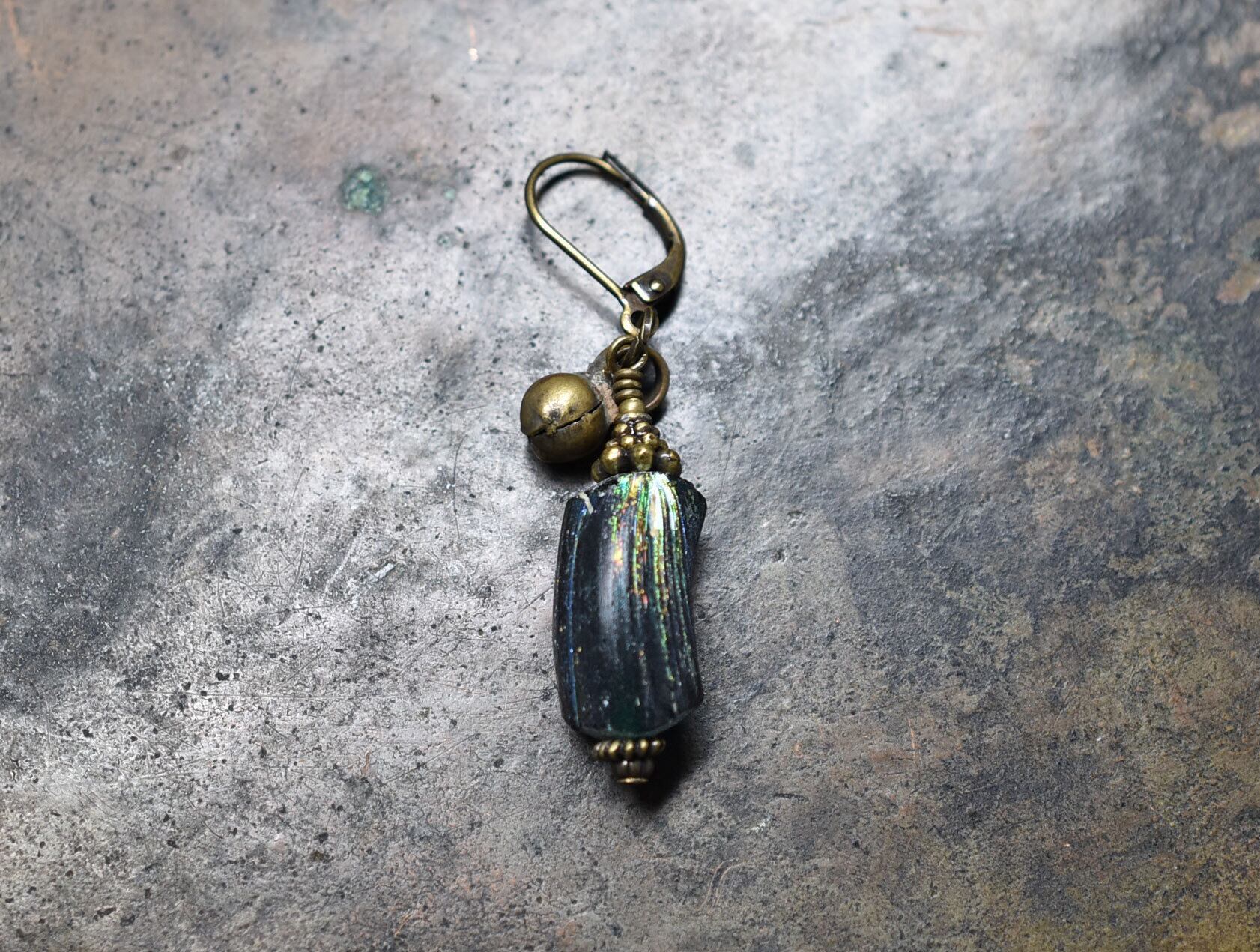 ブルーグリーン筒型銀化ローマングラスと民族鈴の片耳ピアス